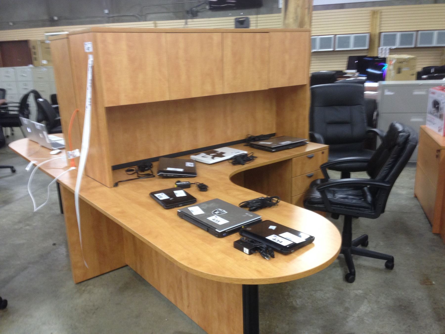 HONEY MAPLE 6' X 6' BULLET TOP L-SHAPE EXECUTIVE DESK WITH HUTCH
