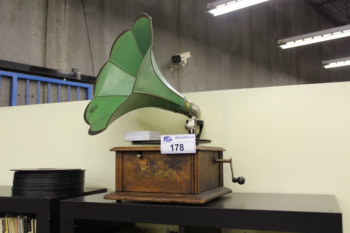 HORNED GRAMOPHONE, ARTINO MACHINE WITH APPROX. 40 ORIGINAL RECORDS, ALL IN ORIGINAL CONDITION