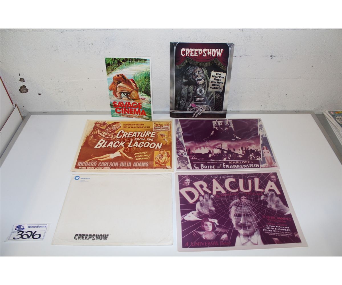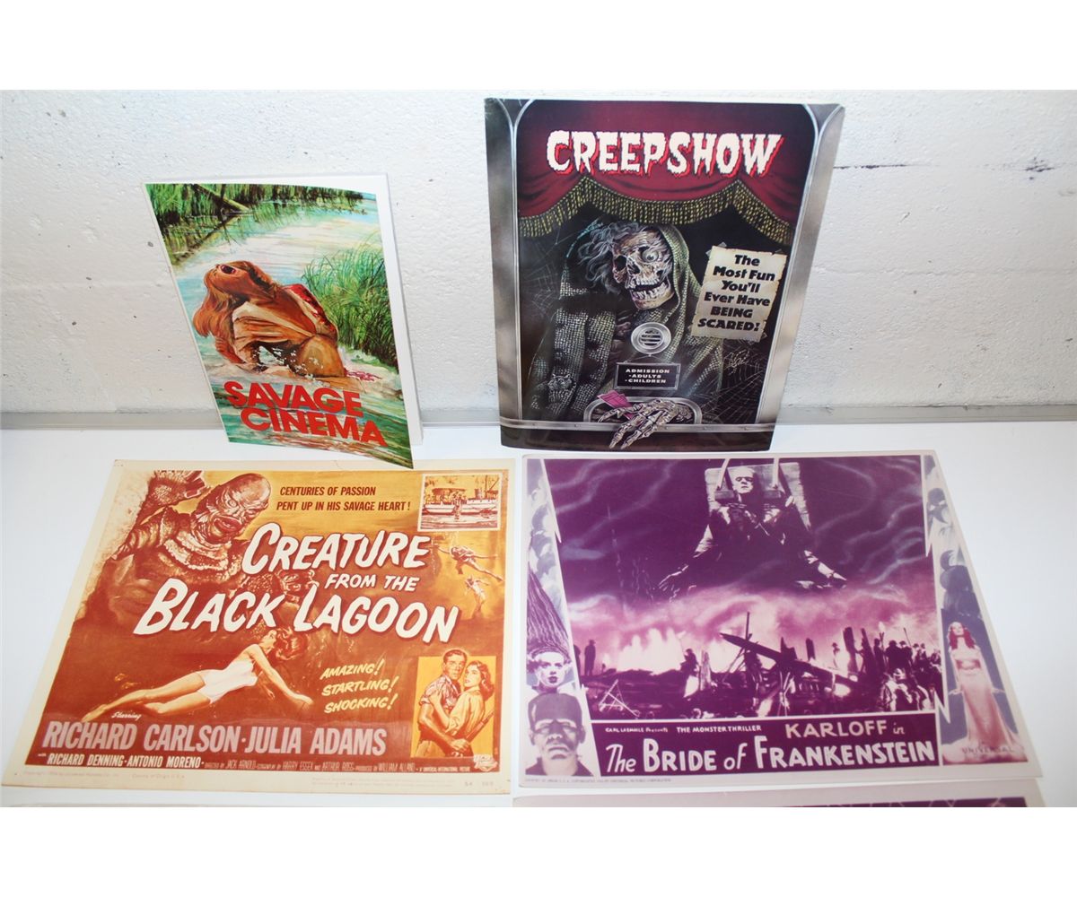 HORROR PRESSKIT & PRINTS MOVIE LOT. INCLUDES CREEPSHOW PRESSKIT WITH 8 B &W GLOSSY PHOTOS, PRODUCTION NOTES, ETC. , BRIDE OF FRANKENSTEIN, CREATURE FROM THE BLACK LAGOON & DRACULA GLOSSY PRINTS & SAVAGE CINEMA (1975) SC BOOK - AN ESSAY ON VIOLENCE IN MOVIES WITH MANY CLASSIC PHOTOS. NEAT LOT!