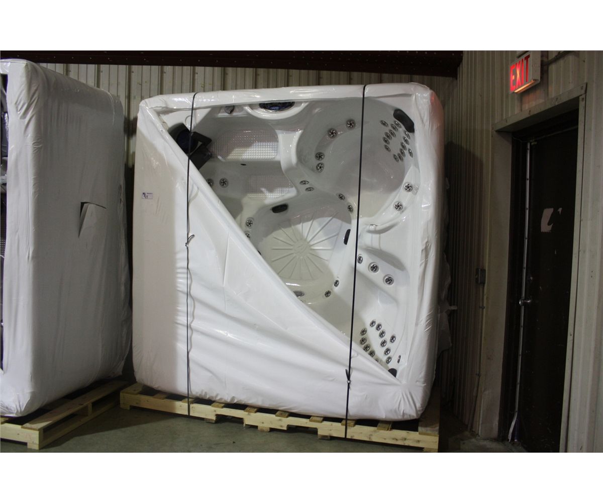 HOT TUB - BENCH SEATING, 90SS JETS, SNOW WHITE, SMOKE CABINET, GATE VALVES, THERMO LAYER CABINET, 3X5.0HP PUMPS, 3 PILLOWS 100X100 90X90X39.5 CAB L-S11-FA890B-S-11-000769 RETAIL $9,625.00
