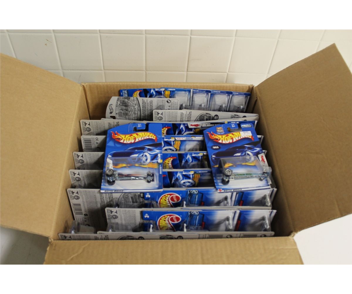 HOT WHEELS FACTORY BOX CONTAINING 50 MINT ON BOARD DRAGSTER, MO-SCOOT, OUTSIDER, ETC.