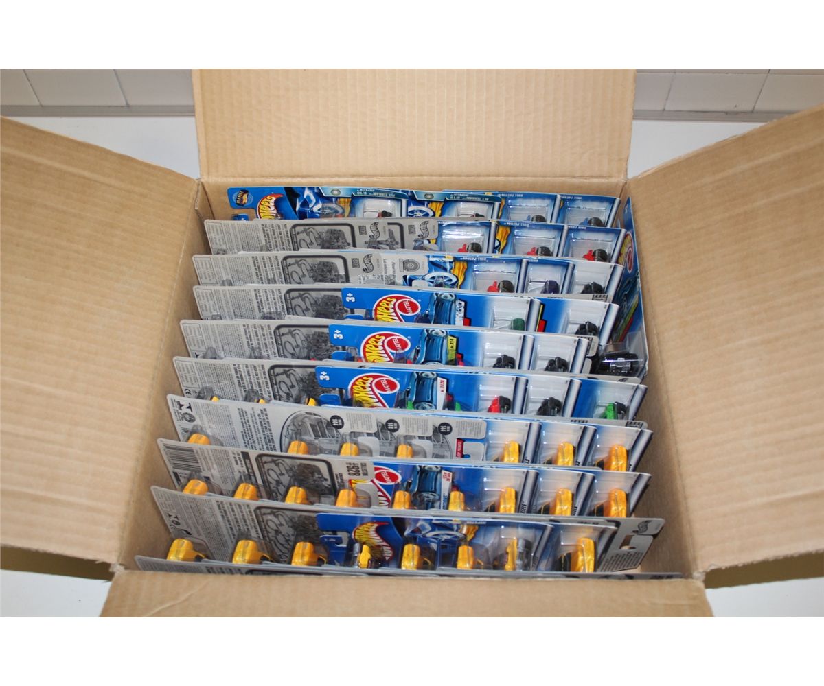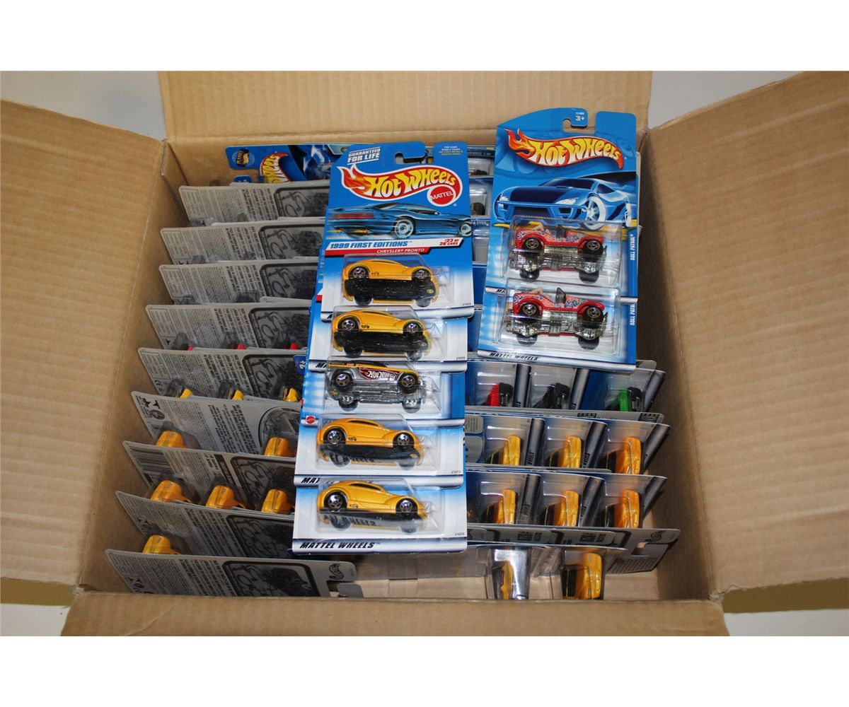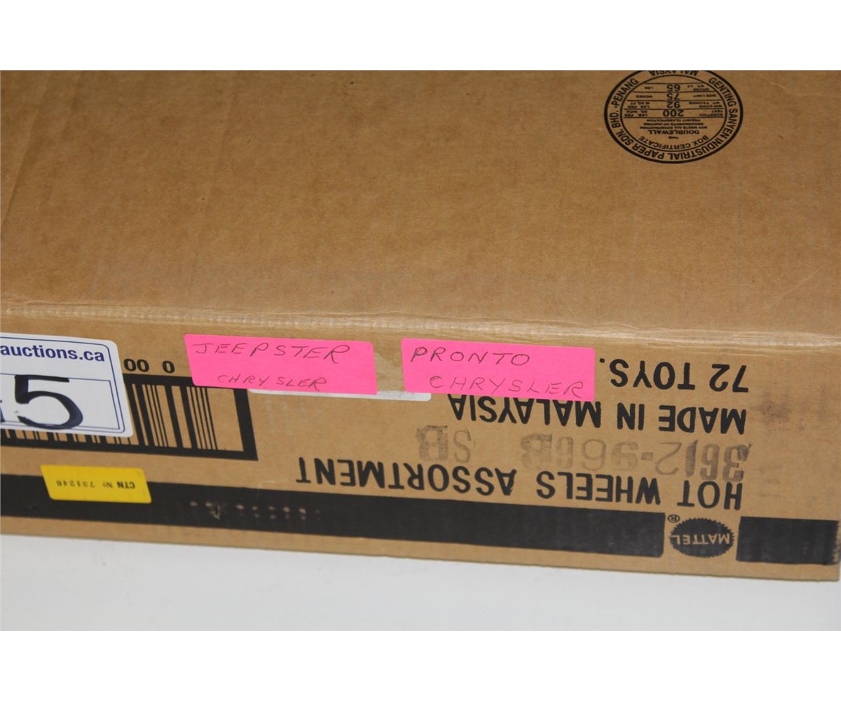HOT WHEELS FACTORY BOX CONTAINING 70+ MINT ON BOARD CARS INCLUDING: PRONTO CHRYSLER, JEEPSTER ETC.