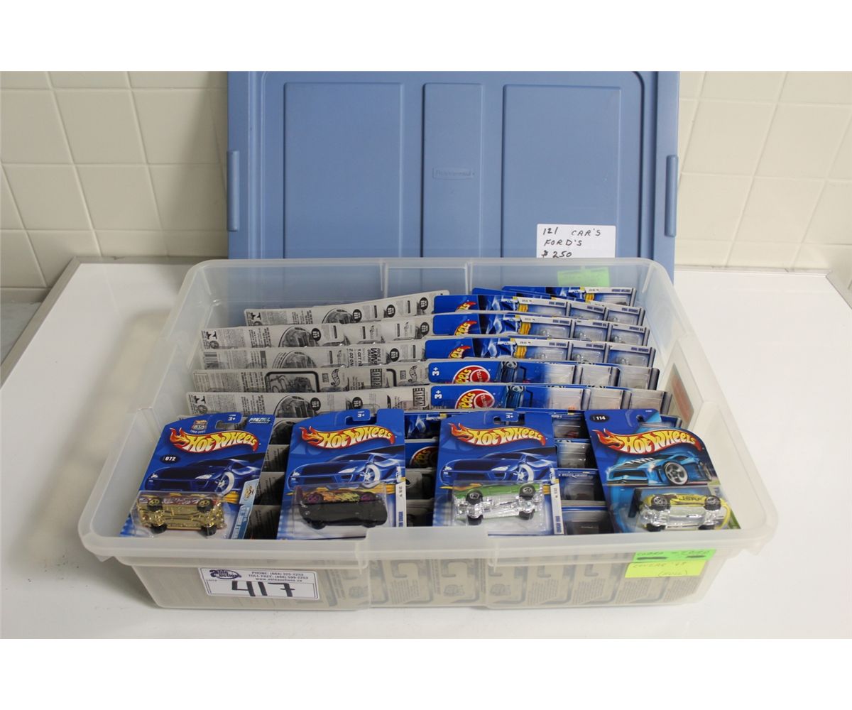 HOT WHEELS RUBBERMAID CONTAINING 120+ MINT ON BOARD FORD CARS INCLUDING COBRA, T-BIRD ETC.