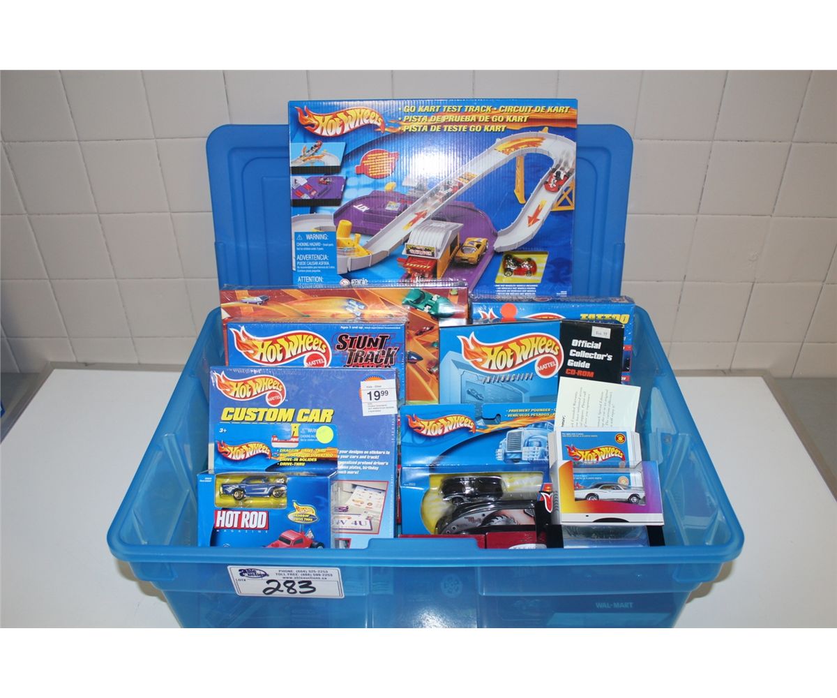 HOT WHEELS RUBBERMAID CONTAINING ASSORTED TOYS, NEW IN BOX INCLUDING: TATOO DESIGNER CD ROM, CUSTOM CAR DESIGNER, GO KART TEST TRACK AND MORE!