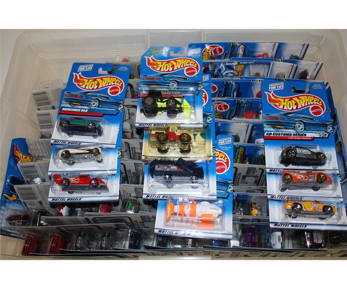 HOT WHEELS RUBBERMAID CONTAINING OVER 100 DIFFERENT CARS, TRACTORS ETC,. MINT ON BOARD