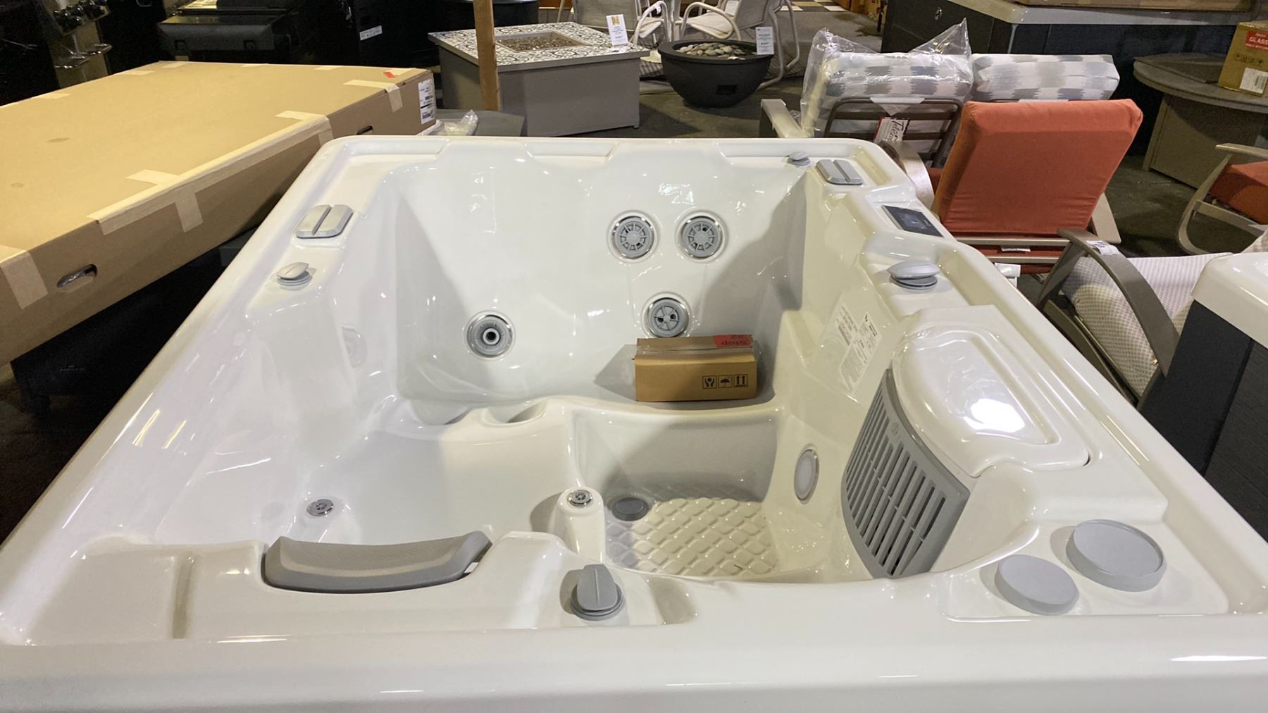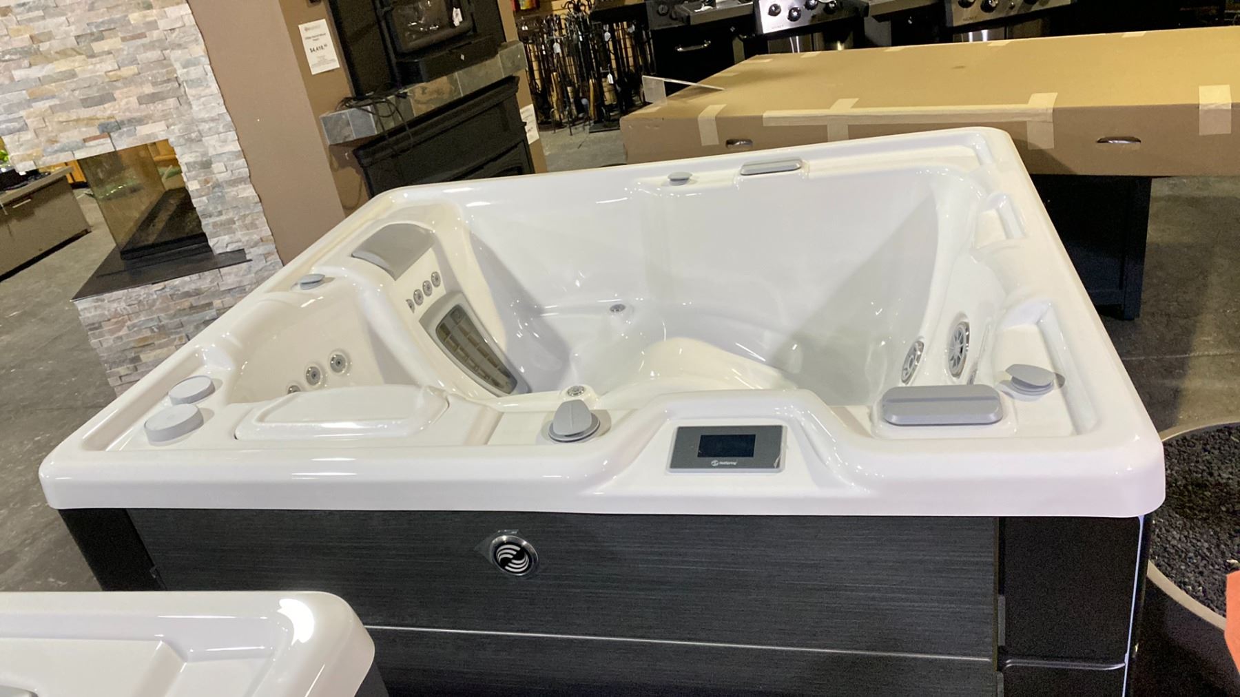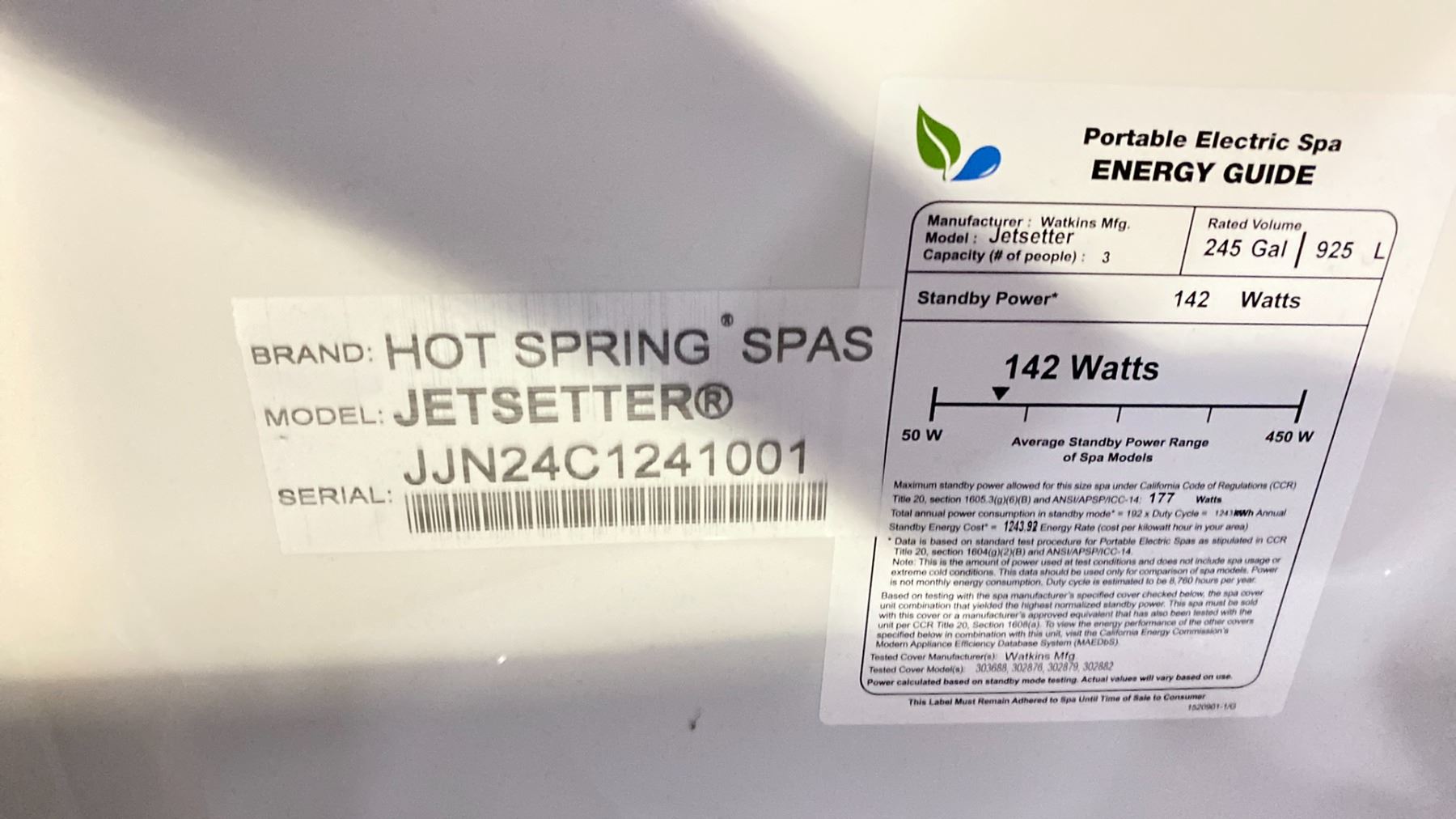 HOTSPRING PORTABLE SPAS JETSETTER. ALPINE WHITE ACRYLIC/BLACKWOOD CABINET, FRESHWATER IQ WATER CARE AND SALT SYSTEM, SEATING FOR 3 ADULTS, 7'X5'8"X33", 950 LITERS, 100% NO BYPASS FILTRATION, LUMINESCENCE MULTI-COLOR LIGHTING, INC COVER AND 50 AMP BREAKER