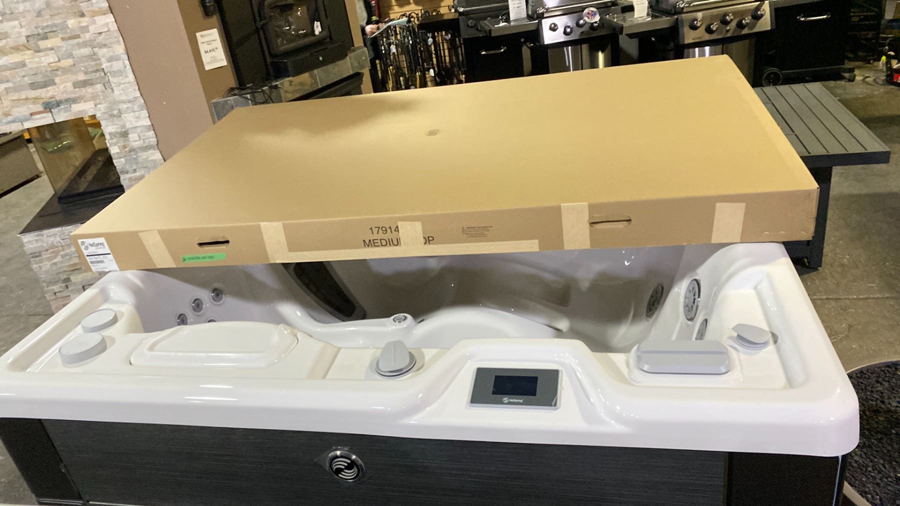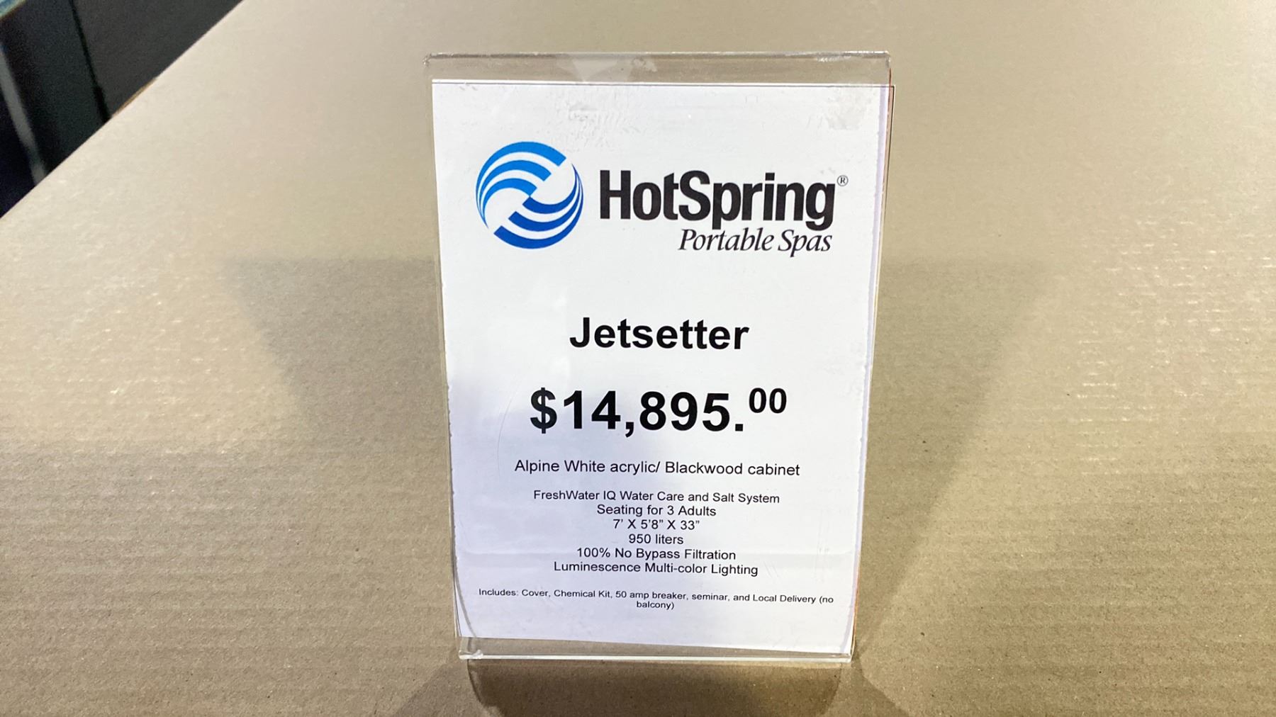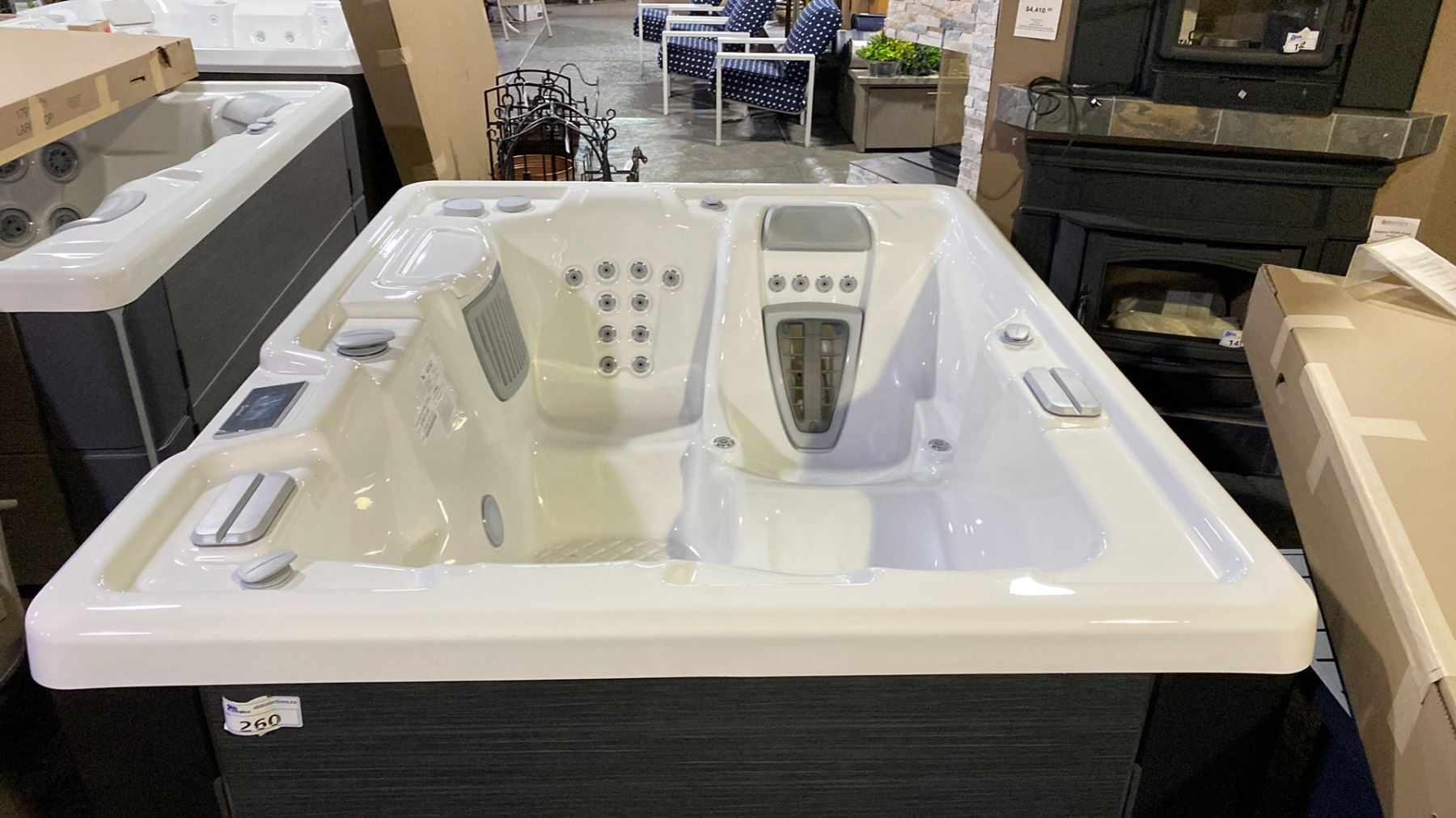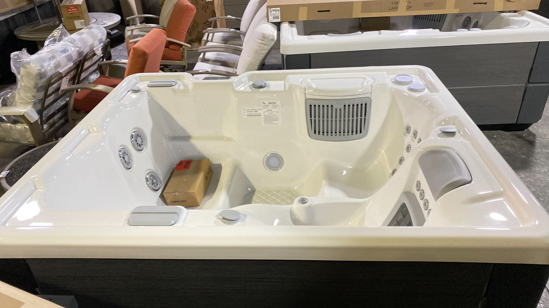 HOTSPRING PORTABLE SPAS JETSETTER. ALPINE WHITE ACRYLIC/BLACKWOOD CABINET, FRESHWATER IQ WATER CARE AND SALT SYSTEM, SEATING FOR 3 ADULTS, 7'X5'8"X33", 950 LITERS, 100% NO BYPASS FILTRATION, LUMINESCENCE MULTI-COLOR LIGHTING, INC COVER AND 50 AMP BREAKER