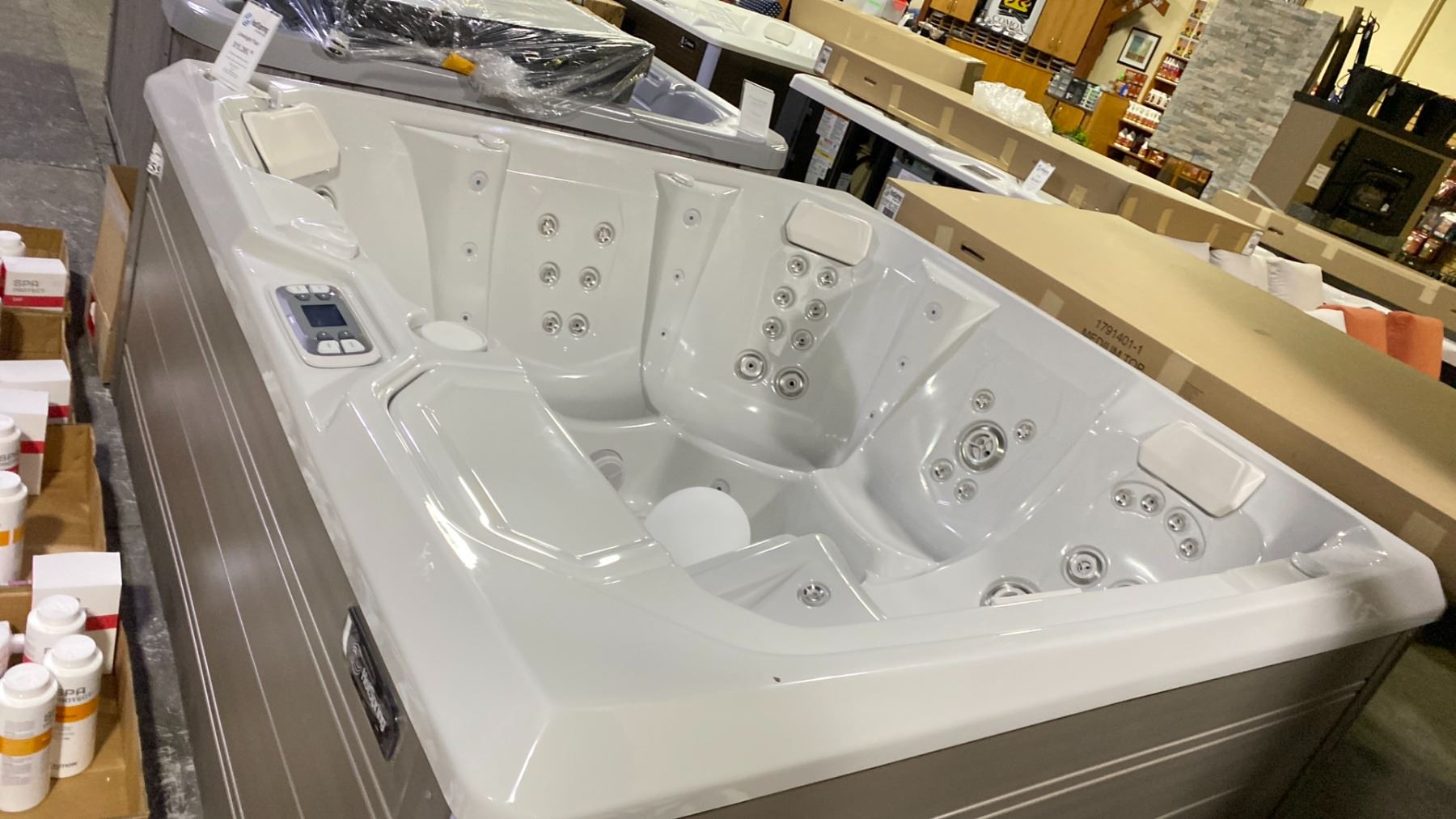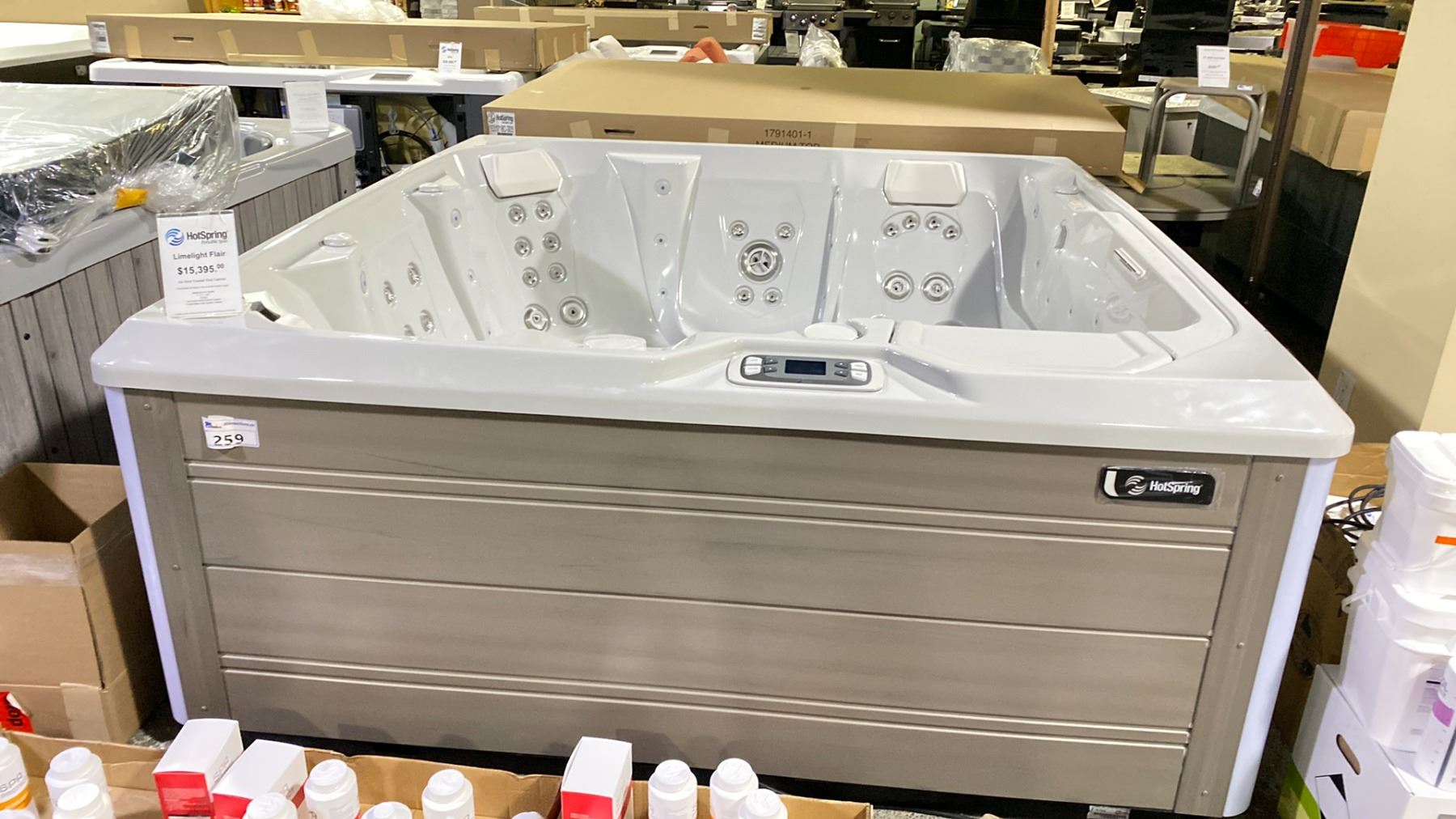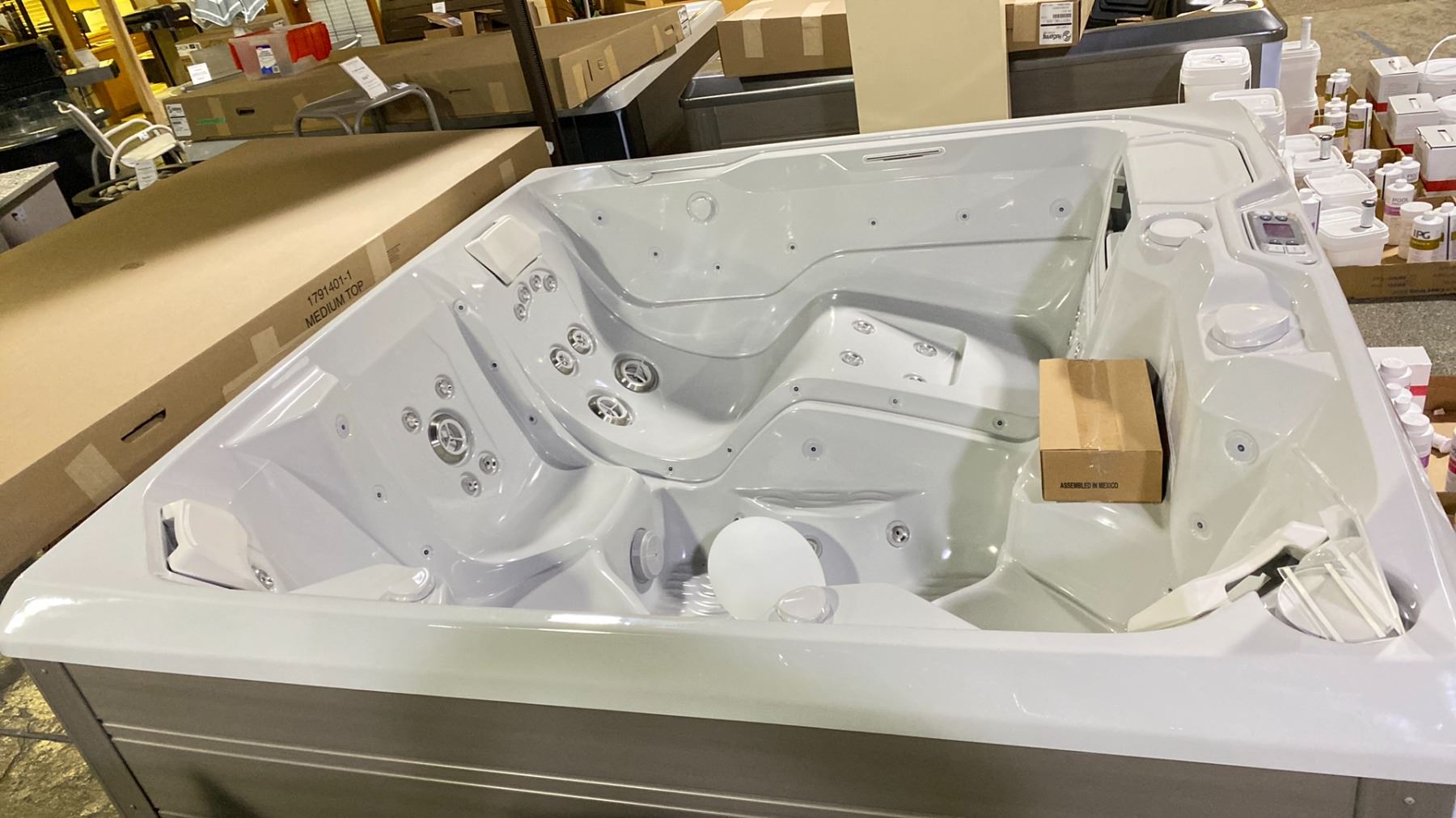 HOTSPRING PORTABLE SPAS LIMELIGHT FLAIR. ICE GREY/COASTAL CREY CABINET. FRESHWATER IQ WATER CARE AND SALT SYSTEM READY, SEATING FOR 6 ADULTS, 7X7'X36", 930 LBS, NO-FAULT 4000W/230V HEATER. INC COVER