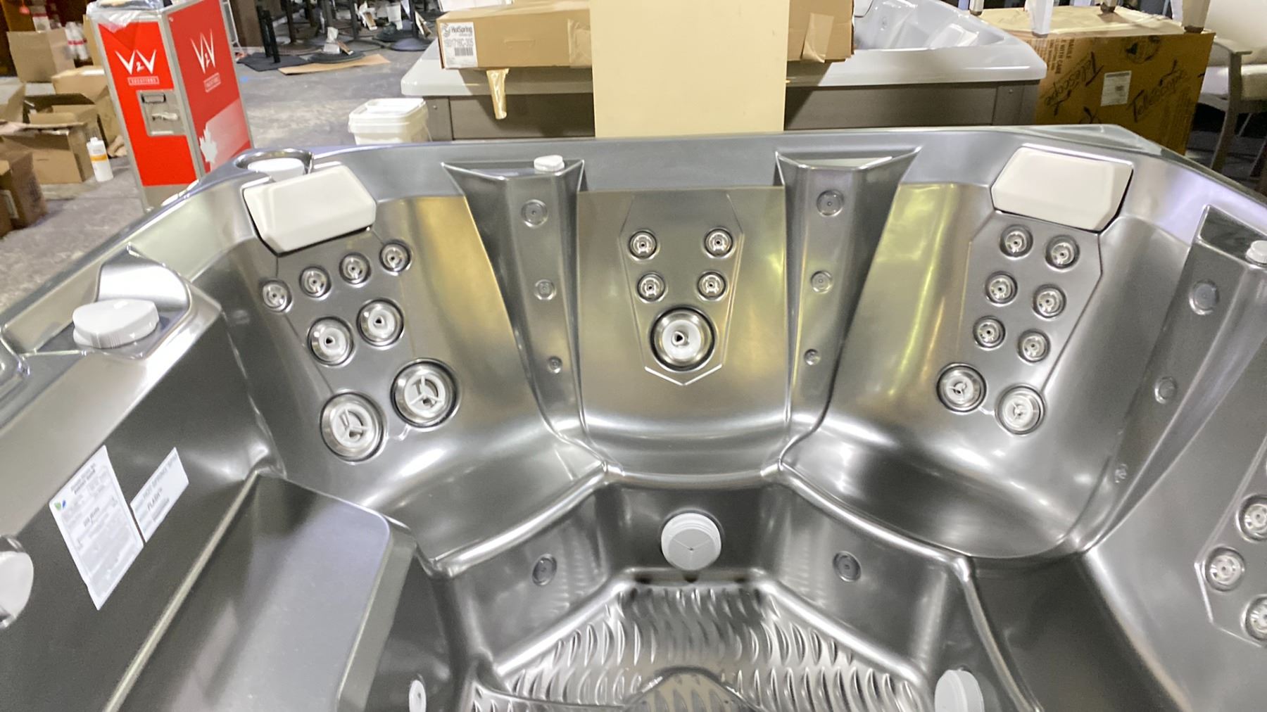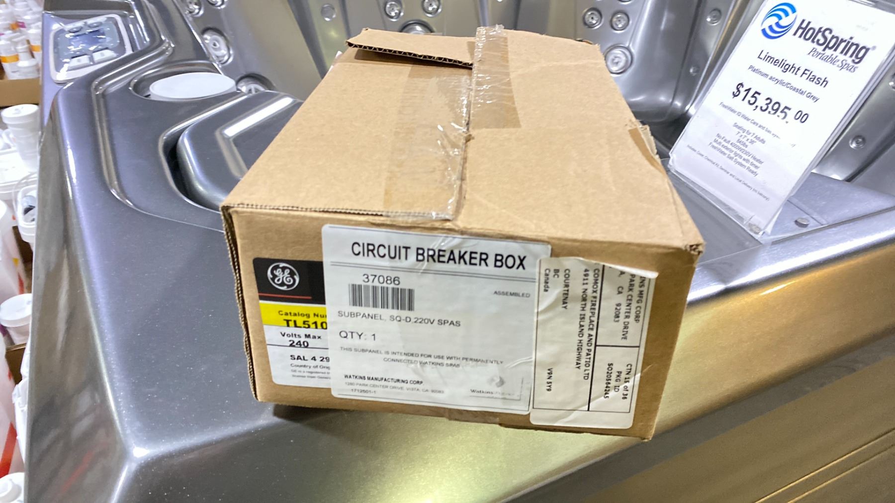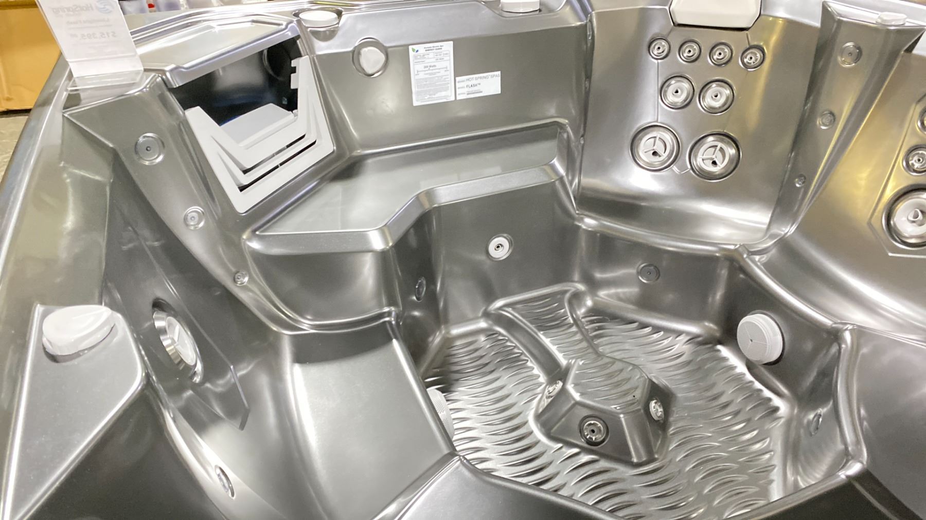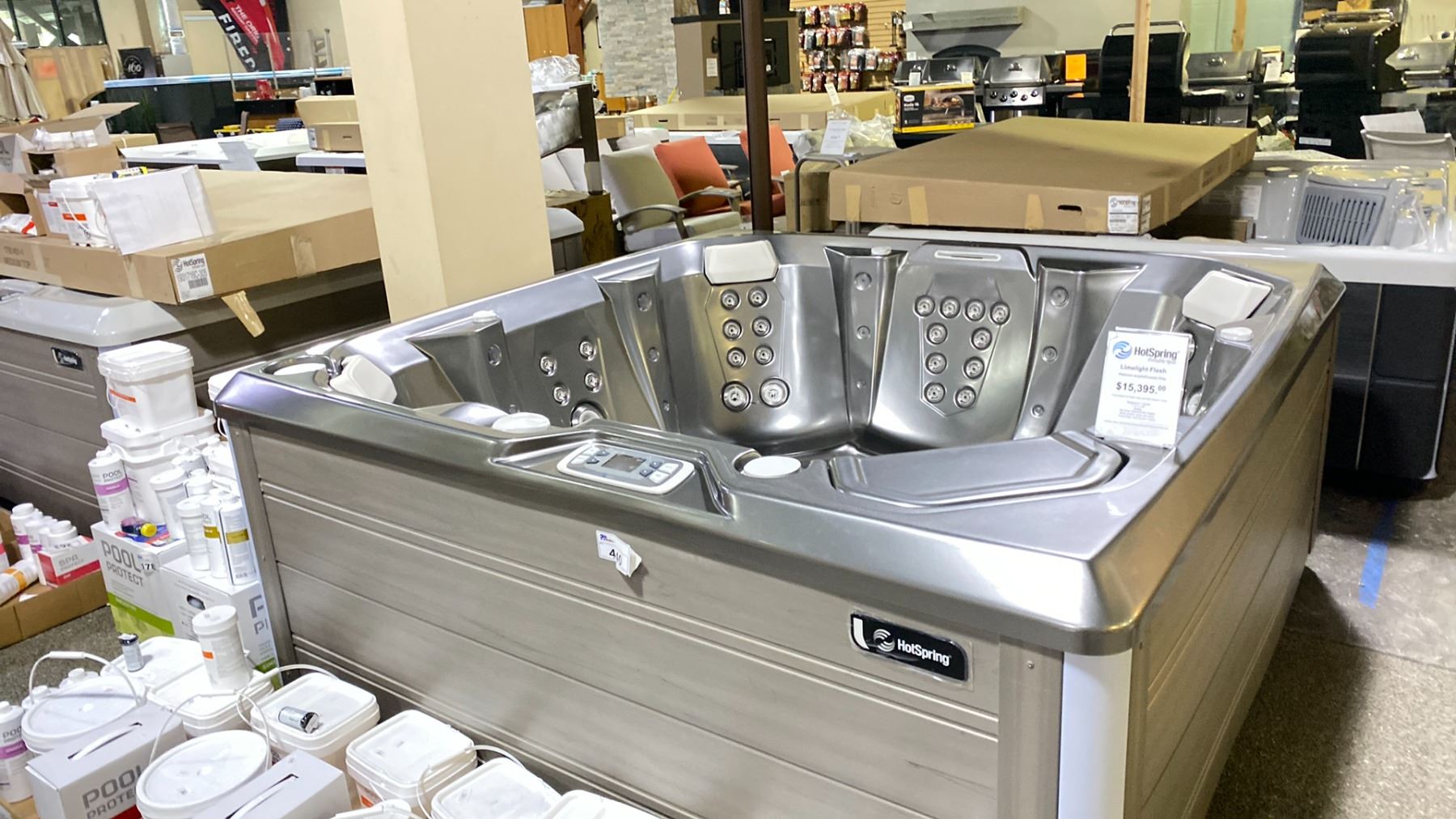 HOTSPRING PORTABLE SPAS LIMELIGHT FLASH HOT TUB. PLATINUM ACRYLIC/COASTAL GREY. WITH FRESHWATER IQ WATER CARE AND SALT SYSTEM READY, SEATING FOR 7 ADULTS, 7X7'X36", 845 LBS, NO-FAULT 4000W/230V HEATER, MULTI EXTERIOR LIGHTS WITH TIMER, FRESHWATER SALT SYSTEM READY, INC COVER