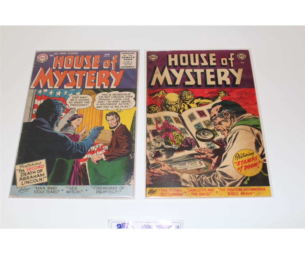 HOUSE OF MYSTERY #23 & 51 (1954-56) 2 GOLDEN AGE DC HORROR CLASSICS. LOW TO LOWER MID GRADE, COVERS ATTACHED, COMPLETE, SOLID COPIES.