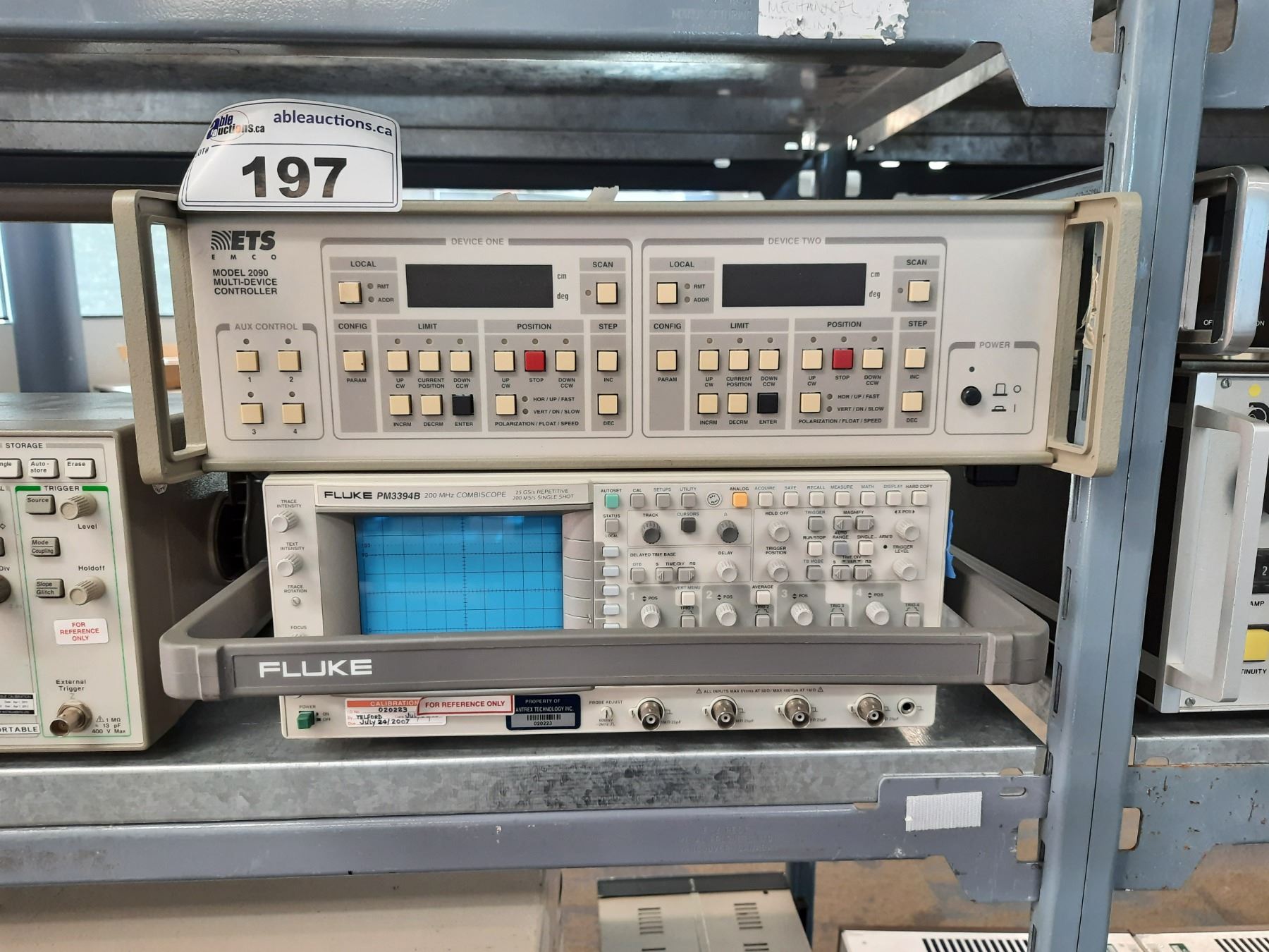 HP 54645A MEGA ZOOM 100 MHZ OSCILLOSCOPE, FLUKE PM3394B 200 COMBISCOPE AND ETS EMCO 2090 MULTI-DEVICE CONTROLLER