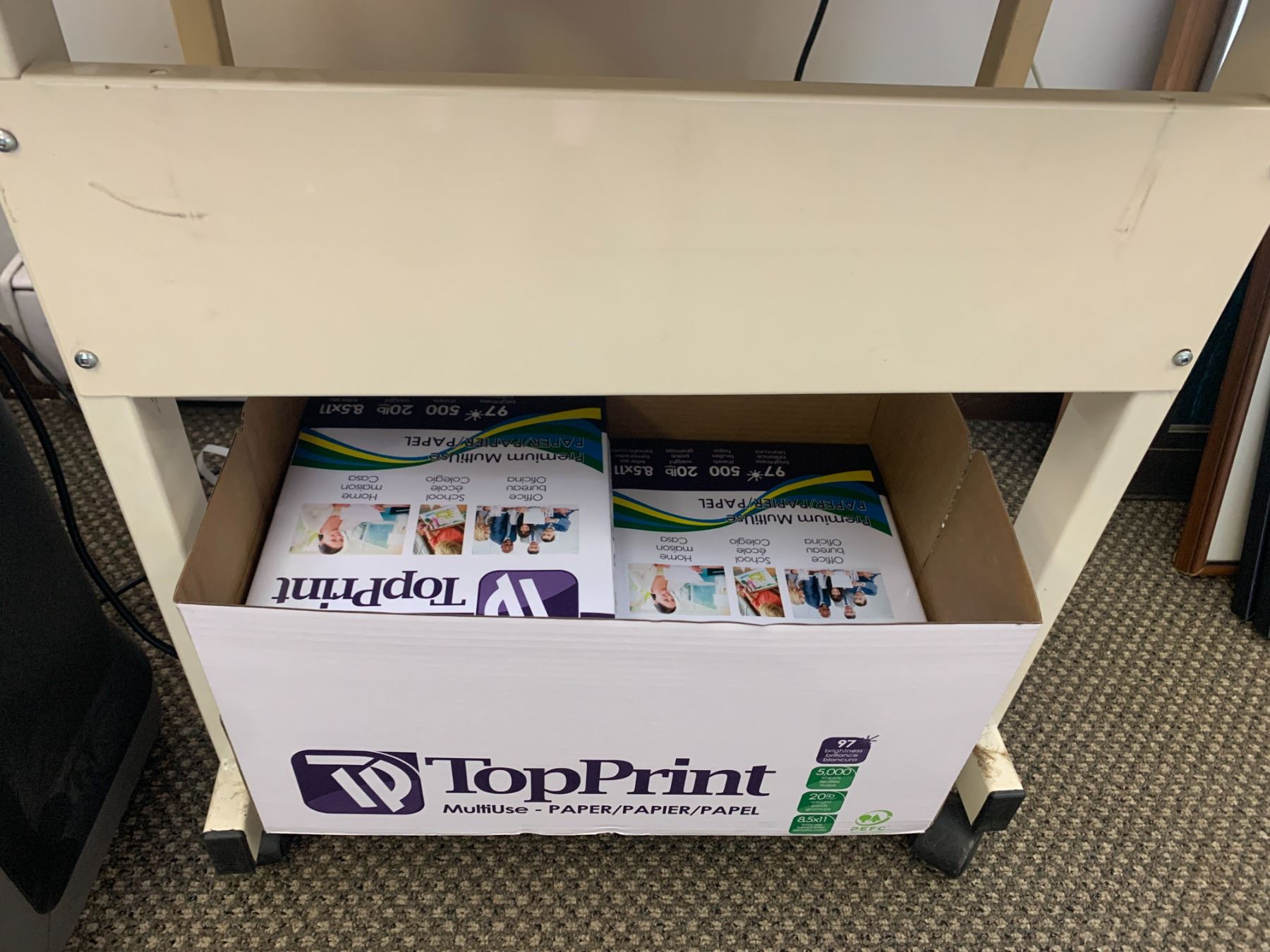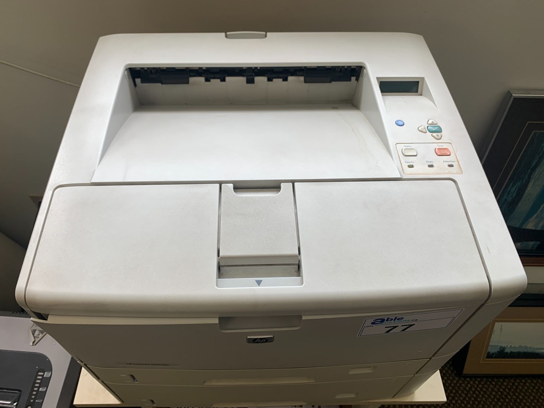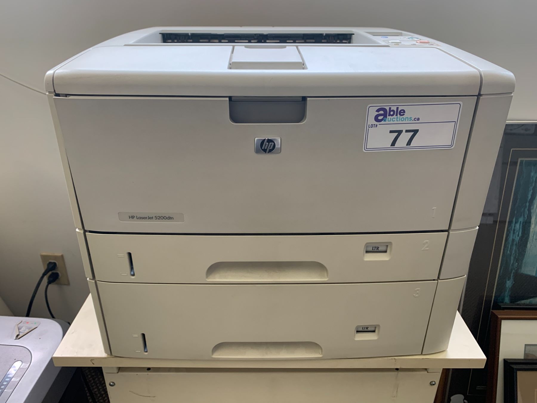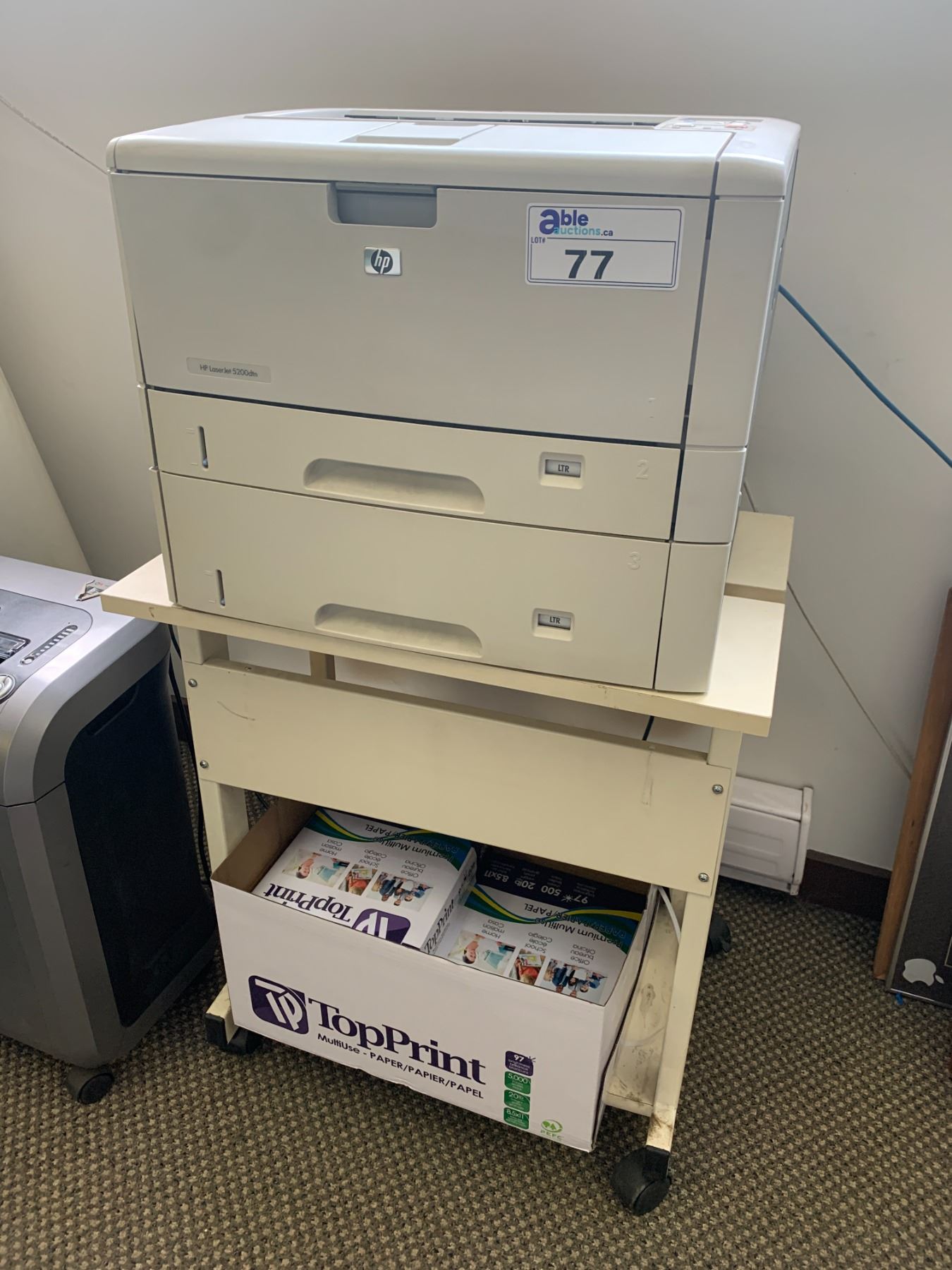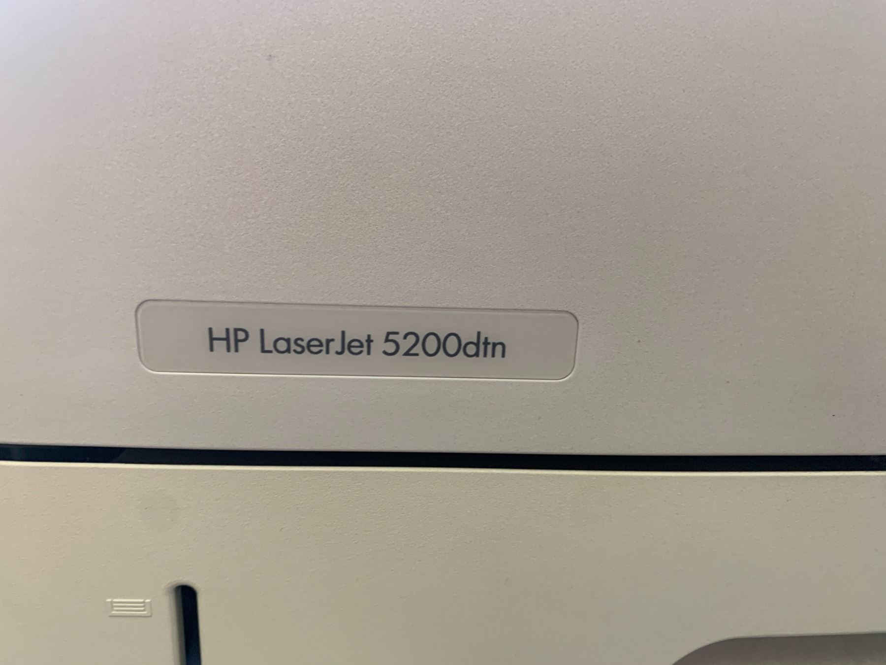 HP LASERJET 5200DTN COMMERCIAL LASER PRINTER ON A MOBILE STAND WITH HALF A BOX OF PRINTER PAPER