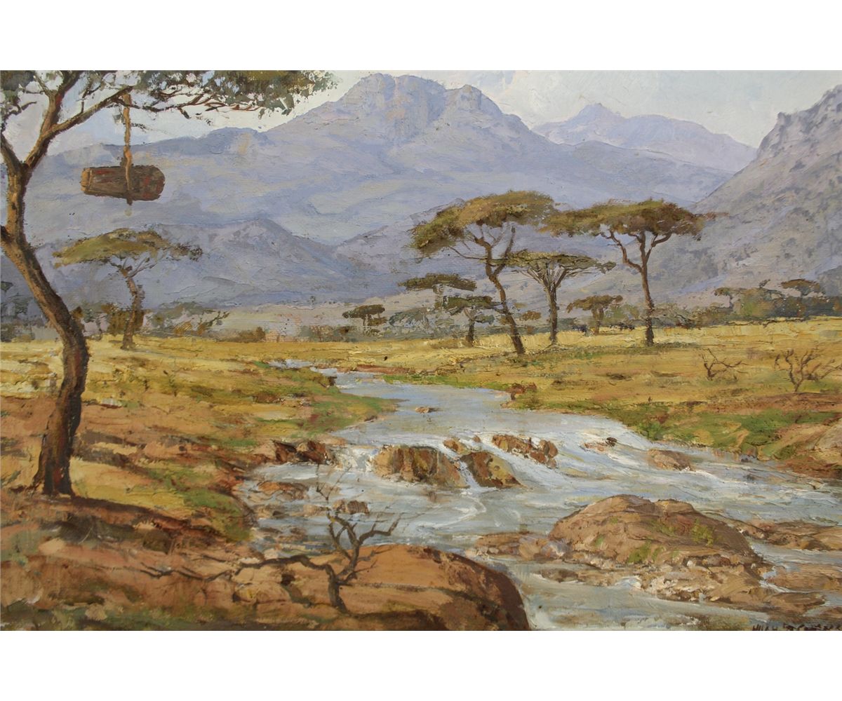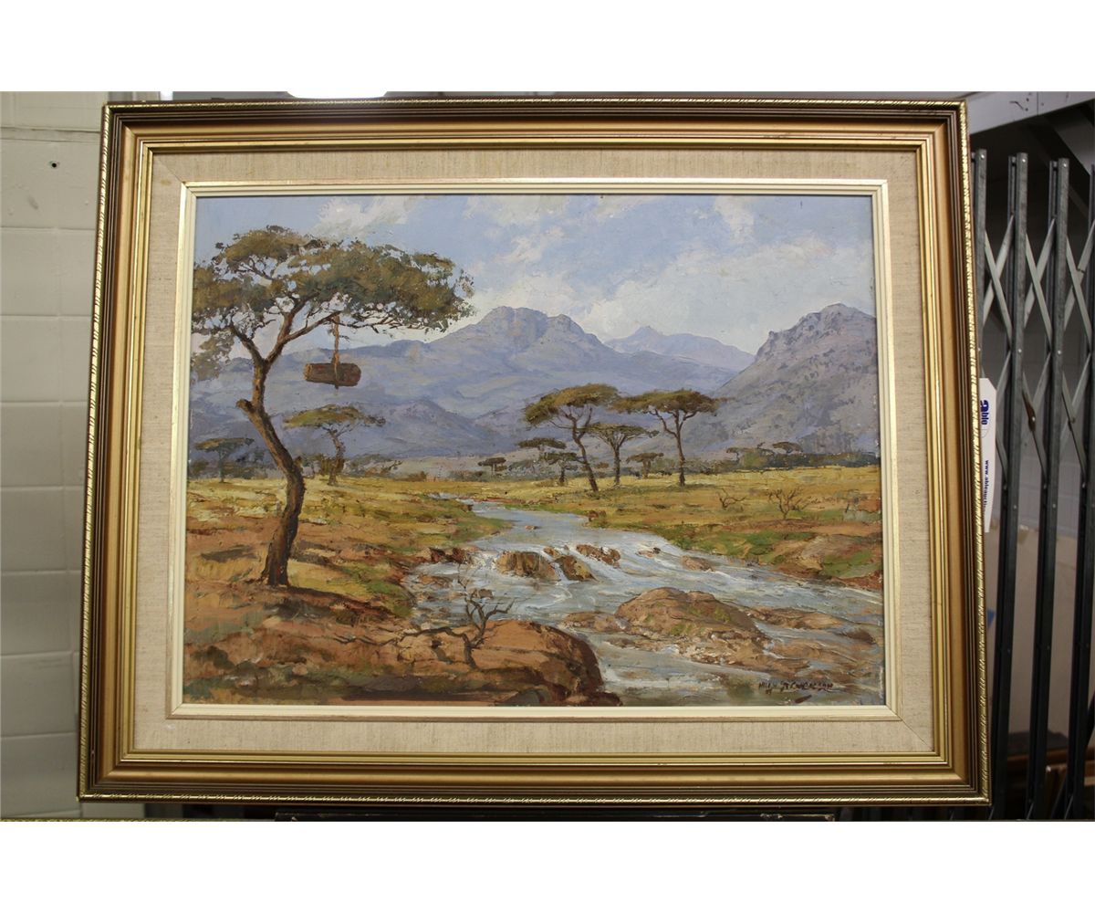 HUGH STEPHENSON, "AFRICAN NATIVE BEEHIVE IN TREE" OIL ON CANVAS, SIGNED LOWER RIGHT 24" W X 18" H
