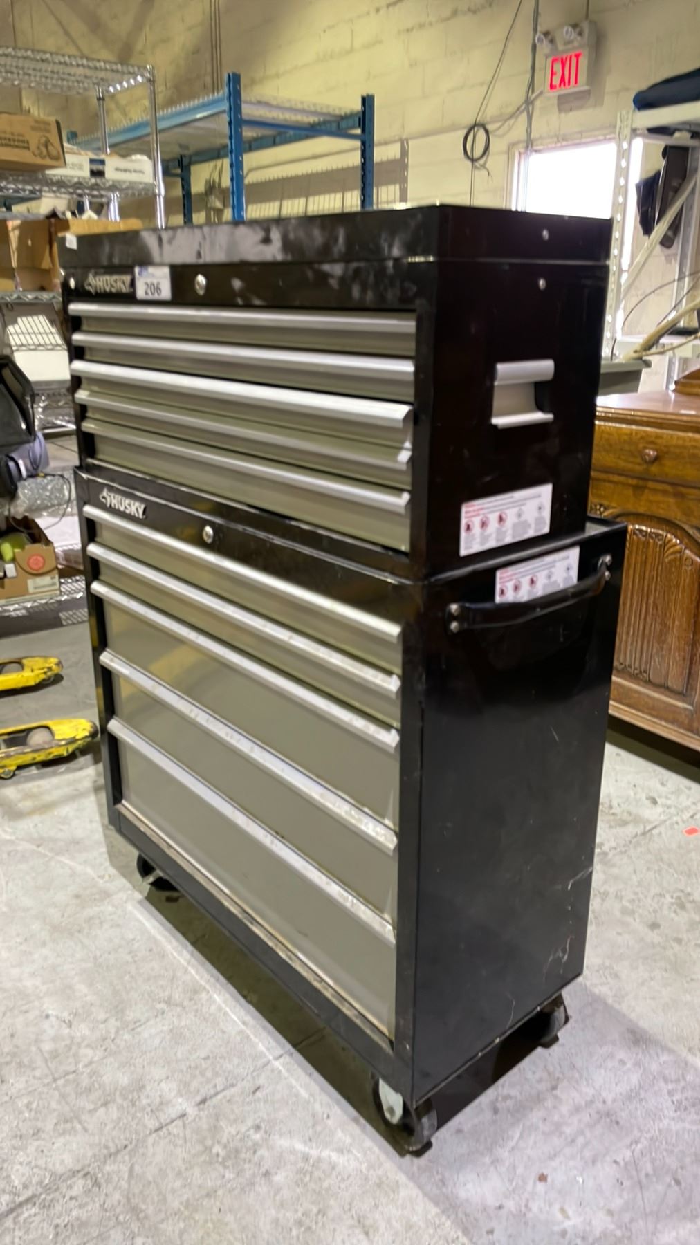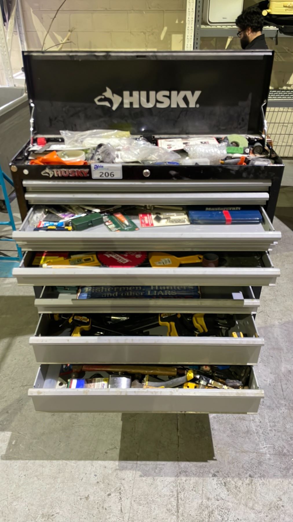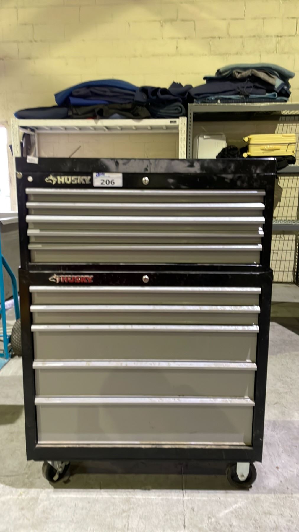 HUSKY 10 DRAWER PORTABLE TOOLBOX WITH ASSORTED TOOL CONTENTS INCLUDING; HEAT GUN, HAMMERS, BAR CLAMPS & MORE