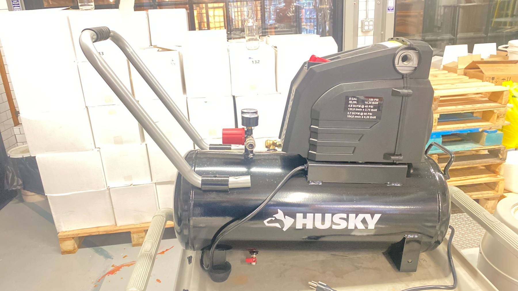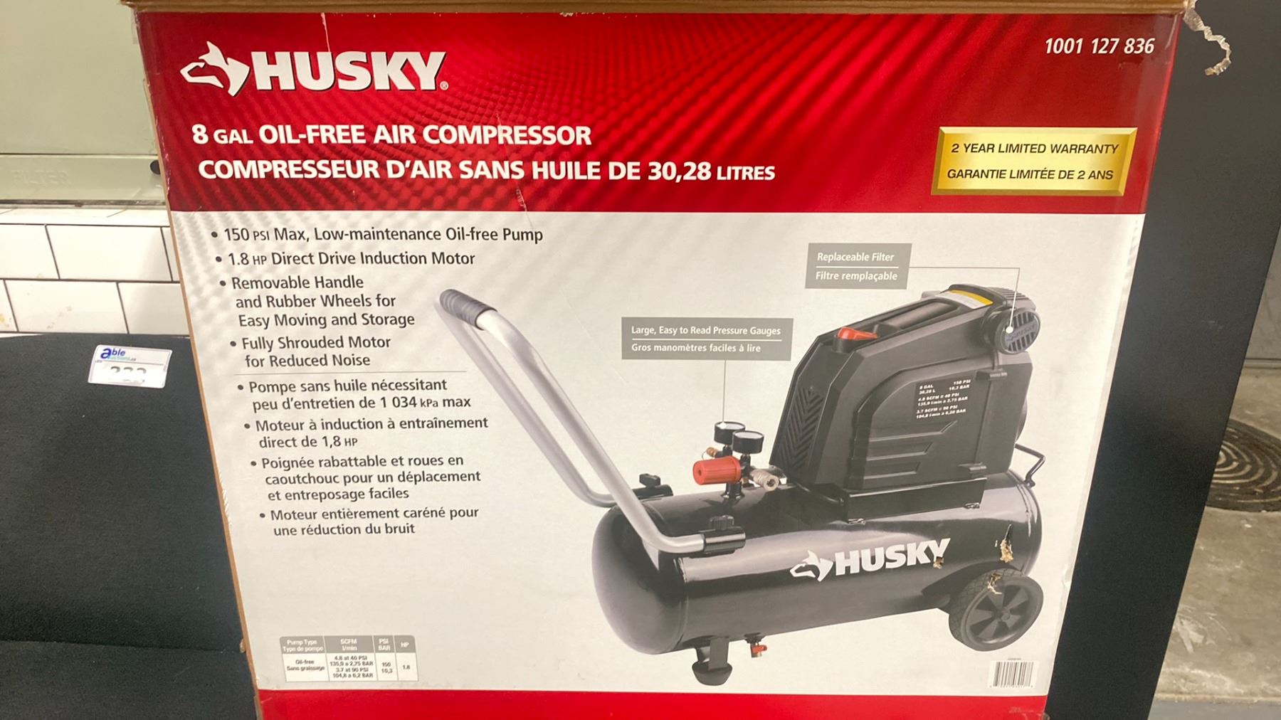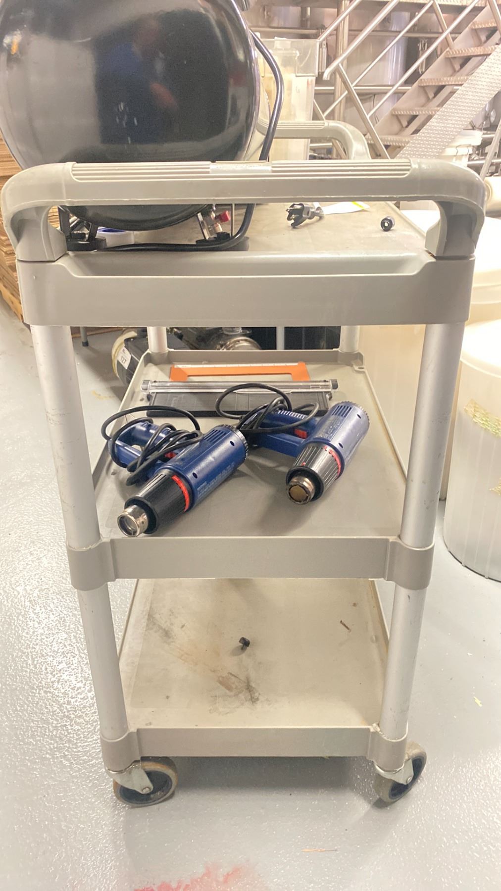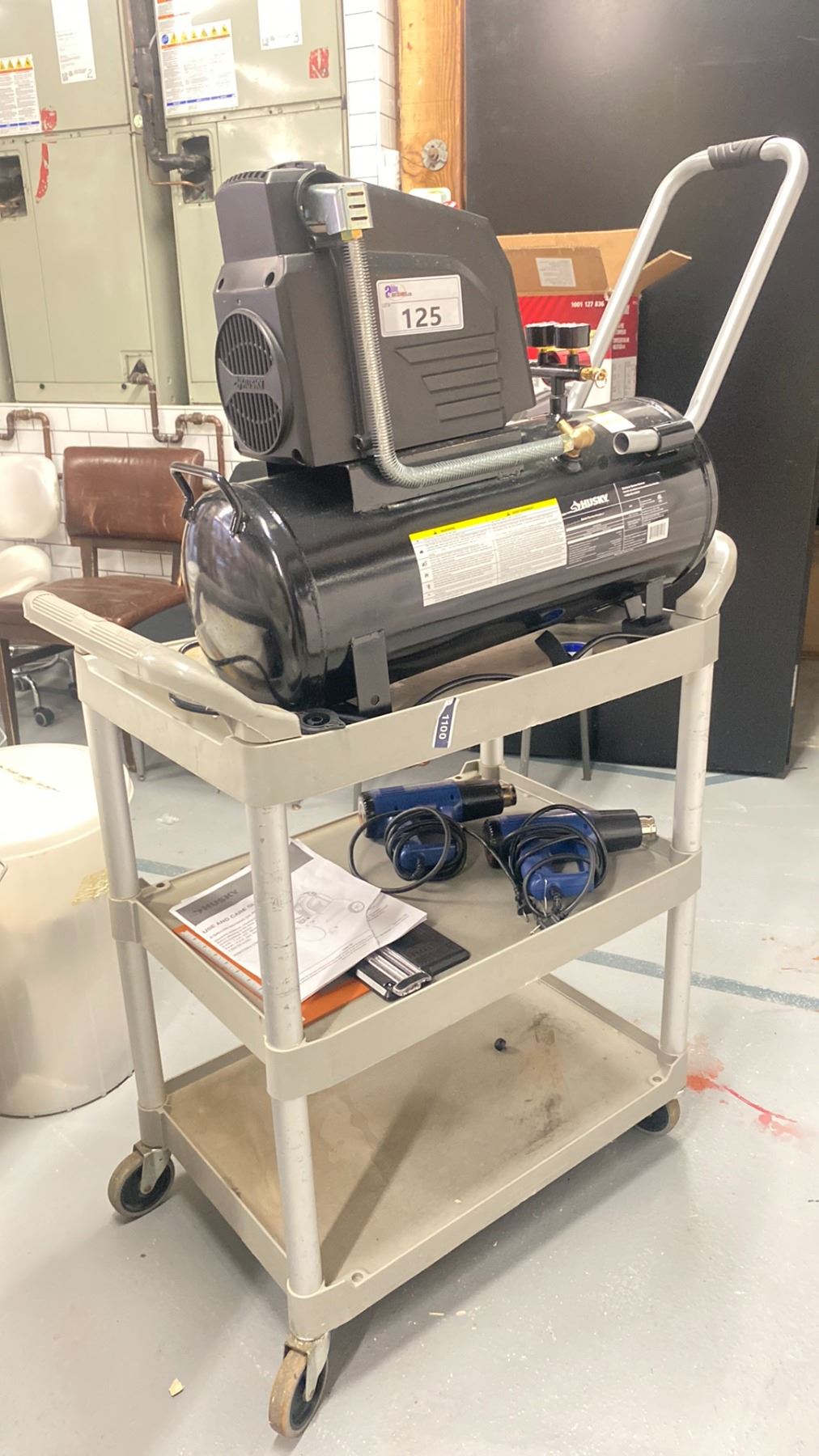 HUSKY 8 GAL OIL FREE PORTABLE AIR COMPRESSOR ON MOBILE 3 TIER RUBBERMAID PRODUCT CART WITH HEAT GUNS & ASSORTED CONTENTS