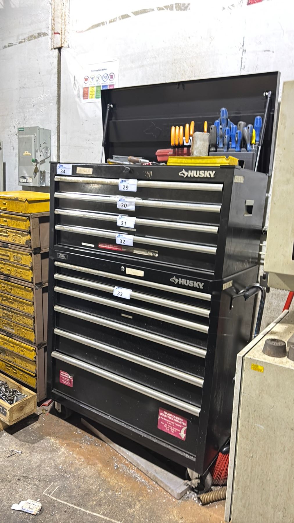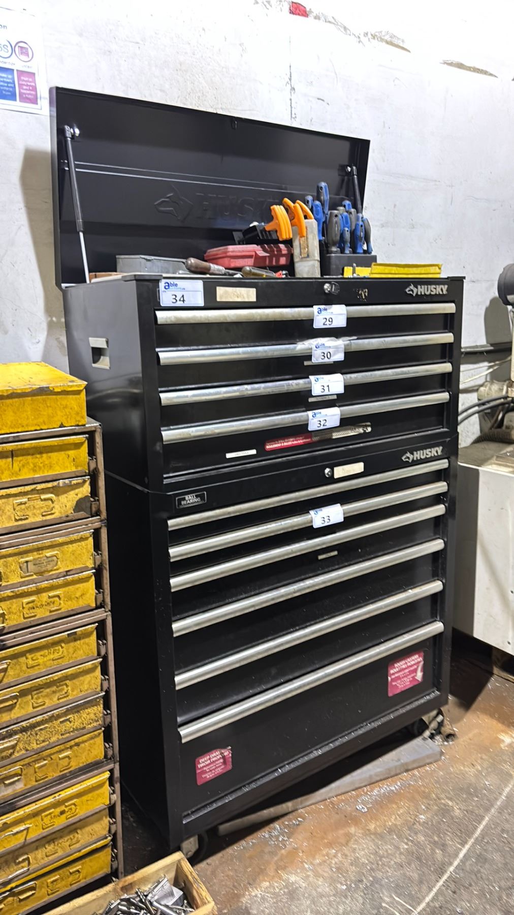 HUSKY BLACK 10 DRAWER 2 SECTION INDUSTRIAL MOBILE TOOL BOX WITH ASSORTED HAND TOOLS, TOOLING & CONTENTS *LAST DAY REMOVAL*