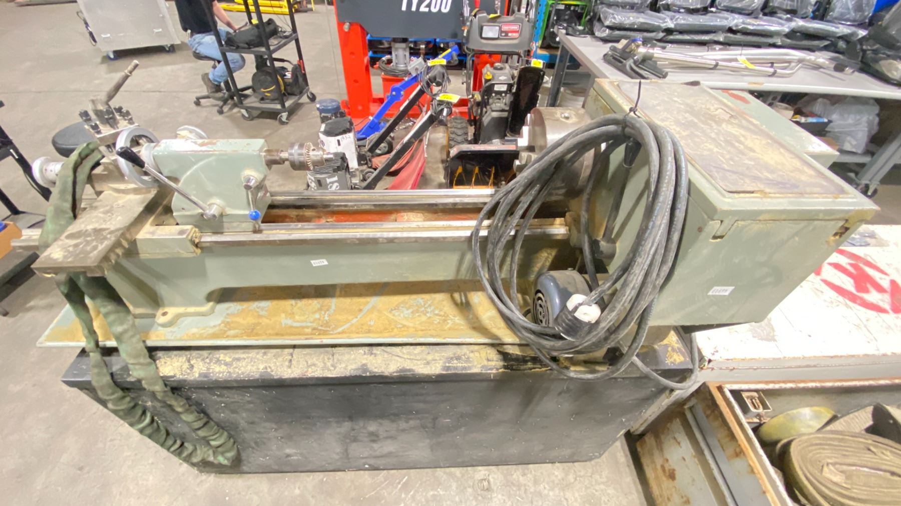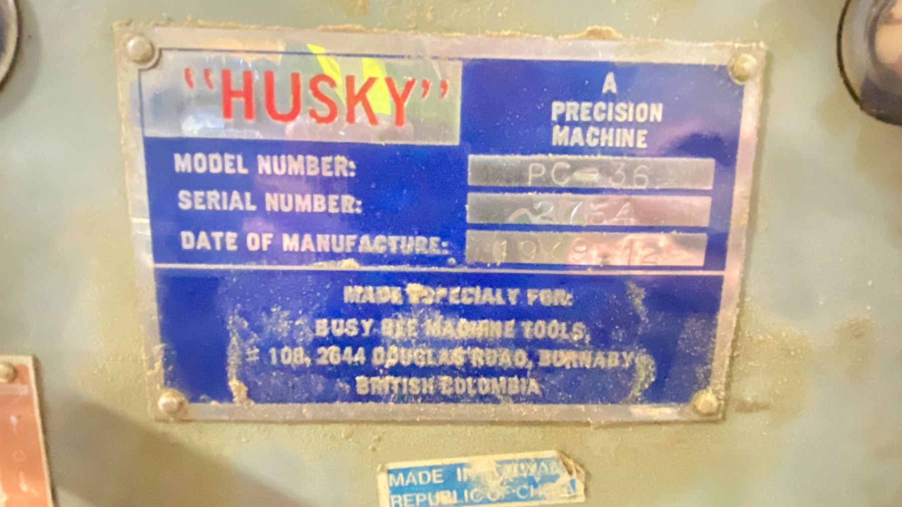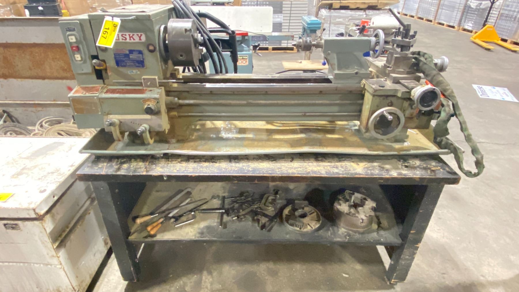 HUSKY PC-36 INDUSTRIAL LATHE ON WOODEN STAND WITH ASSORTED BITS & TOOLS INCLUDED APPROX 5'W X 2.2'D X 4.5'H