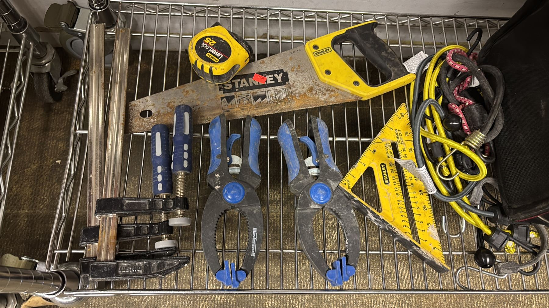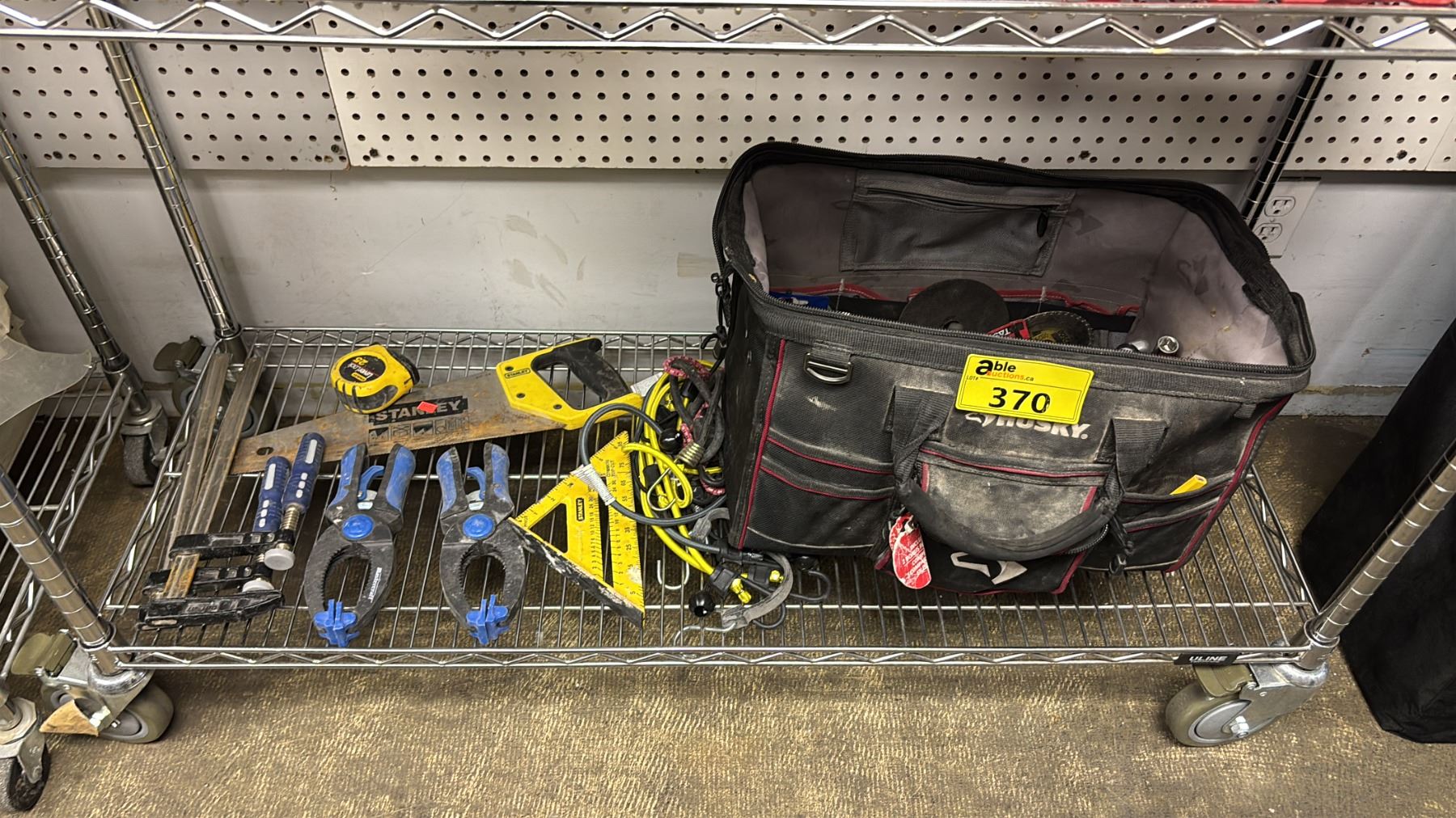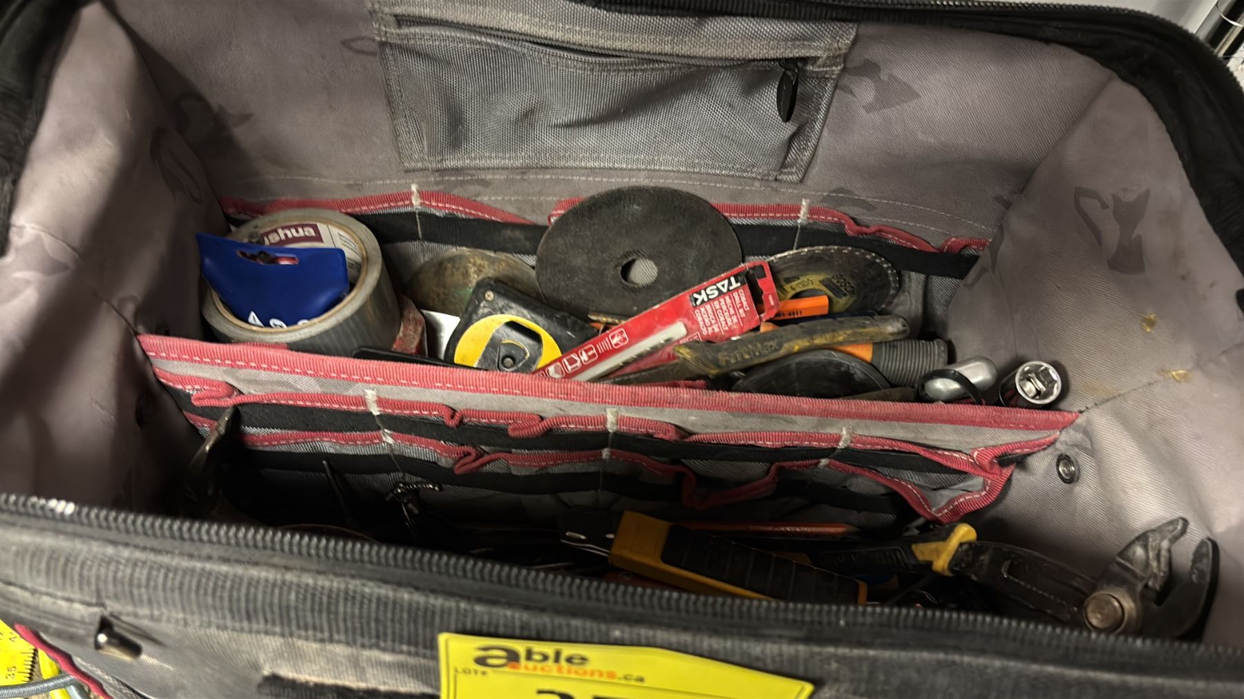 HUSKY TOOL BAG WITH CONTENTS, CLAMPS, SAW, MEASURING TAPE & BUNGEE CORDS