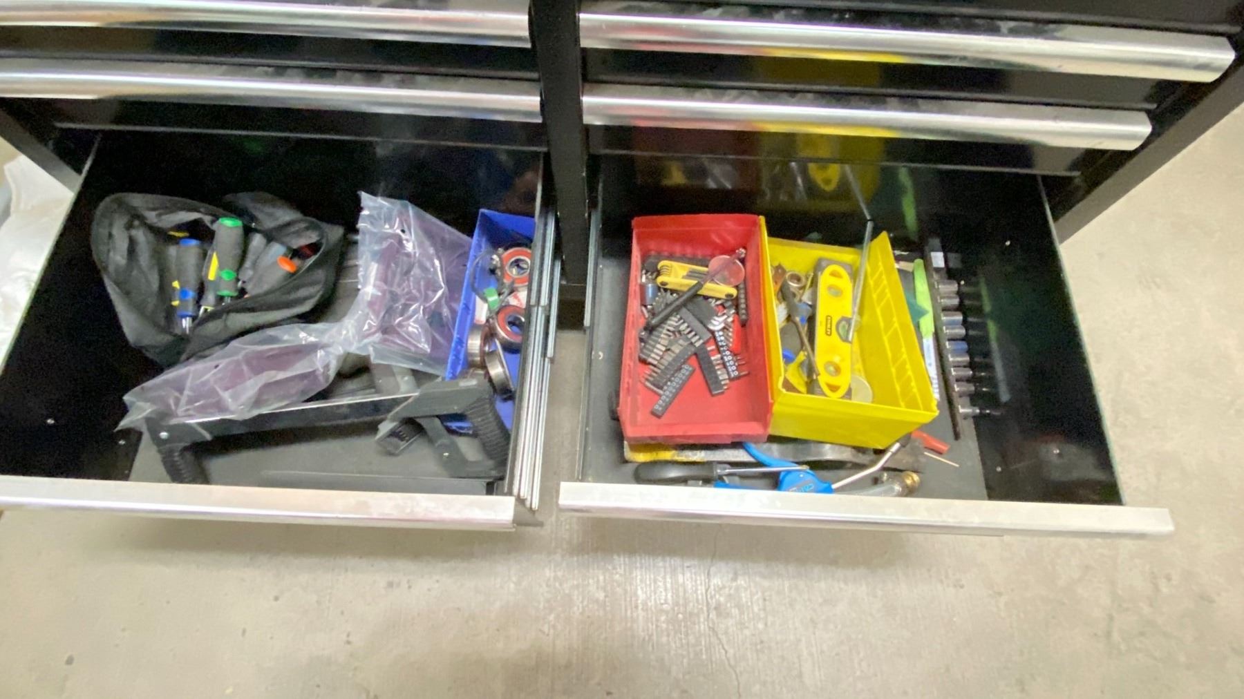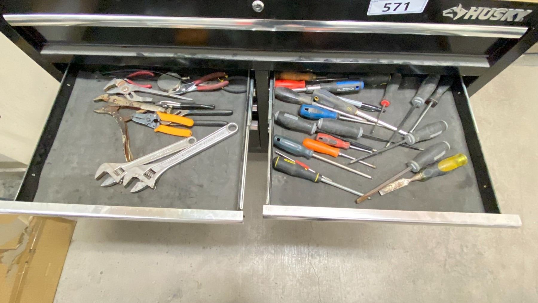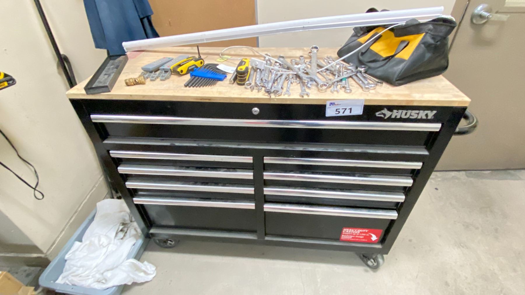 HUSKY TOOL BOX WORK BENCH 48"X18" ON WHEELS. WITH CONTENTS. SOCKET SET, PRY BARS, COMBINATION WRENCHES, SCREWDRIVERS, HAMMERS, VISE GRIPS, HACKSAW, ALAN KEYS, CRESCENT WRENCHES, ETC LOCATED IN MAINTENANCE OFFICE