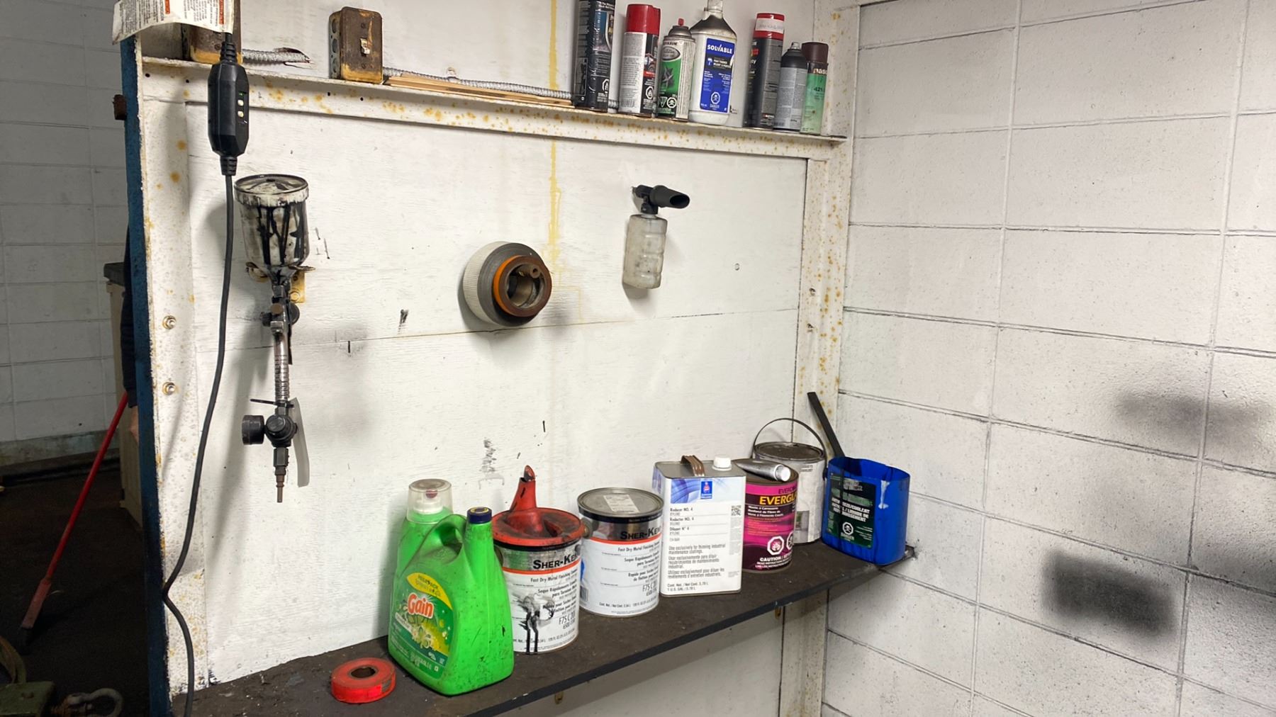 HVLT SPRAY GUN WITH 1.5 GALLONS OF SHER-KEM BLACK ENAMEL, GALLON OF REDUCER, 1/2 GALLON FIBREGLASS, SPRAY CANS AND PAINTING DOLLY