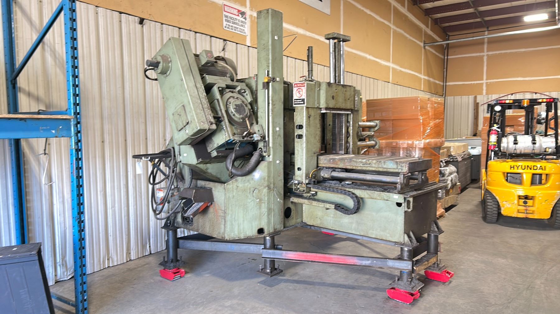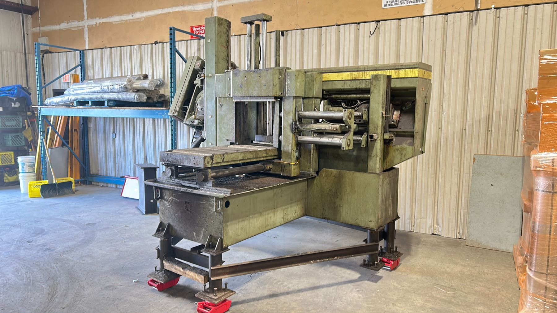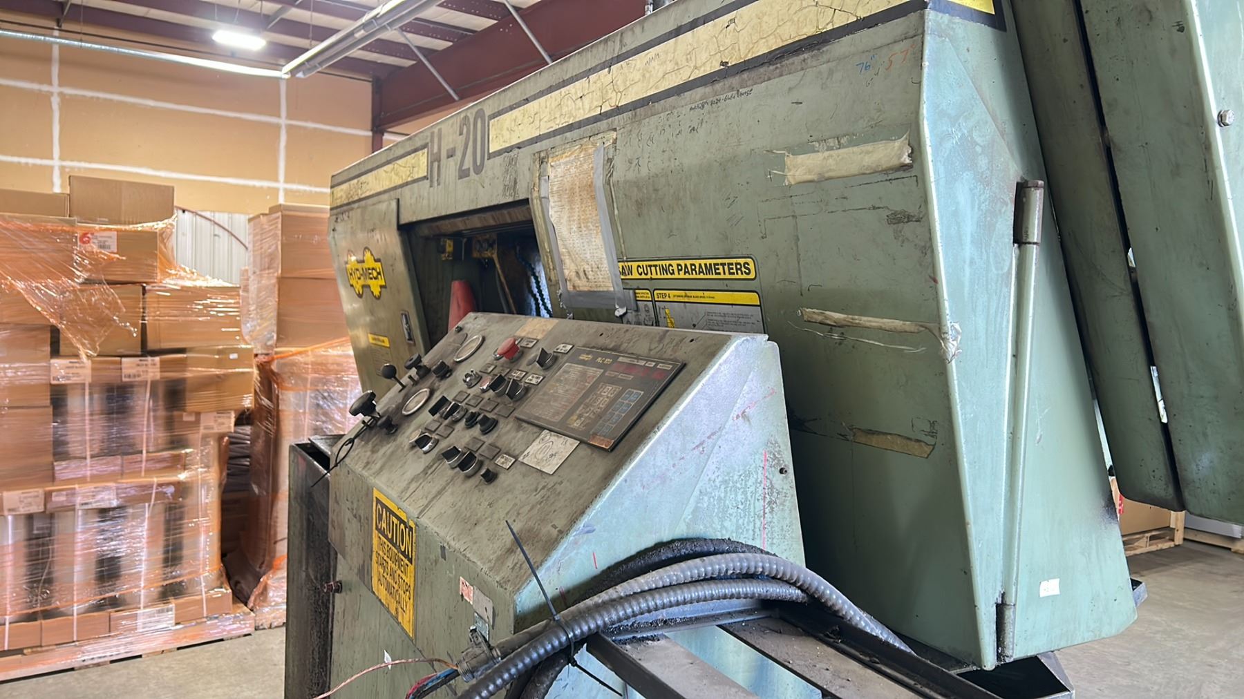 HYD-MECH H20A INDUSTRIAL 20" CUT HYDRAULIC PRESS HORIZONTAL METAL CUTTING WET BAND SAW 3/10 HP ELECTRIC 480V, 60HZ, 3PZ FLA 20, SIZE 11'W X 8'D X 9'H WITH PALLET OF REPLACEMENT BLADES *MUST HAVE PROPER EQUIPMENT TO TRANSPORT* *REQUIRES SKATES / HIAB CRANE TO REMOVE, APPROX. WEIGHT 12,000 LBS* *INDUSTRIAL SKATES NOT INCLUDED*