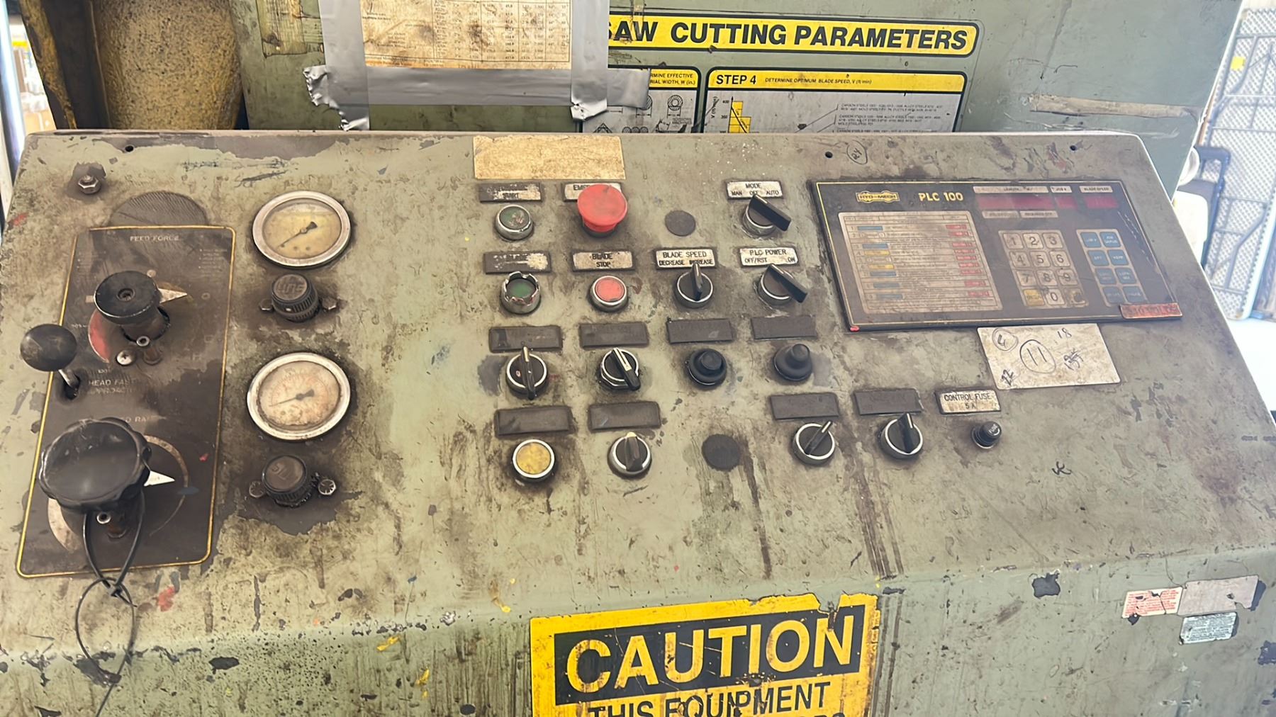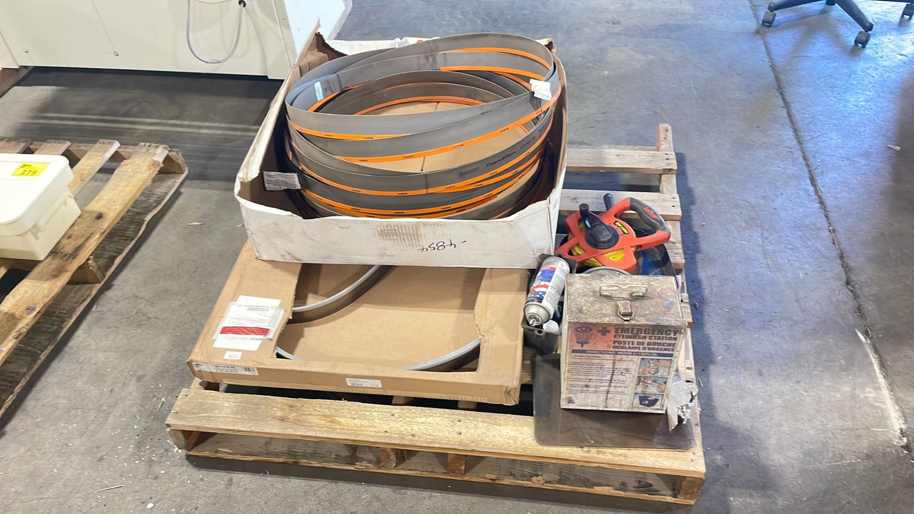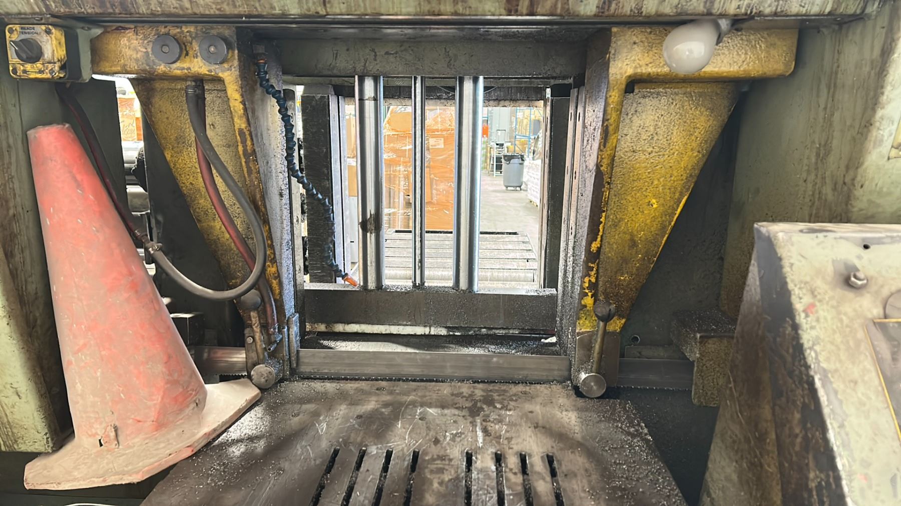 HYD-MECH H20A INDUSTRIAL 20" CUT HYDRAULIC PRESS HORIZONTAL METAL CUTTING WET BAND SAW 3/10 HP ELECTRIC 480V, 60HZ, 3PZ FLA 20, SIZE 11'W X 8'D X 9'H WITH PALLET OF REPLACEMENT BLADES *MUST HAVE PROPER EQUIPMENT TO TRANSPORT* *REQUIRES SKATES / HIAB CRANE TO REMOVE, APPROX. WEIGHT 12,000 LBS* *INDUSTRIAL SKATES NOT INCLUDED*