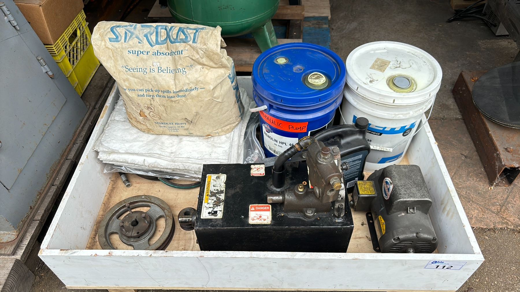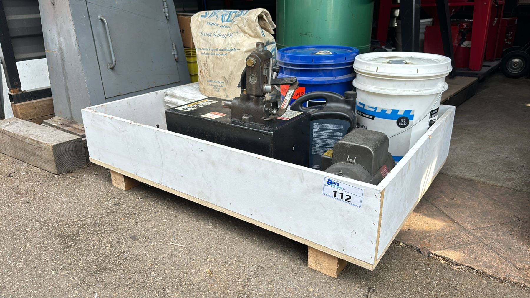 HYDRAULIC POWERPACK PUMP WITH BALDOR ELECTRIC MOTOR, HYDRAULIC PUMP OIL, BAG OF SUPER ABSORBENT, ABSORBENT PADS, HYDRAULIC HOSE & BELTS *CRATE INCLUDED*
