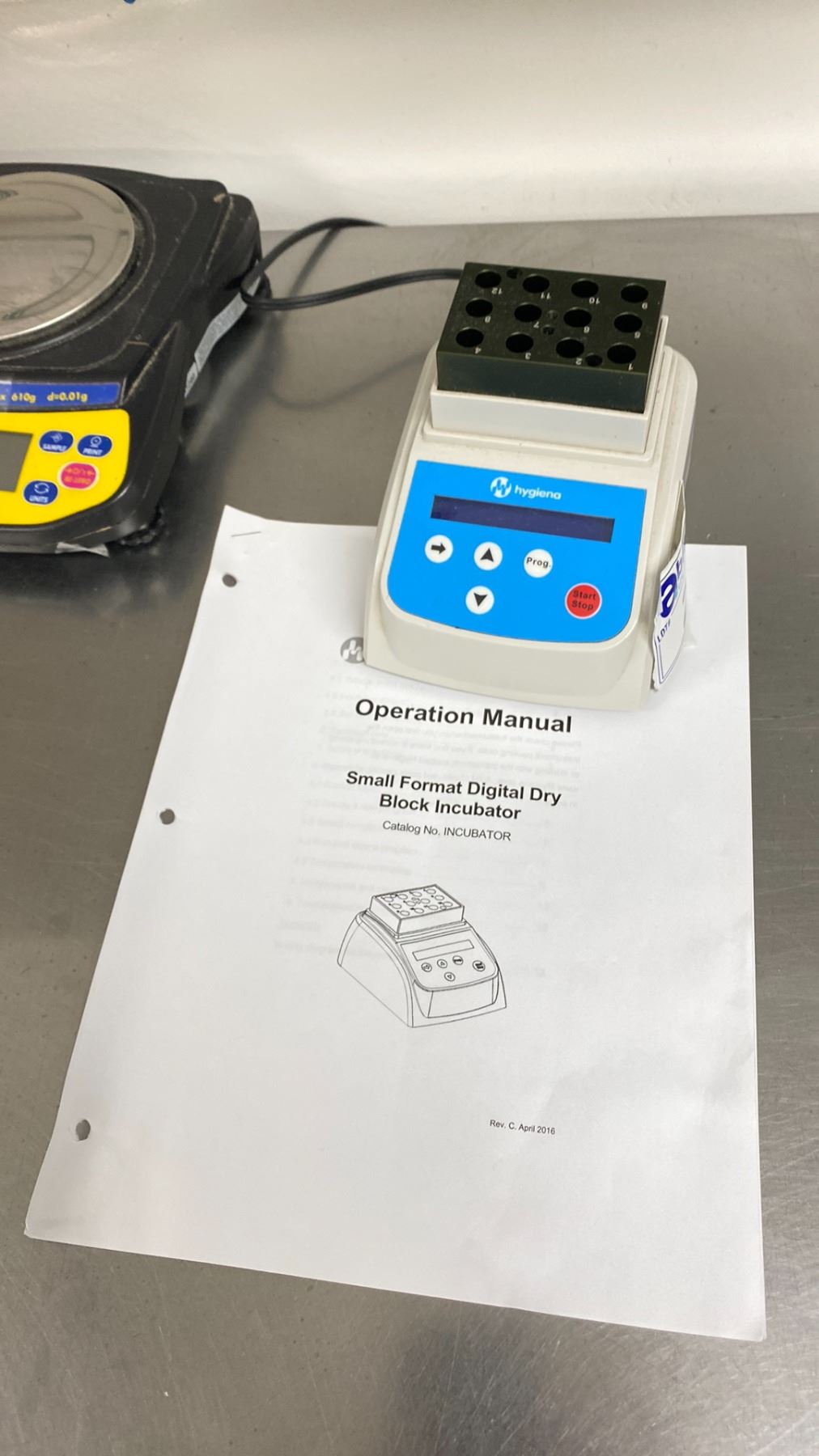 HYGIENA INCUBATOR SMALL FORMAT DIGITAL DRY BLOCK INCUBATOR. USED FOR ENVIRONMENTAL SWAB TESTING.
