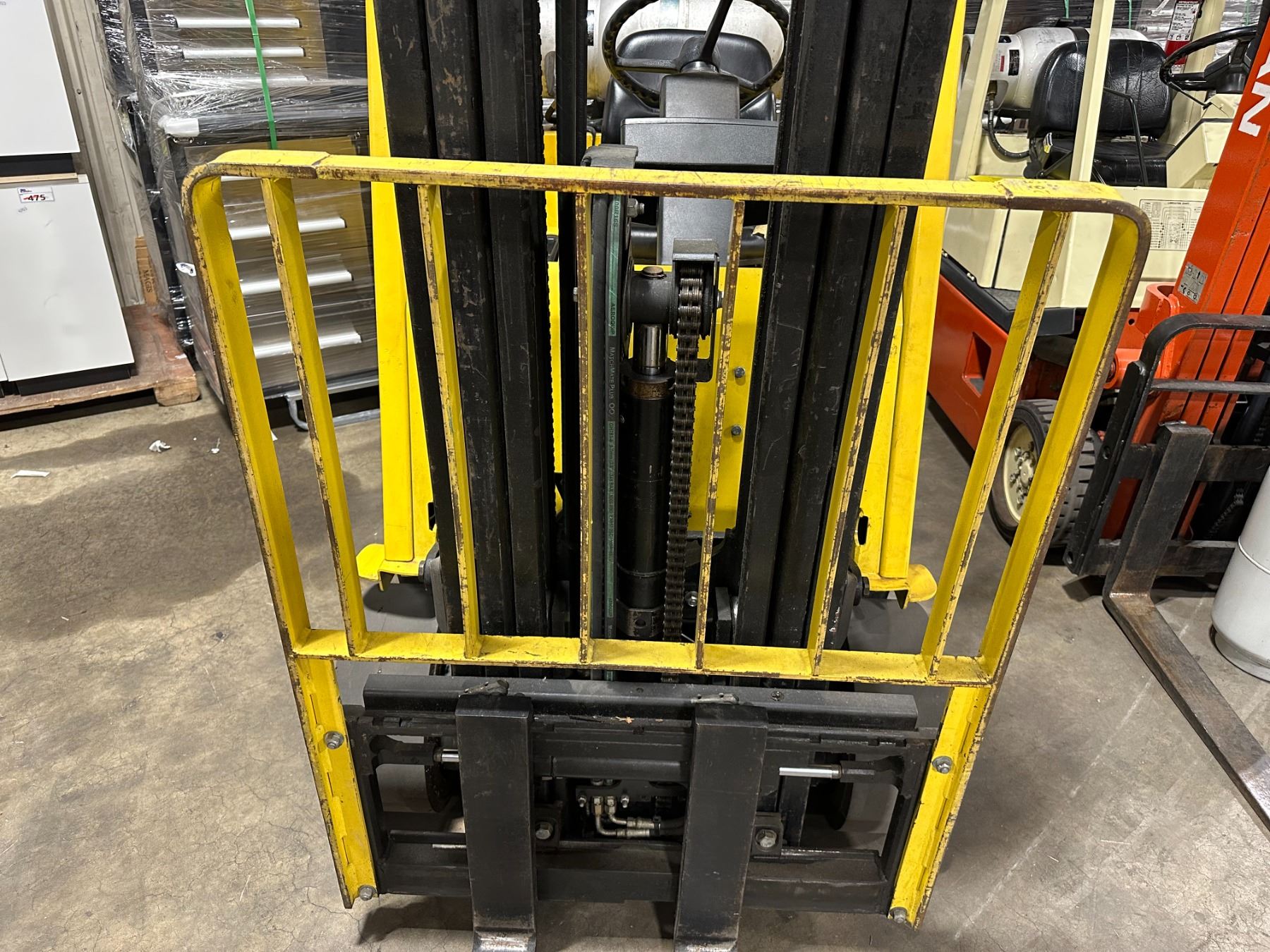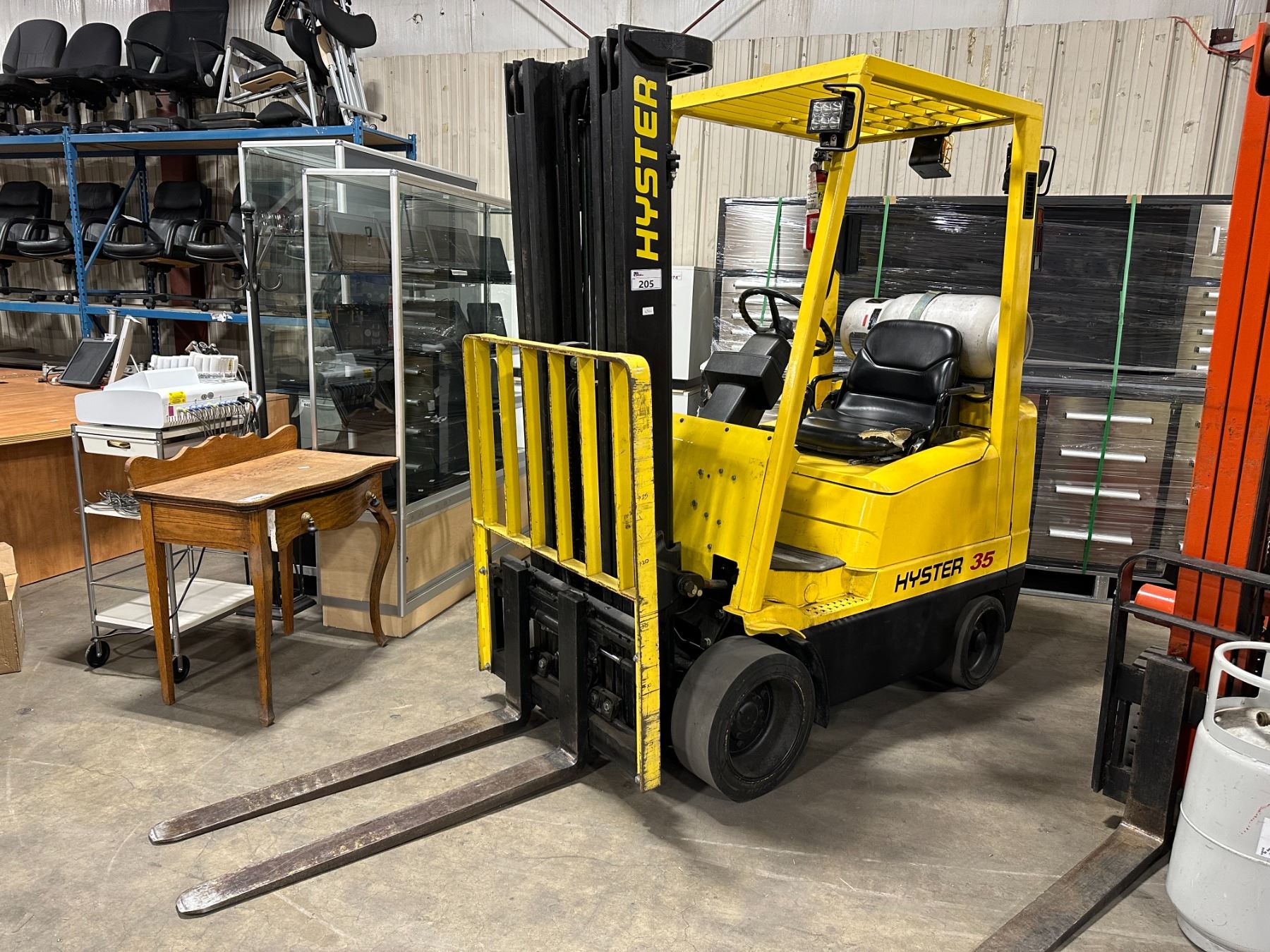 HYSTER 35 S35XM YELLOW 189" 3 STAGE MAST 3350 LBS CAPACITY SOLID RUBBER TIRE SIT DOWN COUNTER BALANCE PROPANE FORKLIFT, PROPANE BOTTLE INCLUDED * MUST HAVE PROPER EQUIPMENT TO TRANSPORT * ( HAS KEYS )