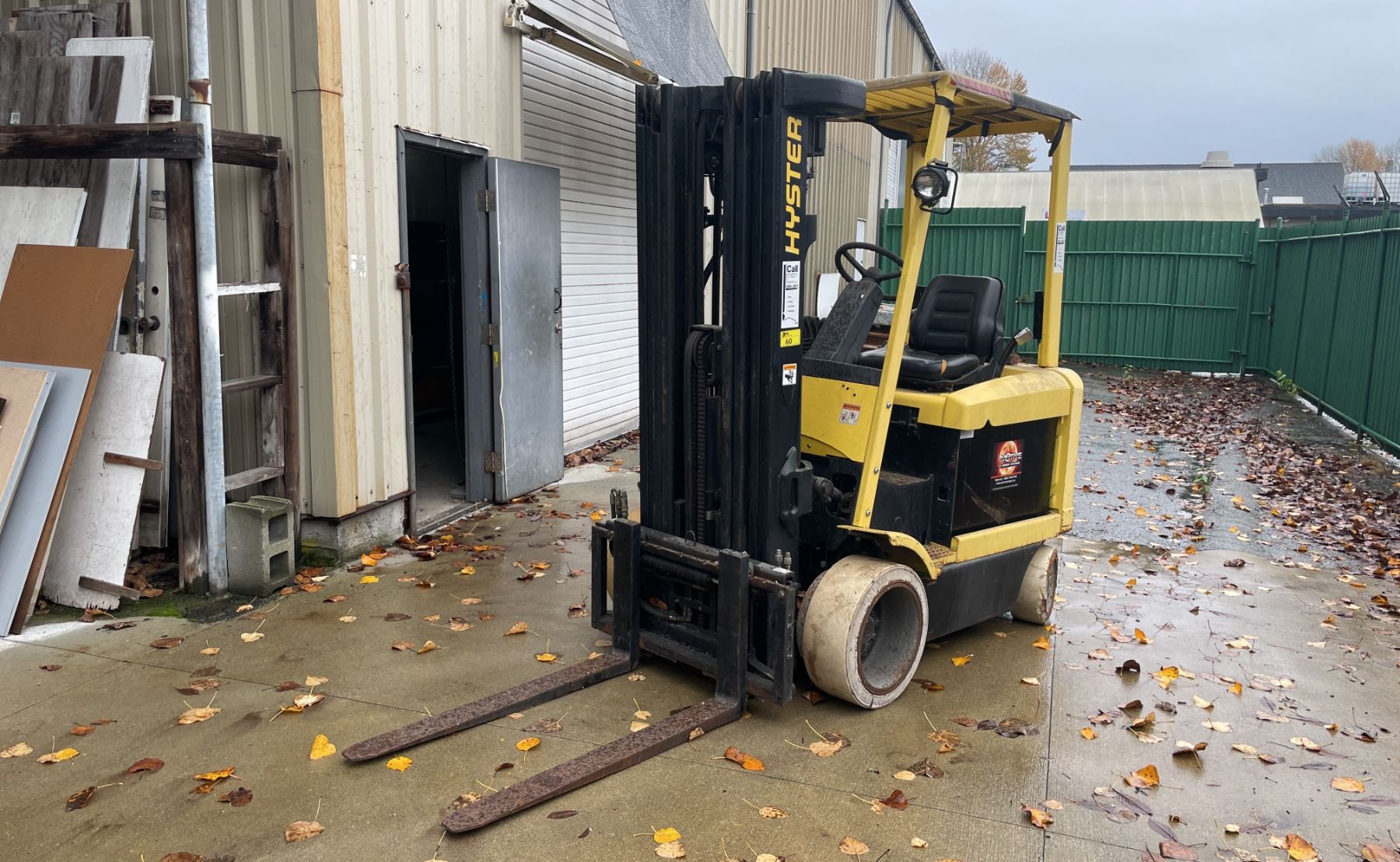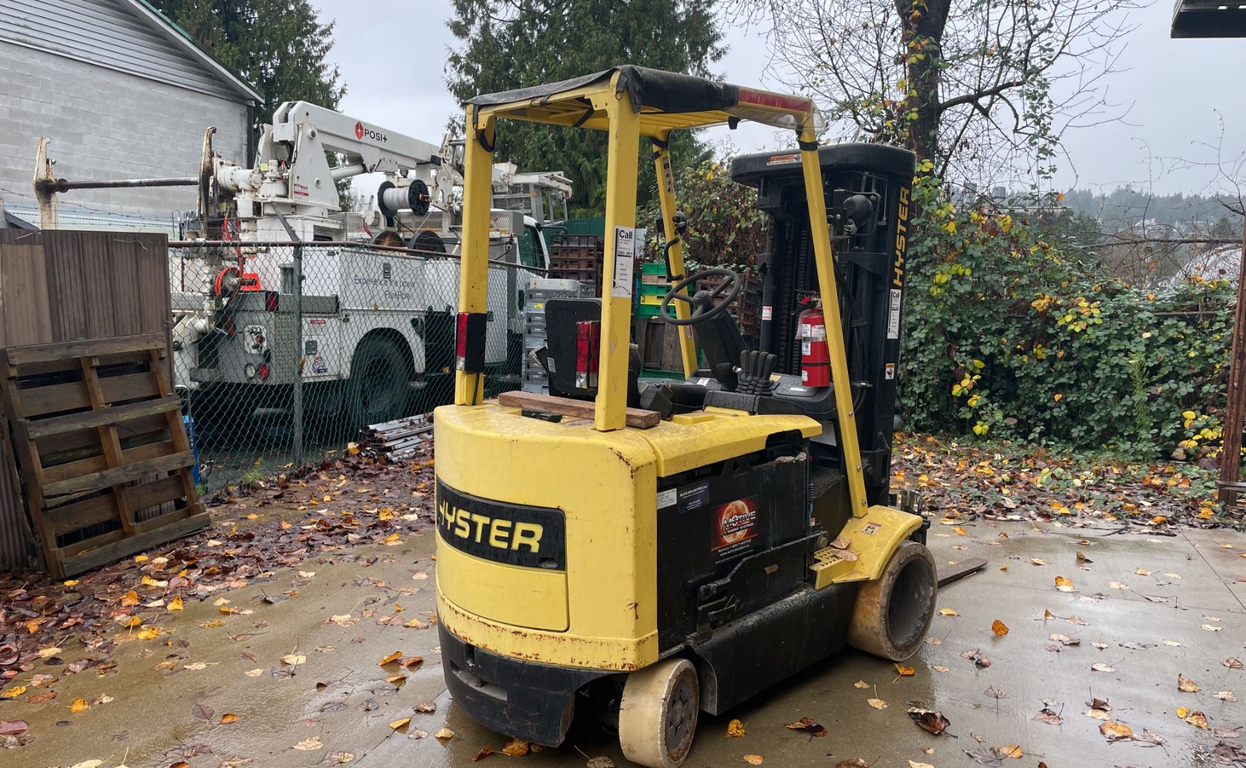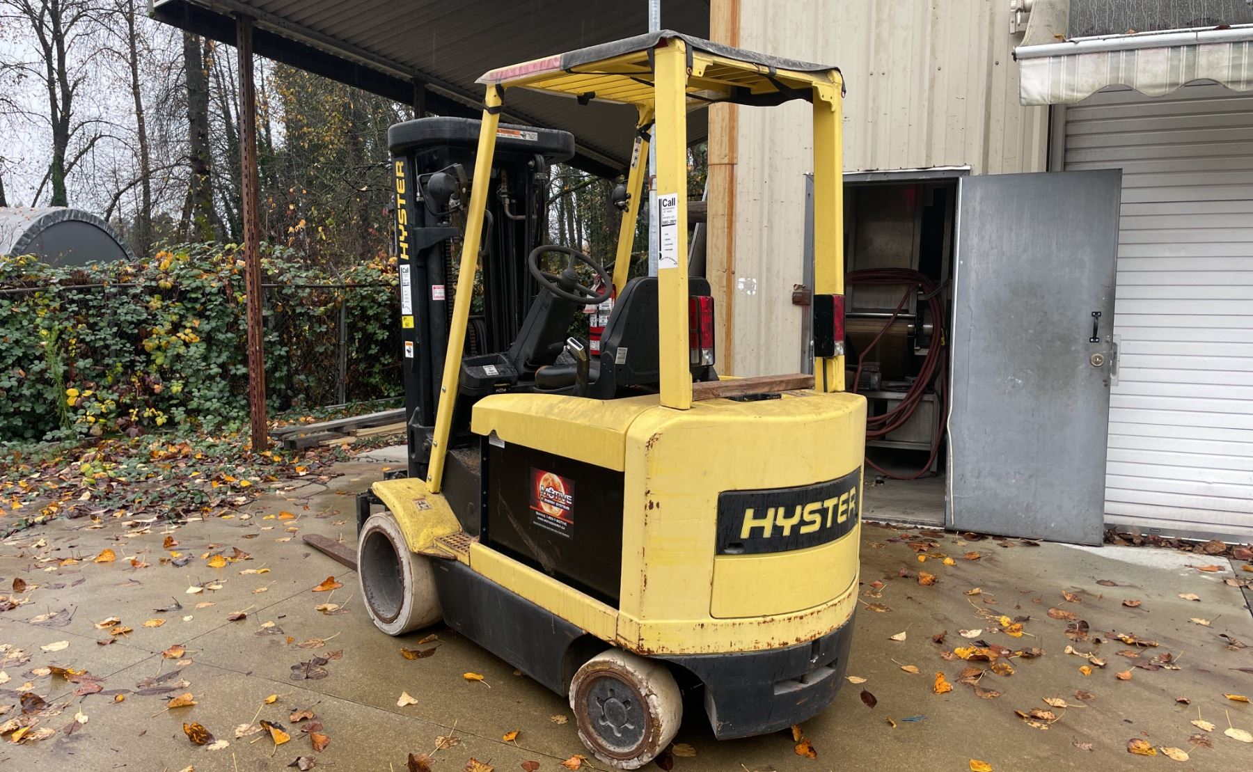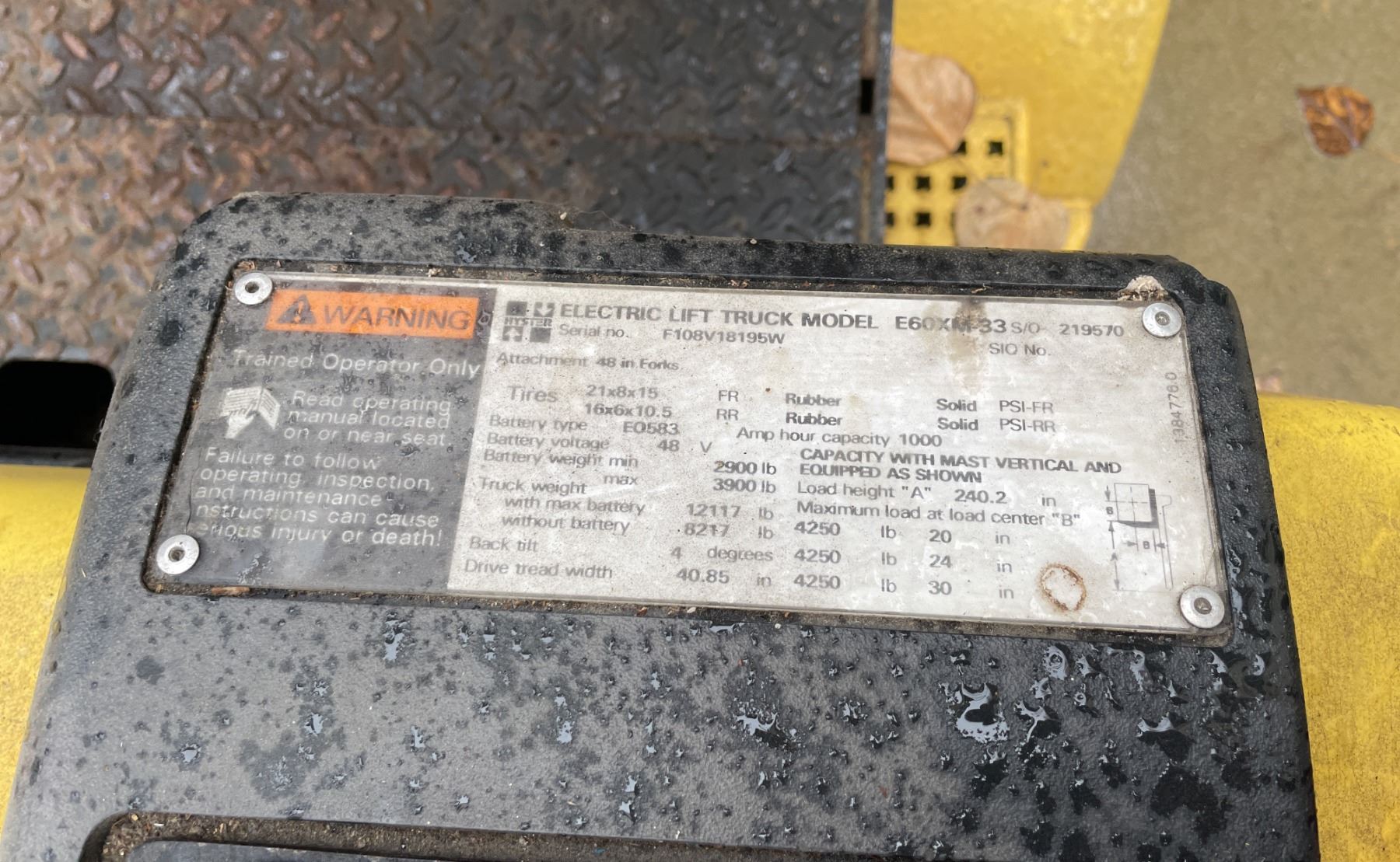 HYSTER E60XM-33 YELLOW 4250 LBS CAPACITY 240.2" MAST HEIGHT 4 STAGE SOLID RUBBER TIRE ELECTRIC SIT DOWN COUNTERBALANCE FORKLIFT WITH SCR 100 COMMERCIAL 24V BATTERY CHARGER *HOUR METER READS 10669 TRACTION HOURS & 1680 PUMP HOUR NOT VERIFIED* *MUST HAVE PROPER TOOLS / TECHNICIAN TO DISMANTLE* *MUST HAVE PROPER EQUIPMENT TO TRANSPORT* *LAST DAY REMOVAL*