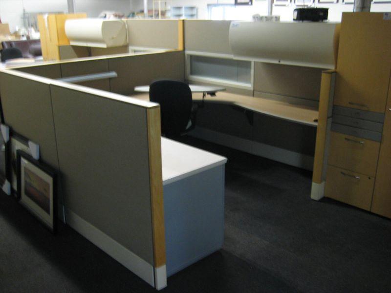 Haworth Double Workstation C/w Dividers, Pedestals, Work Surfaces And Overhead Bins Replacement Cost $8000.00