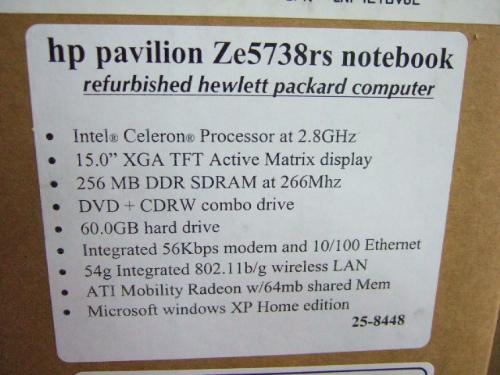 Hp Pavilion Laptop, Intel Celeron 2.8ghz, 256MB DDR Ram, 60GB HD, DVD/cdrw Combo Drive, 802.11g Wireless Ati Mobility Radeon 64MB Video Memory (shared)