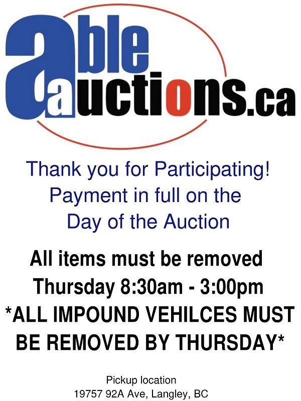 Able Solutions. Inc DBA Ableauctions.ca assumes no responsibility for any liability once a bid is accepted. It is recommended that purchasers arrange insurance for their purchases in advance.