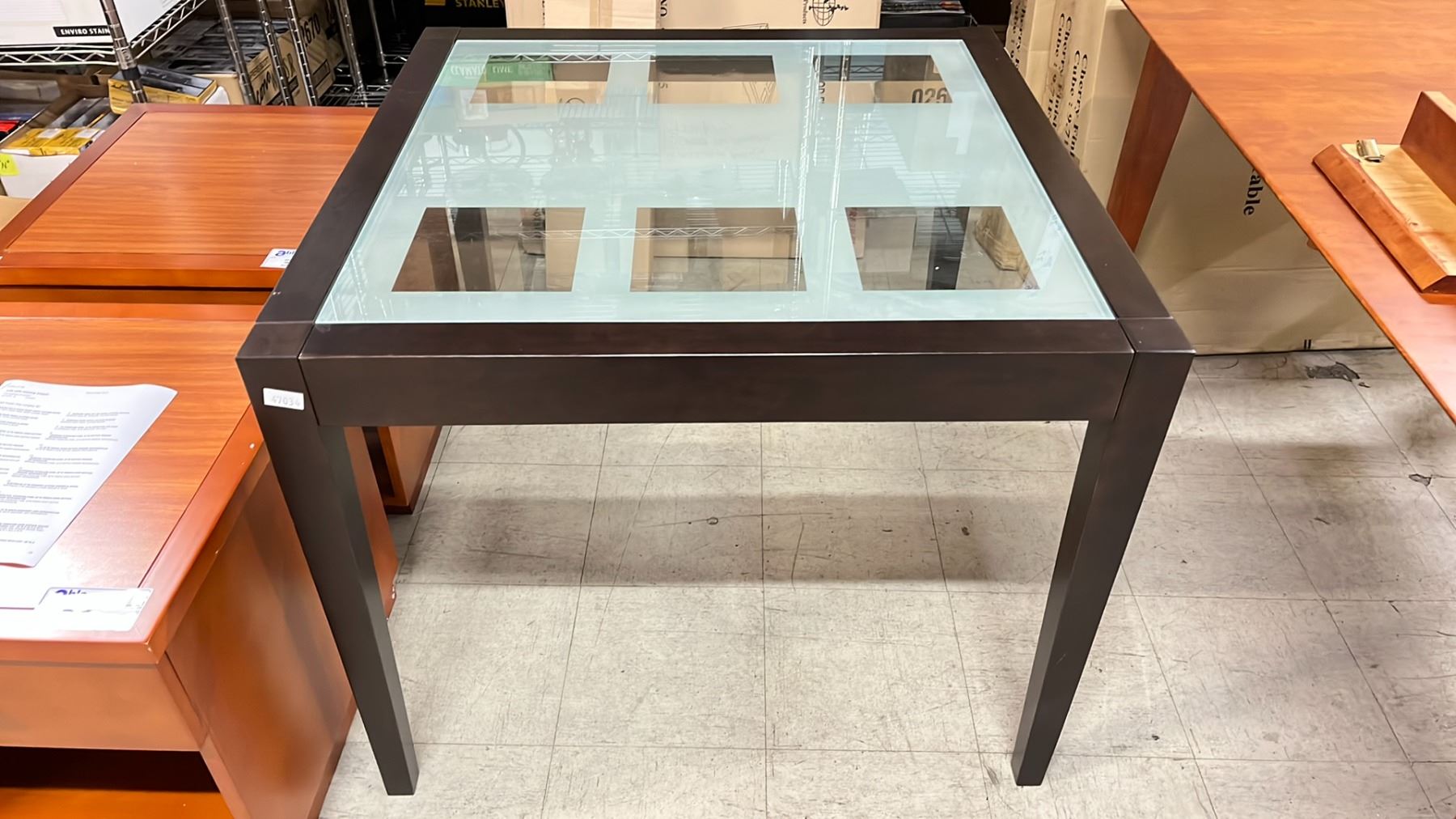 *IN BOX* WEDGEWOOD FURNITURE DARK WOODEN SQUARE TABLE WITH GLASS TEMPERED TOP - 36"W X 36"D X 29"H