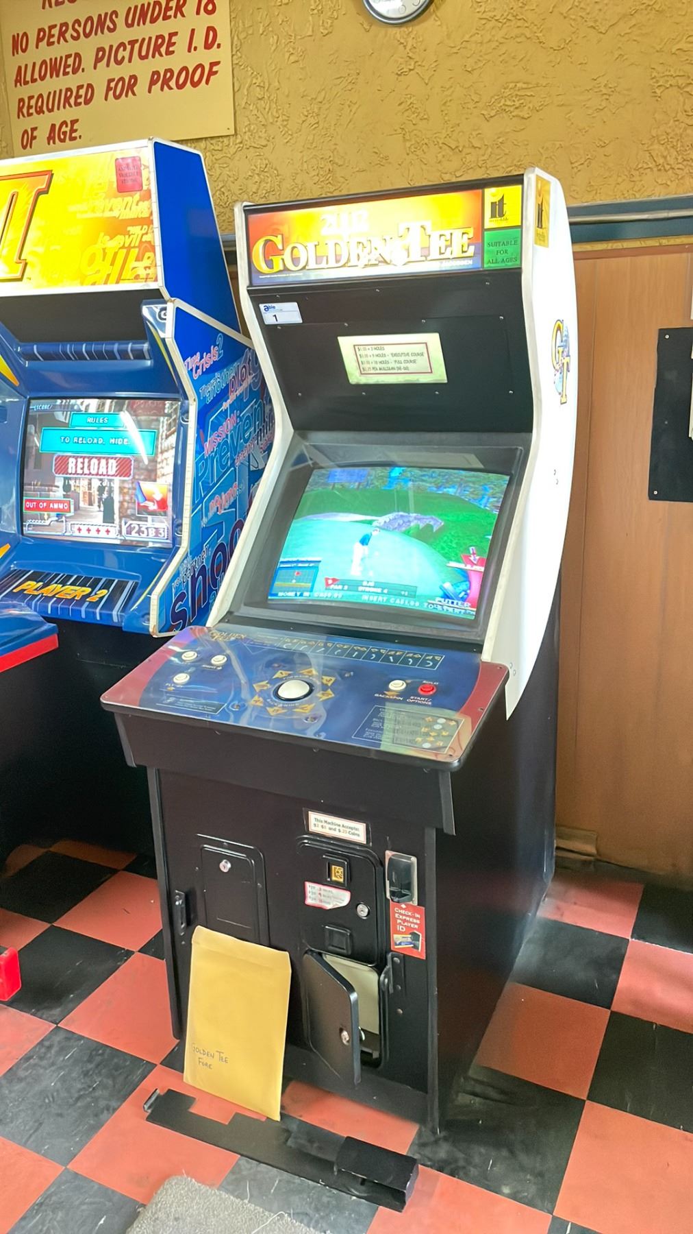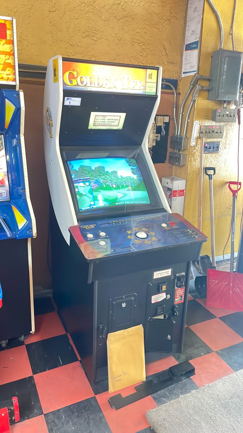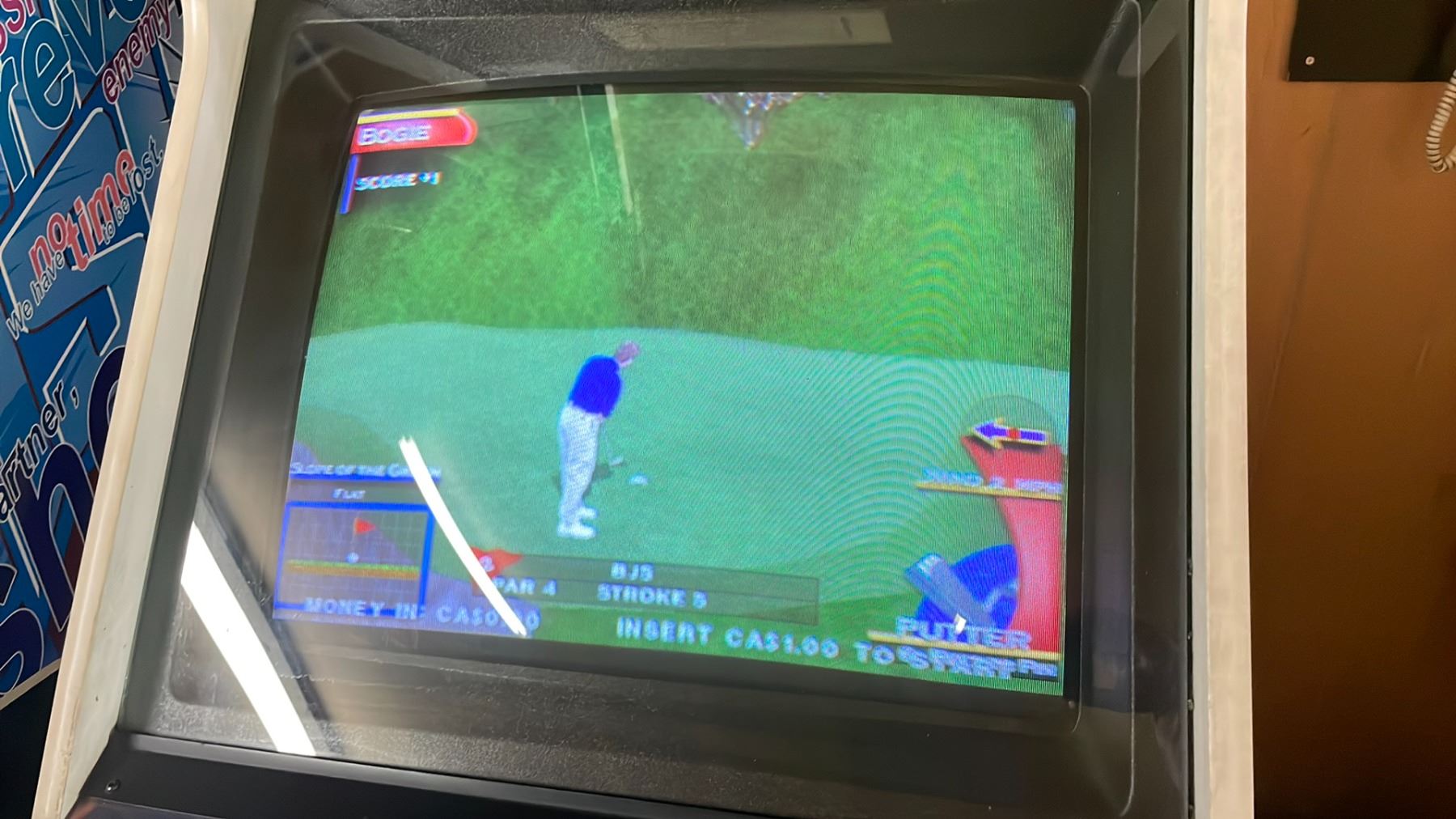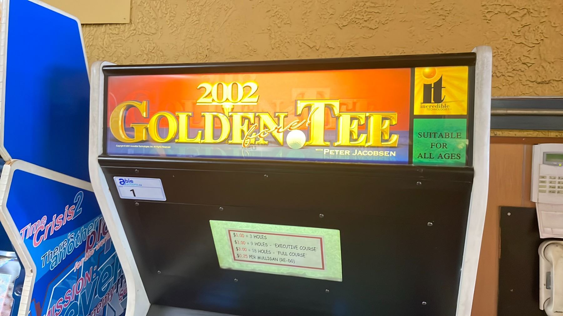 INCREDIBLE TECHNOLOGIES 2002 GOLDEN TEE FORE! SINGLE PERSON COIN OPERATED UPRIGHT ARCADE GAME IN GT FORE! CABINET WITH MANUALS