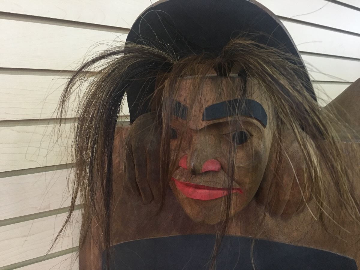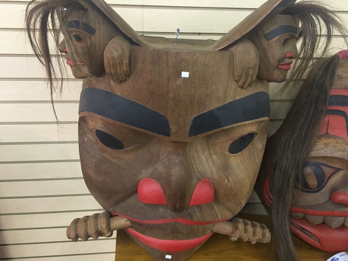 INDONESIAN CARVED REPLICA B.C. FIRST NATIONS TEAK MASKS BY F. FENCEPOST, 32'' H