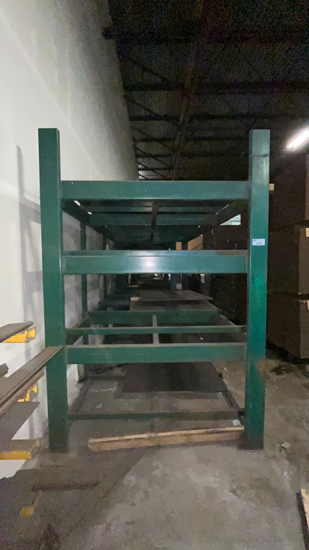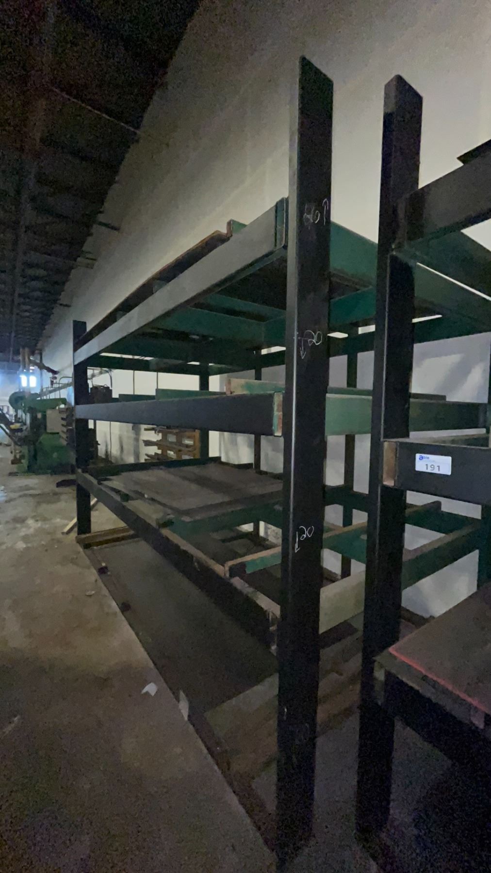 INDUSTRIAL 3 TIER HEAVY DUTY MATERIAL RACKING ( APPROX 9'H X 11'L X 7.5'D ) WITH CONTENTS INCLUDING ASSORTED STEEL FABRICATING SHEETS