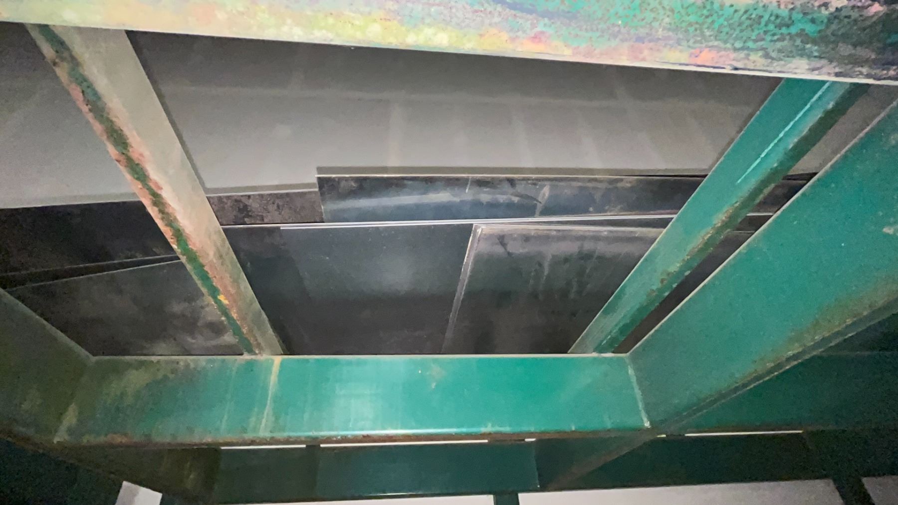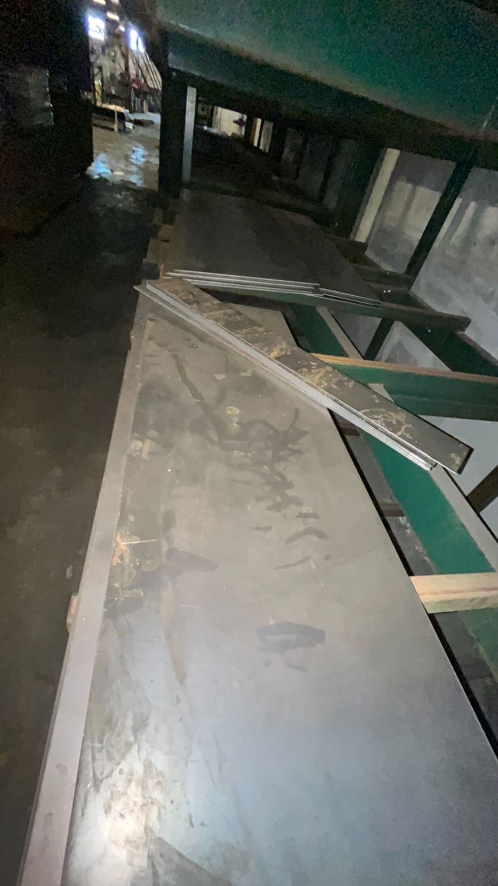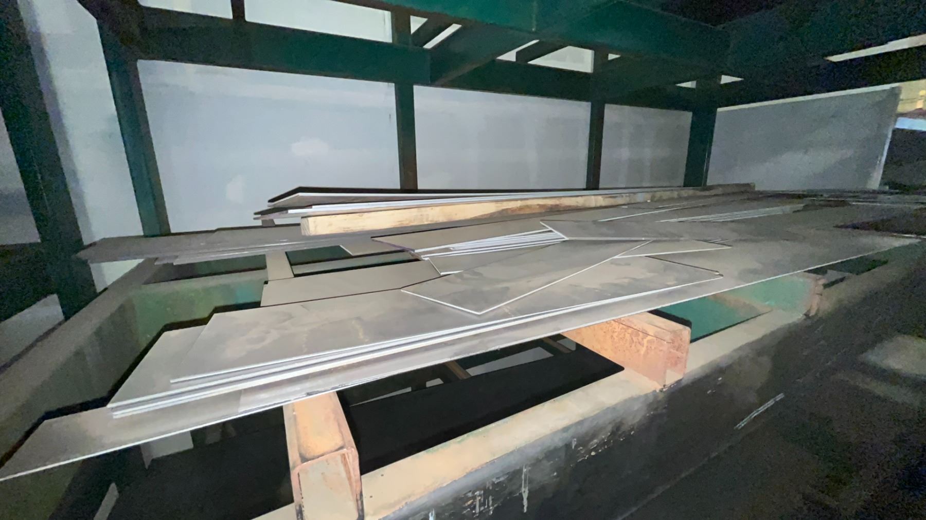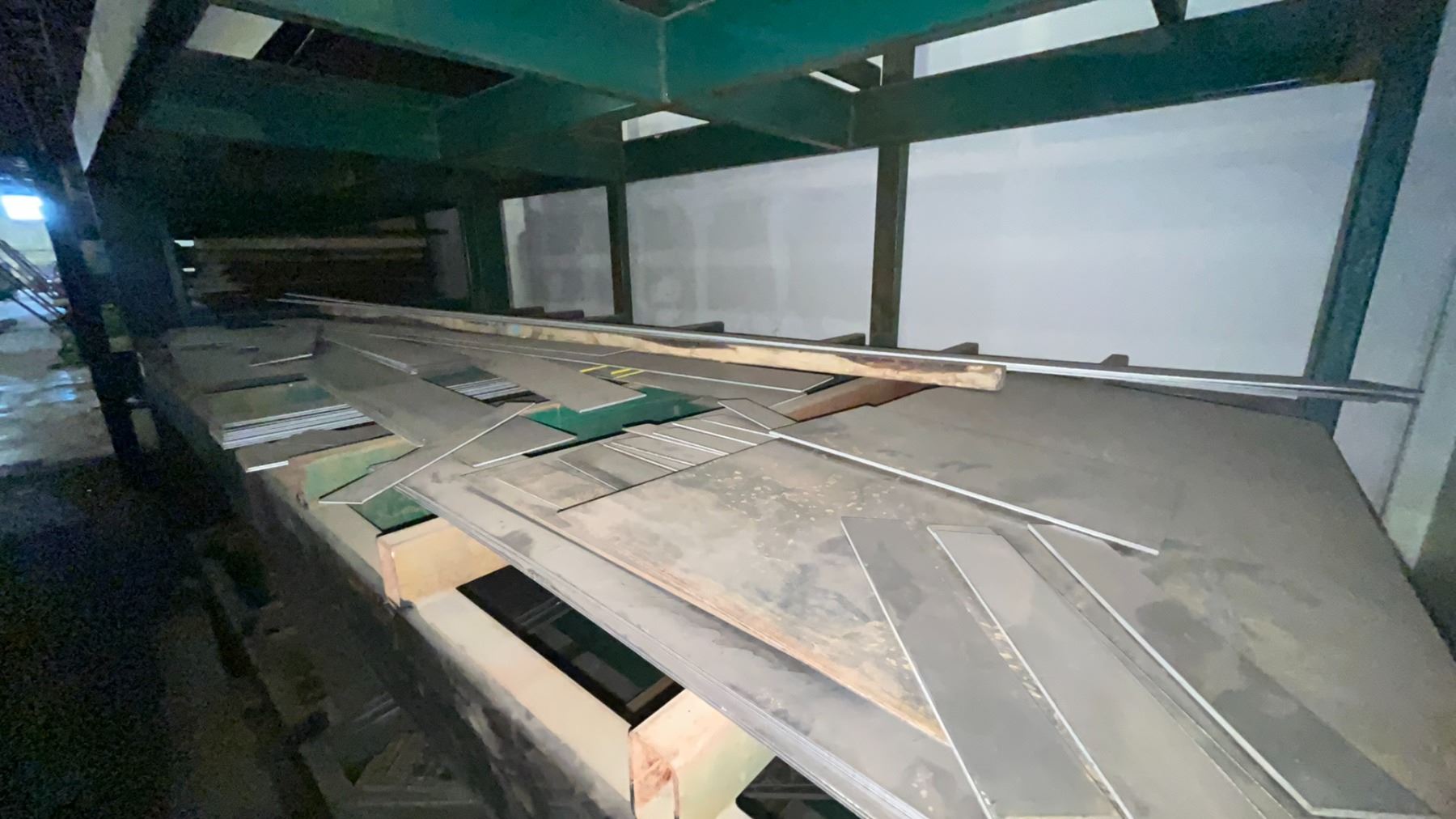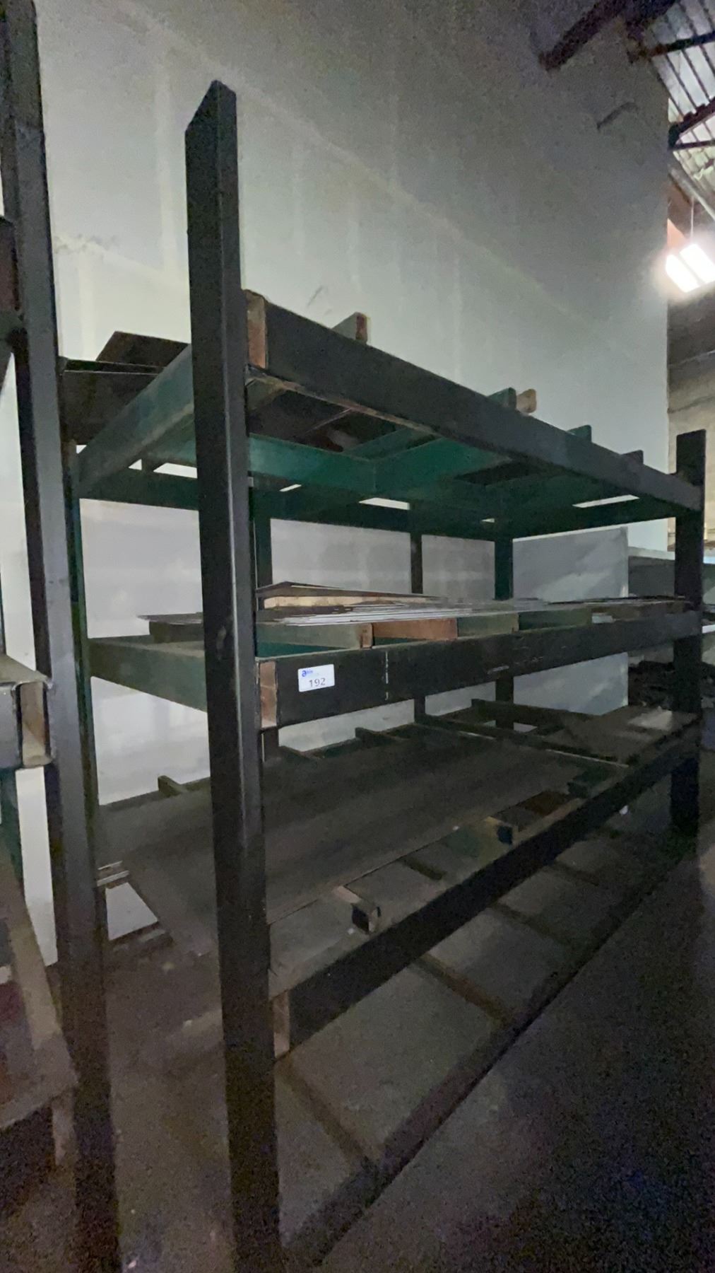 INDUSTRIAL 3 TIER HEAVY DUTY MATERIAL RACKING ( APPROX 9'H X 11'L X 7.5'D ) WITH CONTENTS INCLUDING ASSORTED STEEL FABRICATING SHEETS