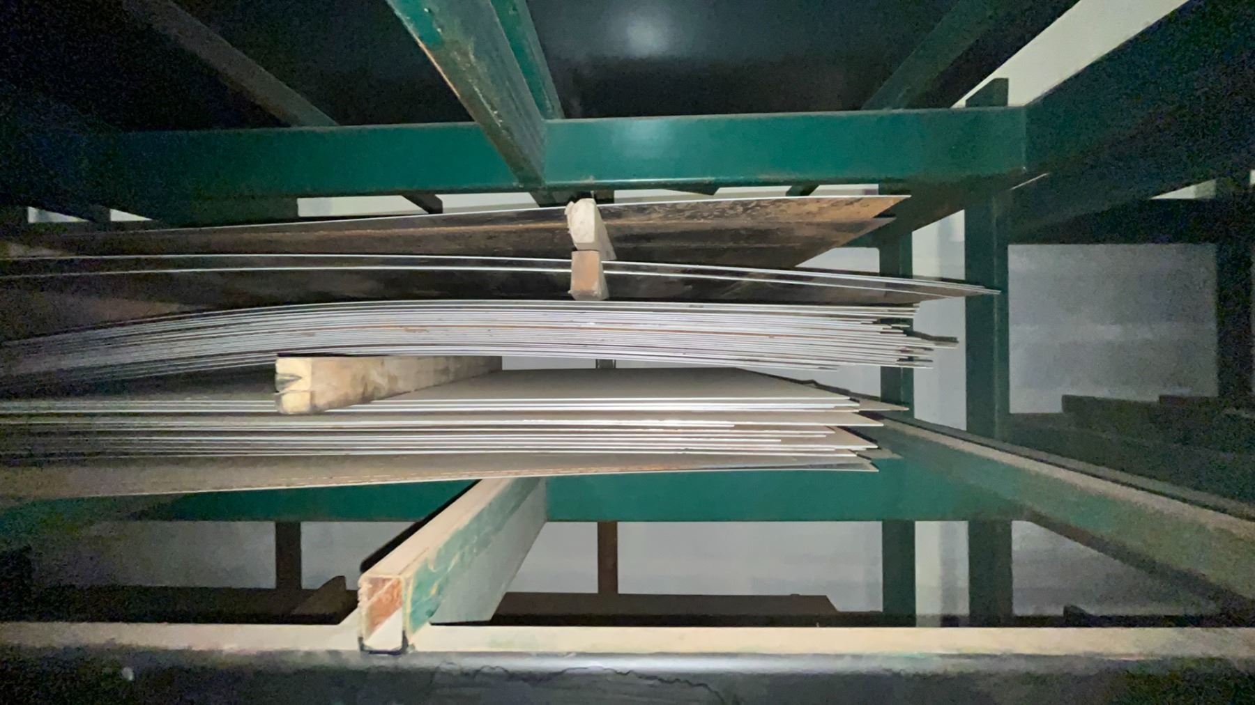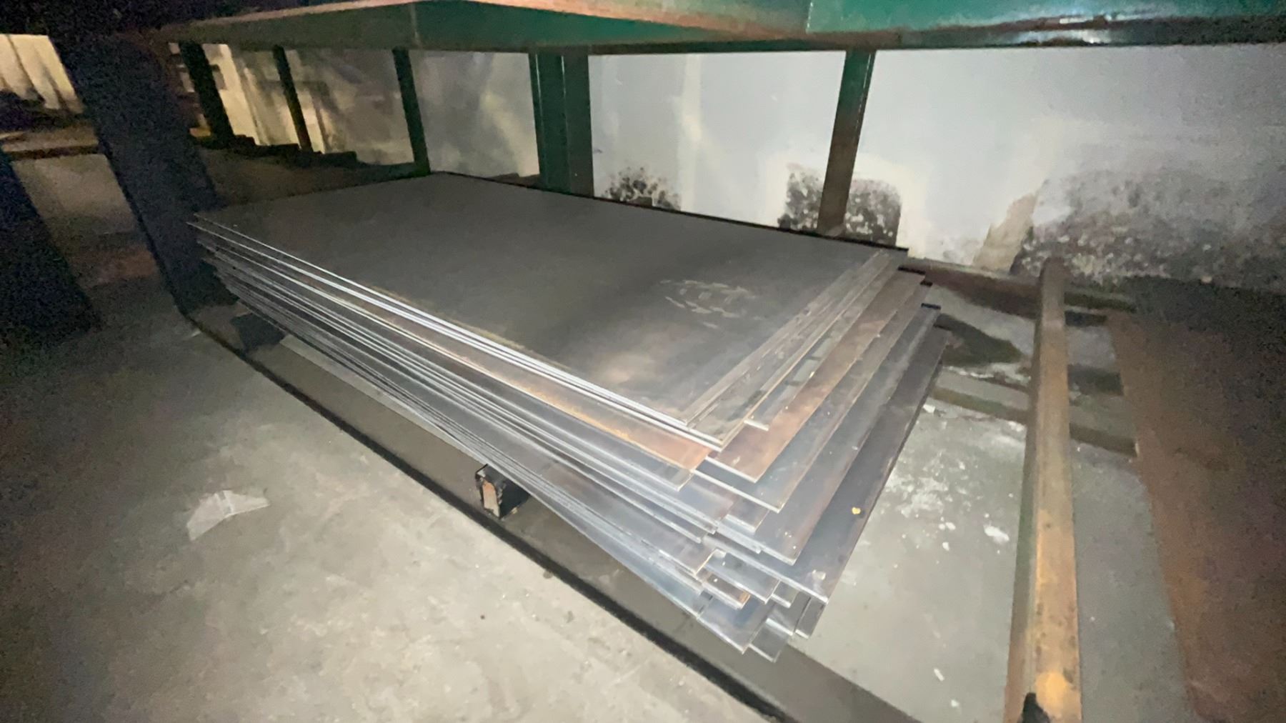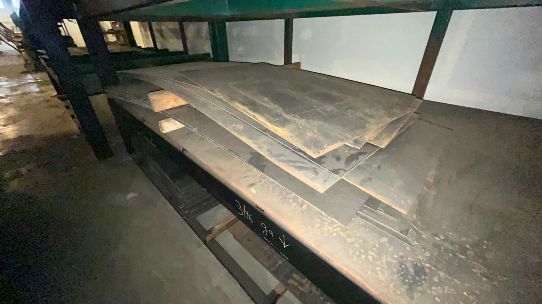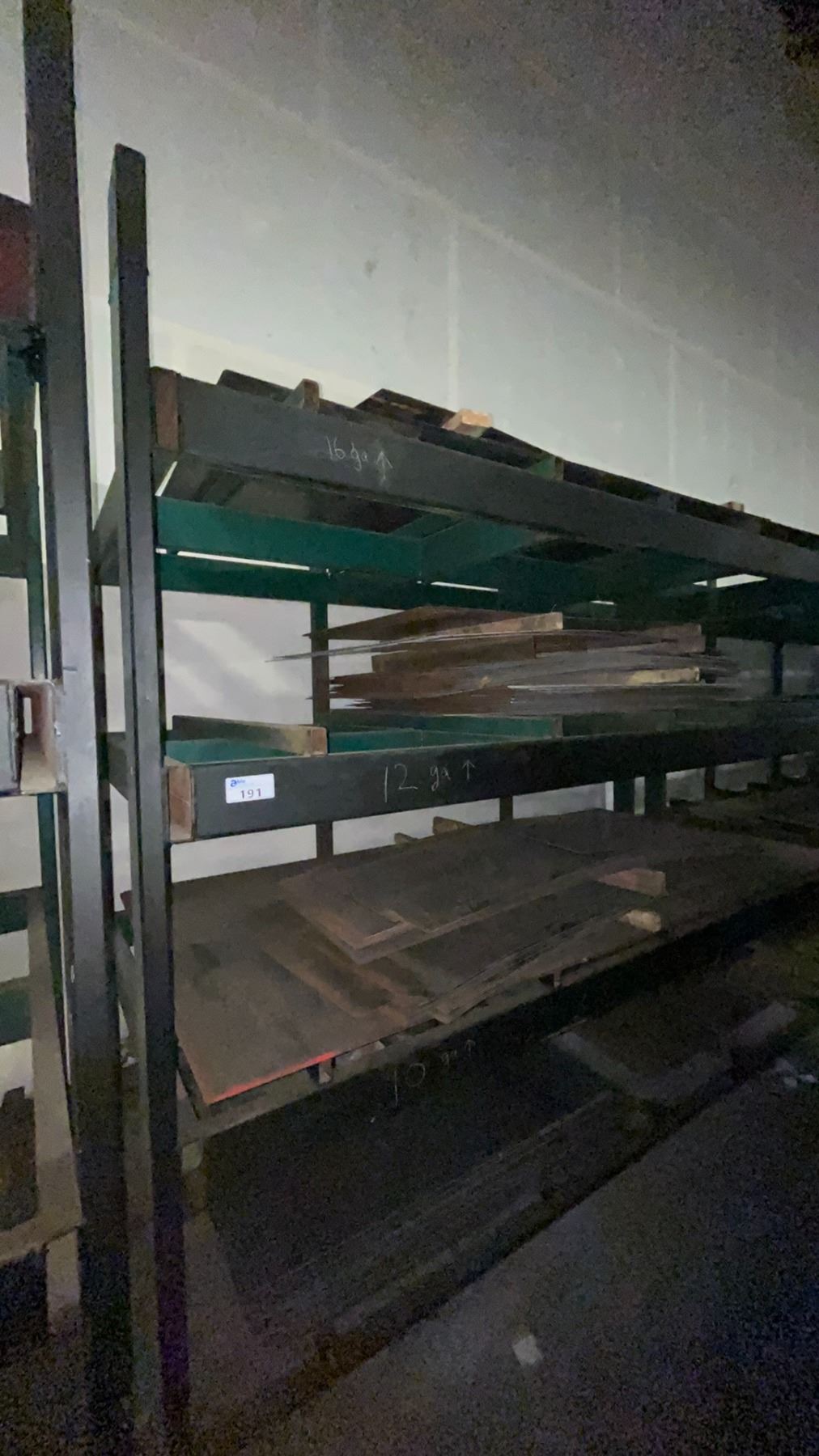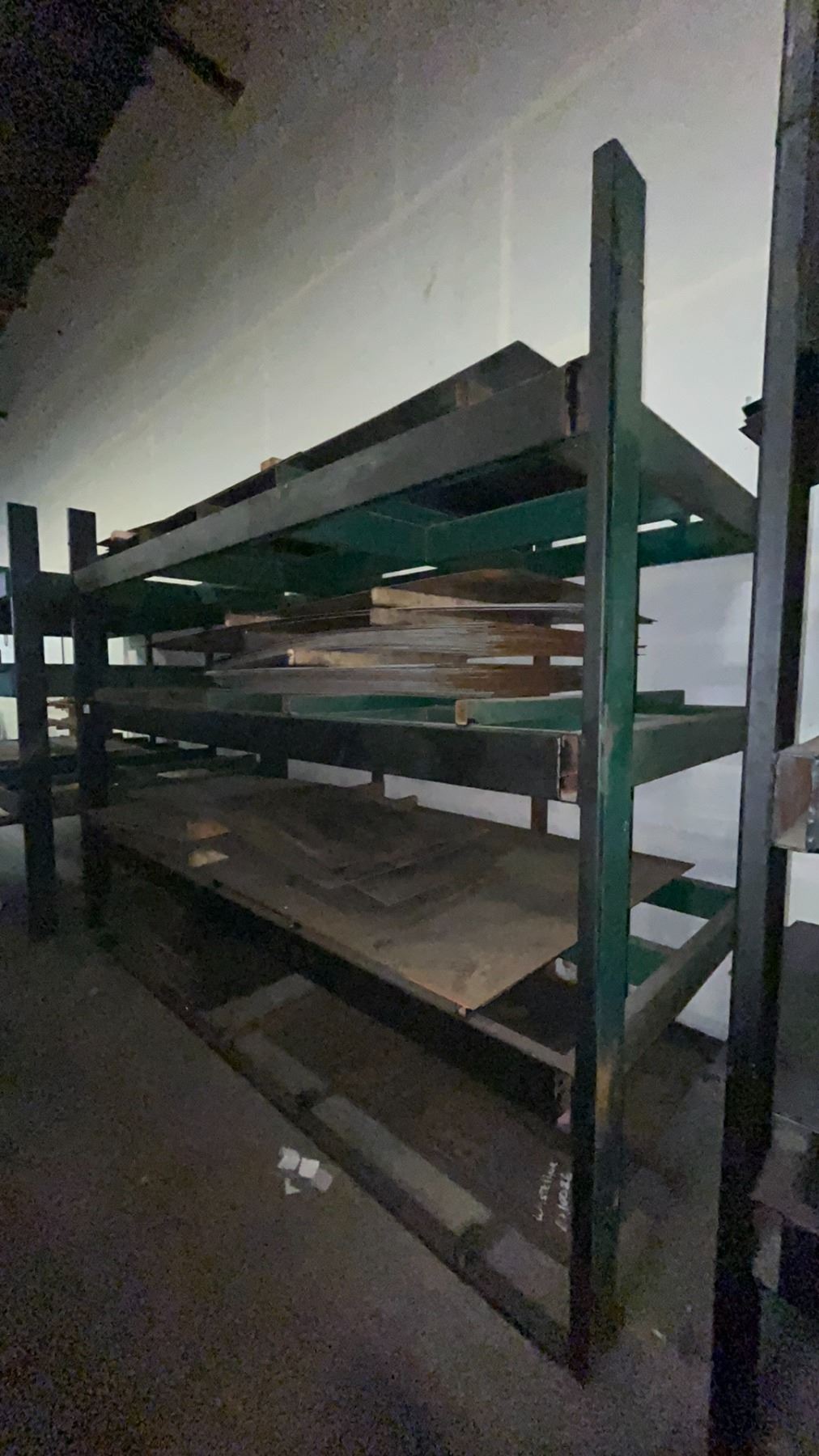 INDUSTRIAL 3 TIER HEAVY DUTY MATERIAL RACKING ( APPROX 9'H X 11'L X 7.5'D ) WITH CONTENTS INCLUDING ASSORTED STEEL FABRICATING SHEETS