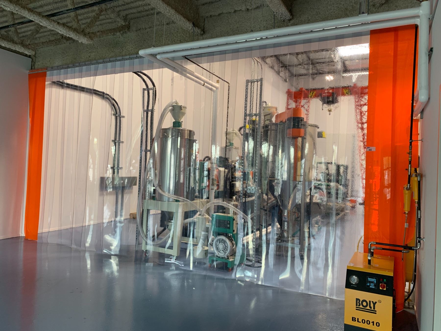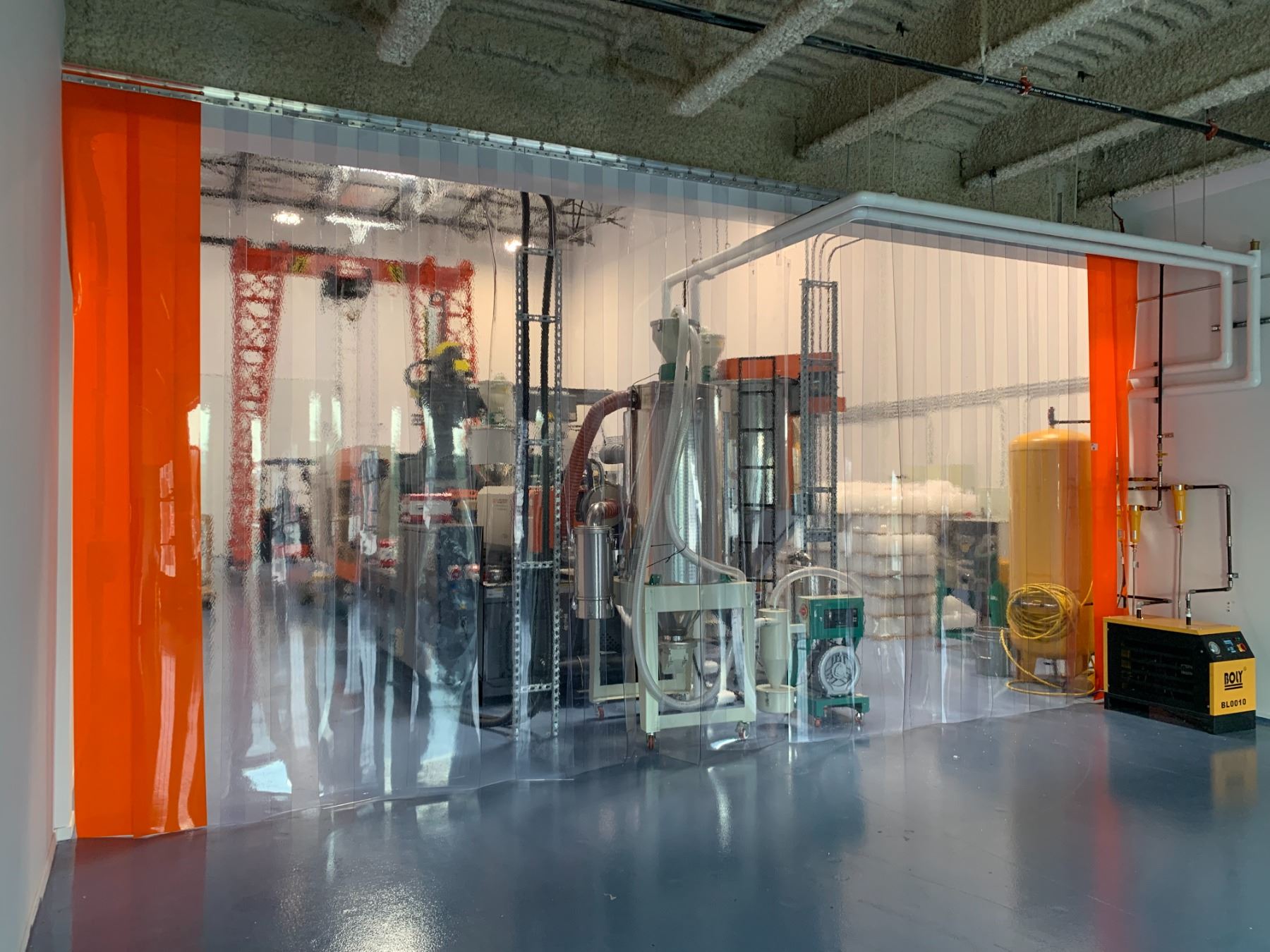 *INDUSTRIAL CLEAR PLASTIC WALK THROUGH ROOM DIVIDER - APPROX. 20FT ACROSS X 11FT HIGH *REQUIRES 12FT LADDER, POWER TOOLS AND MANPOWER FOR REMOVAL*