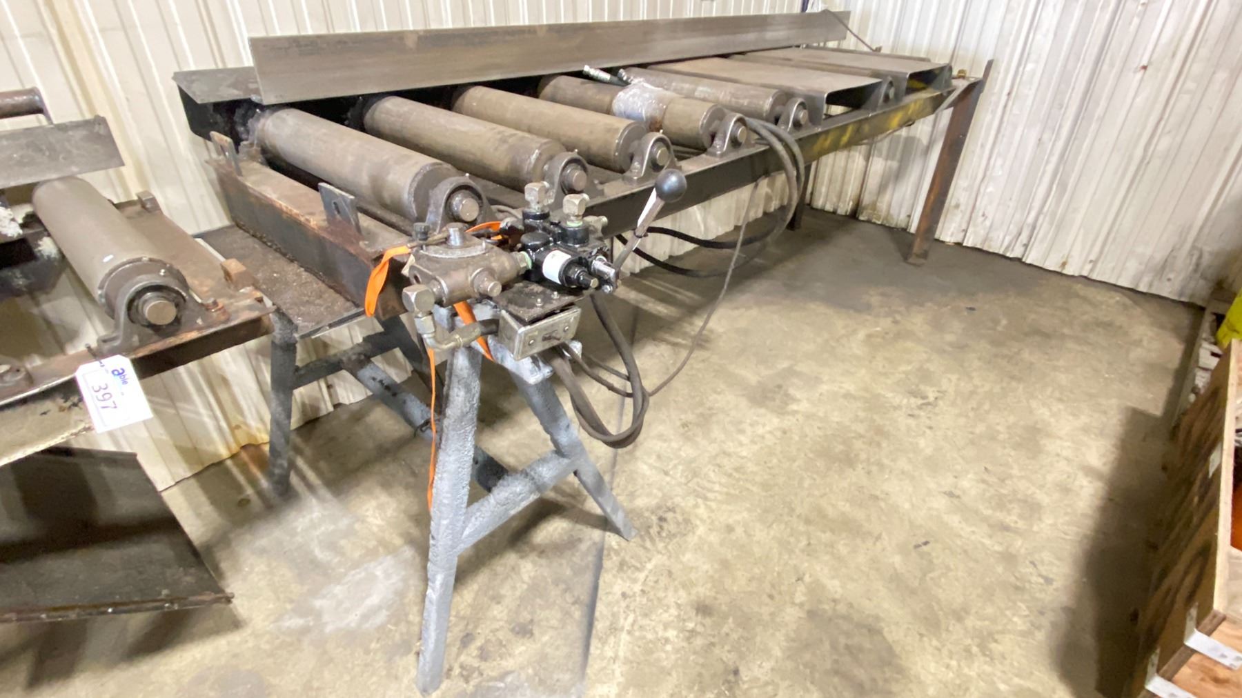 INDUSTRIAL HEAVY DUTY ROLLER CONVEYOR WITH HYDRAULIC CONTROL UNIT SINGLE SIDE WITH METAL SAWHORSE APPROX 10'W X 3.5'D X 3.9'H