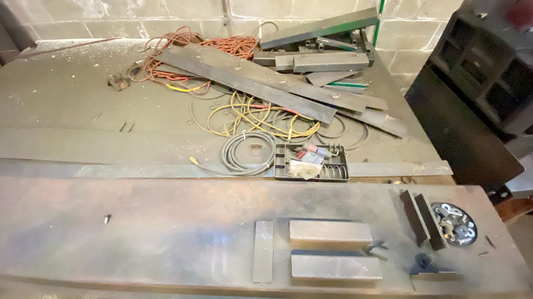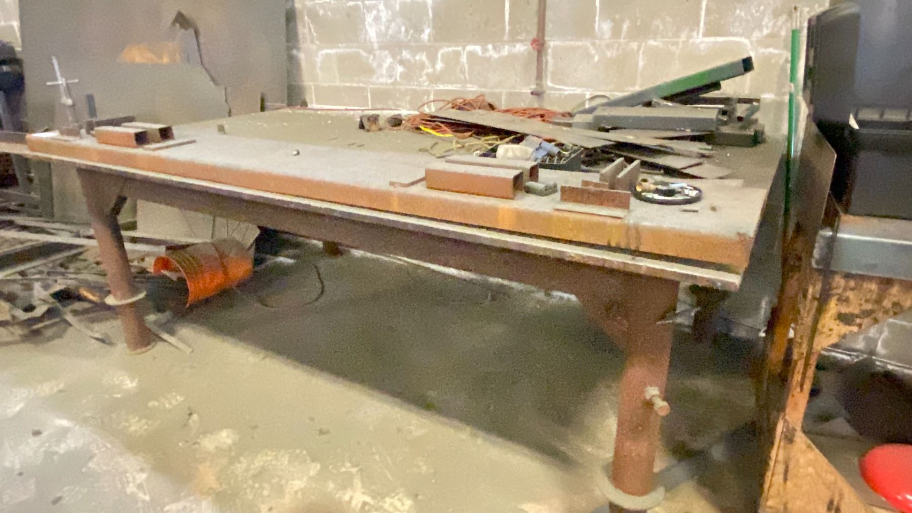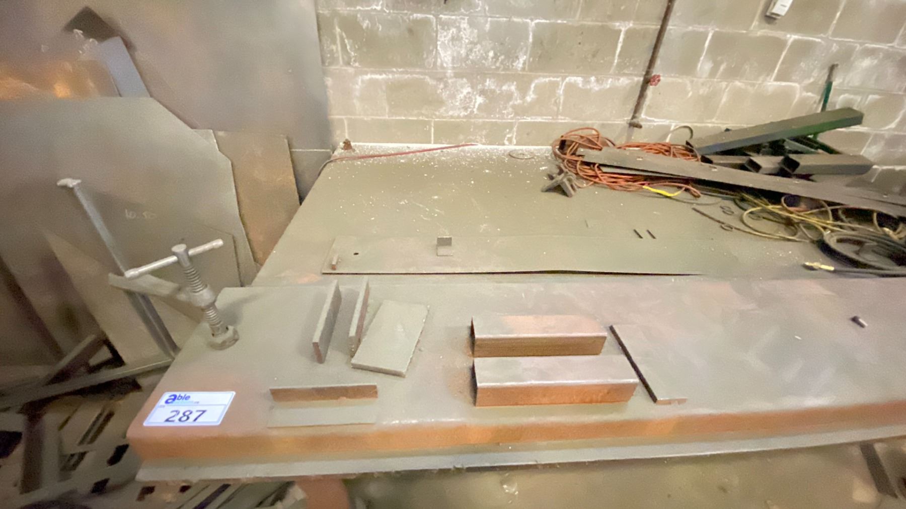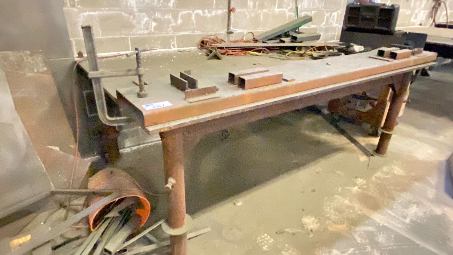INDUSTRIAL METAL SHOP/WELDERS TABLE WITH CONTENTS APPROX 8' W X 5' D X 2.10' H - TABLE TOP APPROX 1" THICK