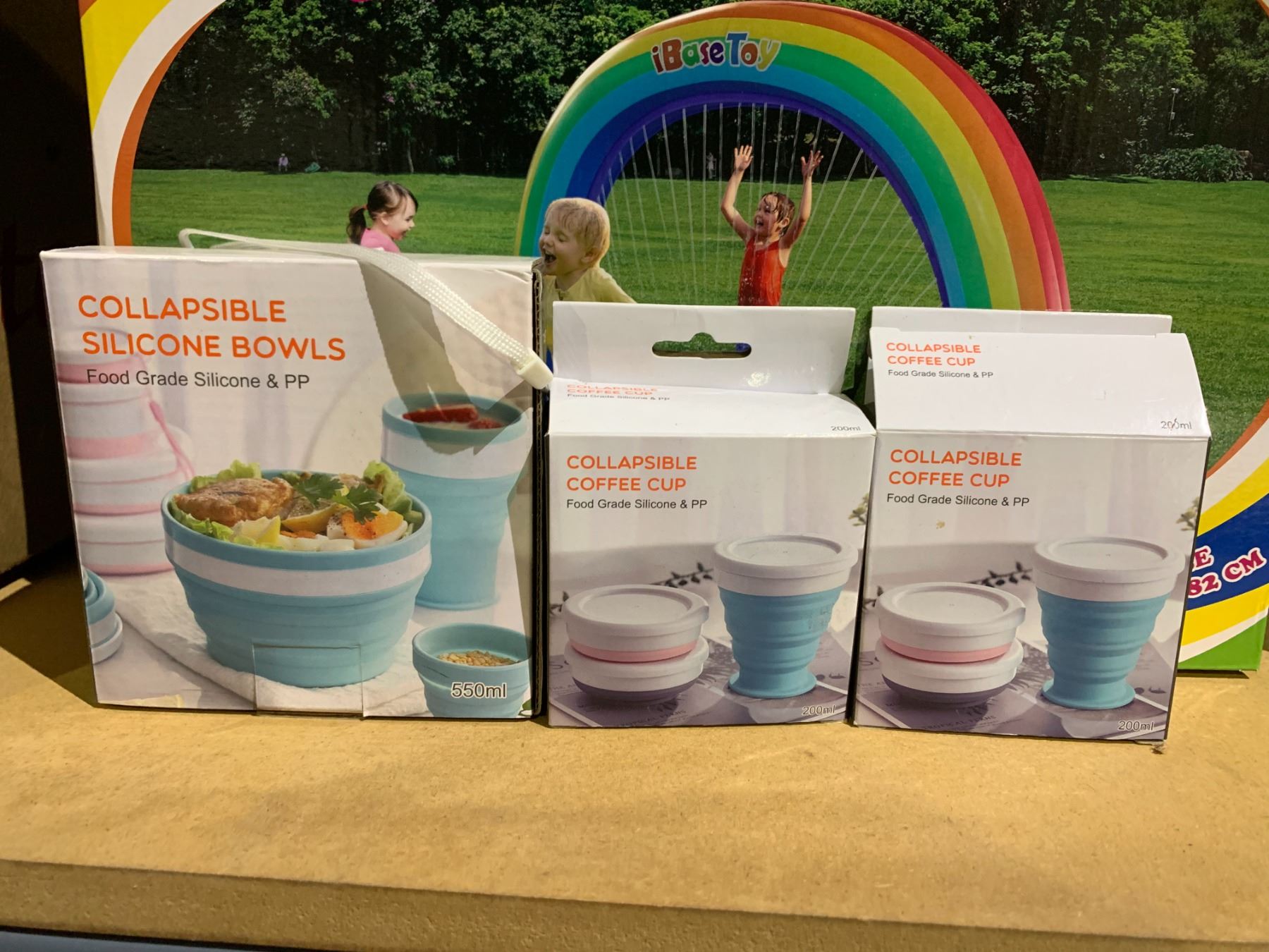 INFLATABLE RAINBOW SPRINKLER AND COLLAPSIBLE COFFEE CUPS