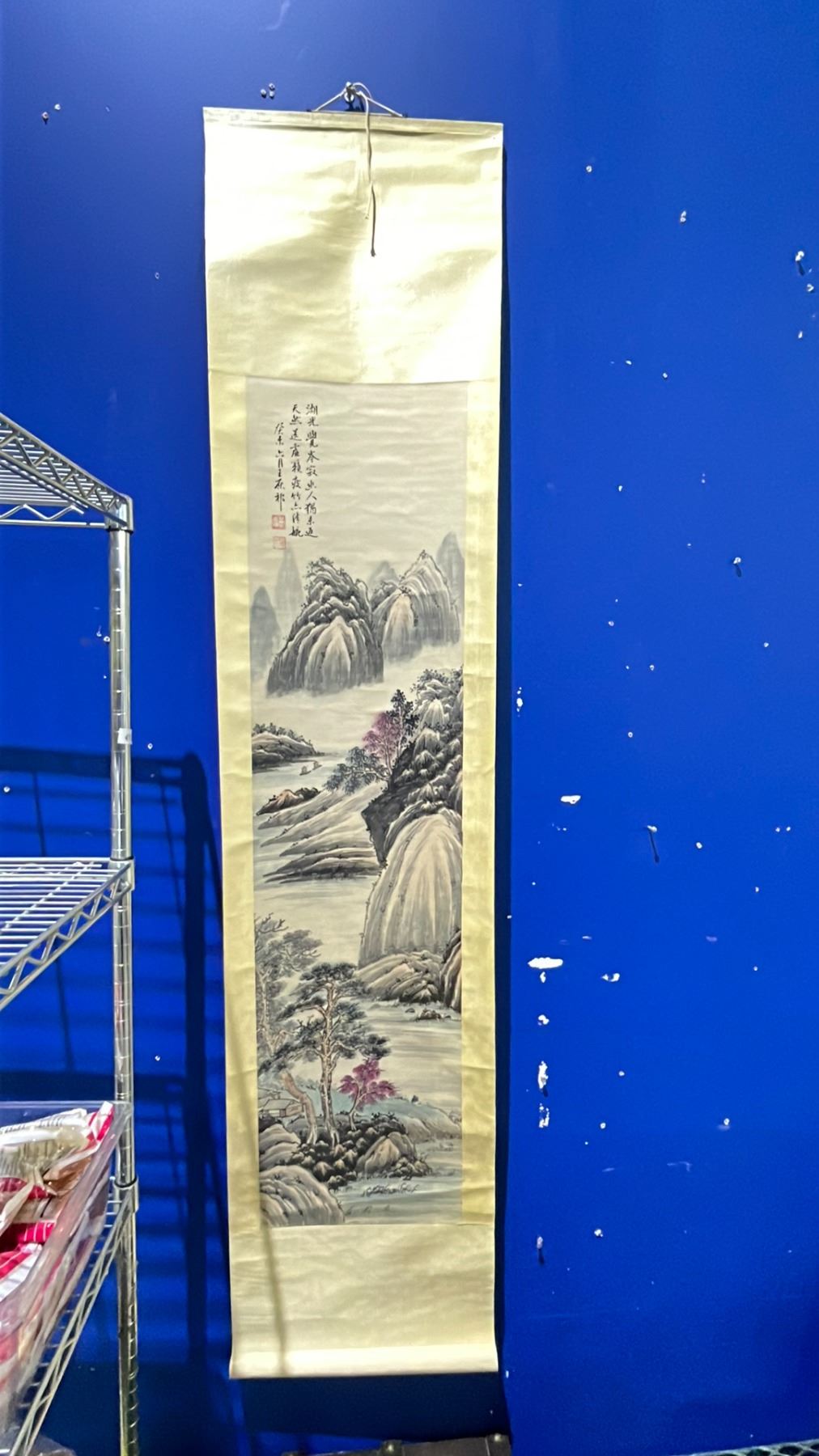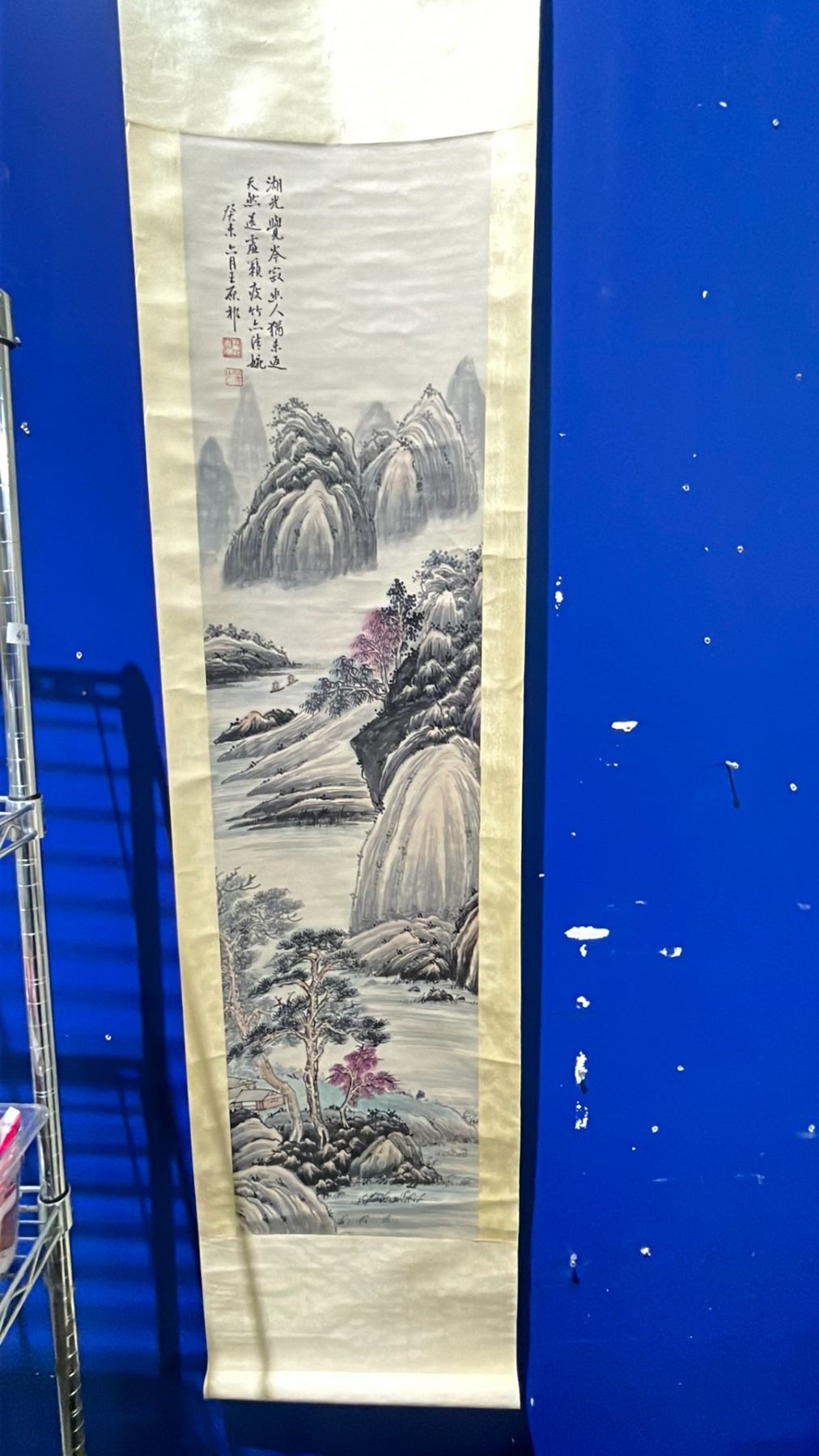 INK AND COLOUR ON PAPER HANGING SCROLL PAINTING