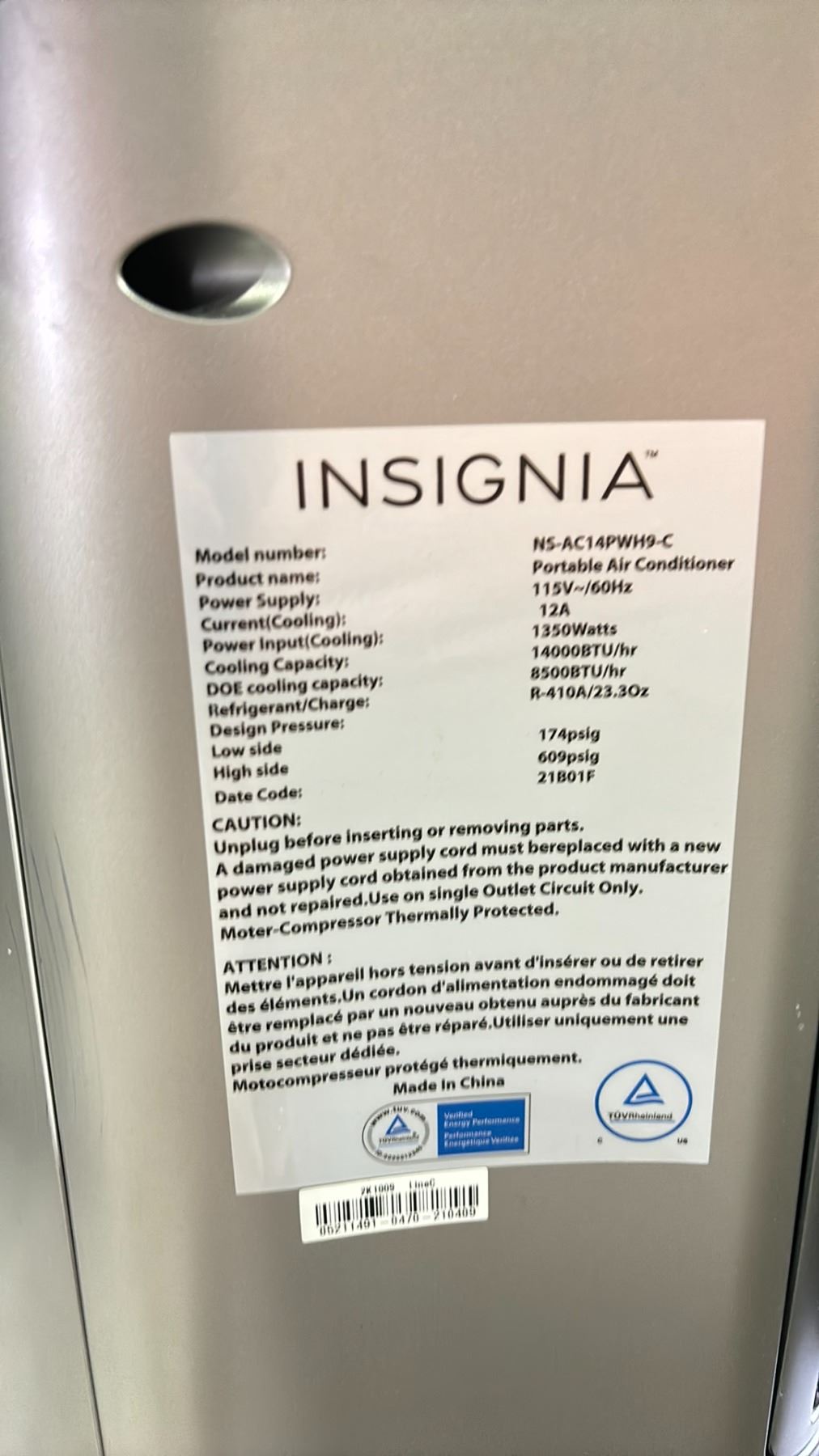 INSIGNIA 14000 BTU PORTABLE AIR CONDITIONER (NO HOSE, NO REMOTE)