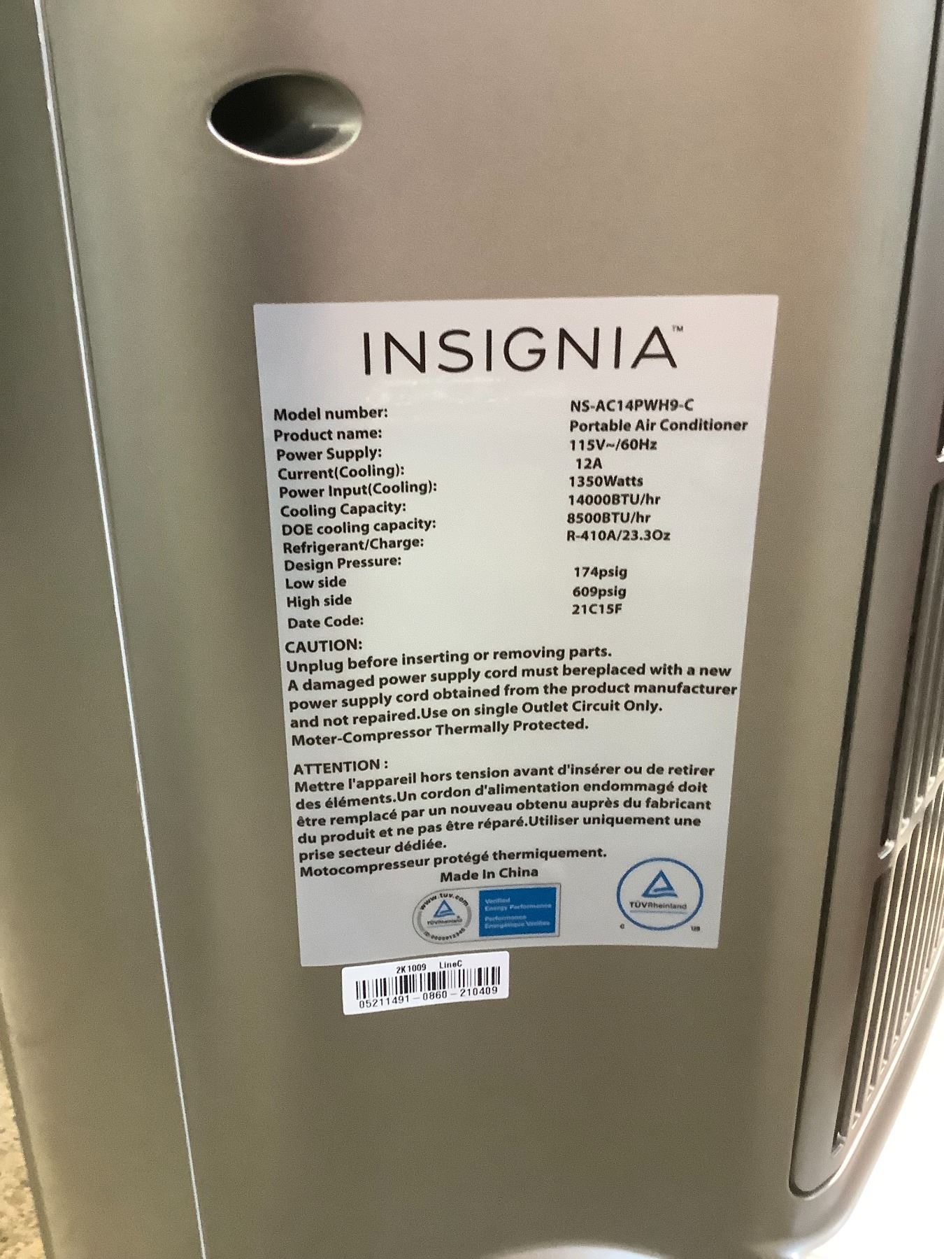 INSIGNIA PORTABLE AIR CONDITIONER 14,000 BTU (TESTED WORKING, NO HOSES, BLOWING COLD, NEEDS FAN REPAIR)