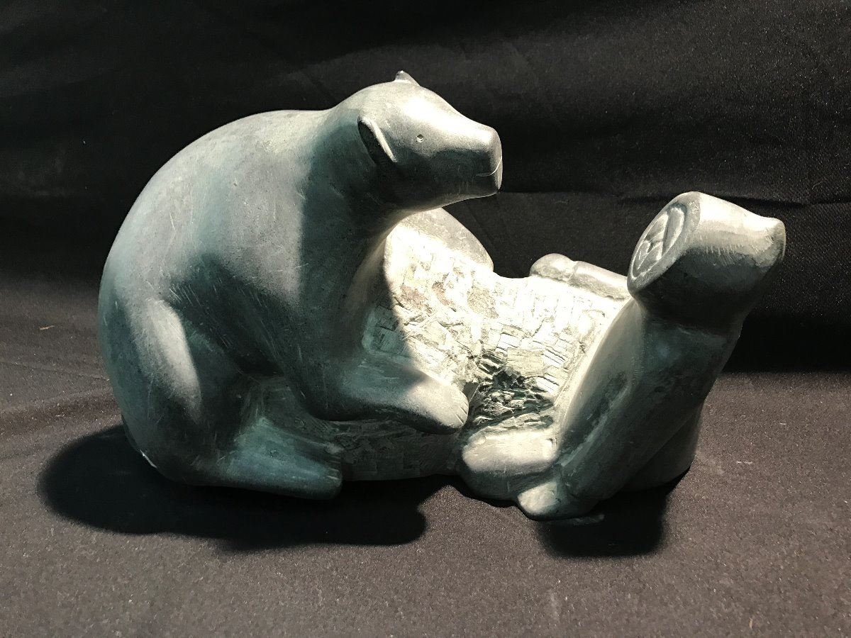 INUIT CARVED SOAPSTONE SCULPTURE 'INUIT AND ANIMALS' BY J. SIAKALUK OF HALL BEACH