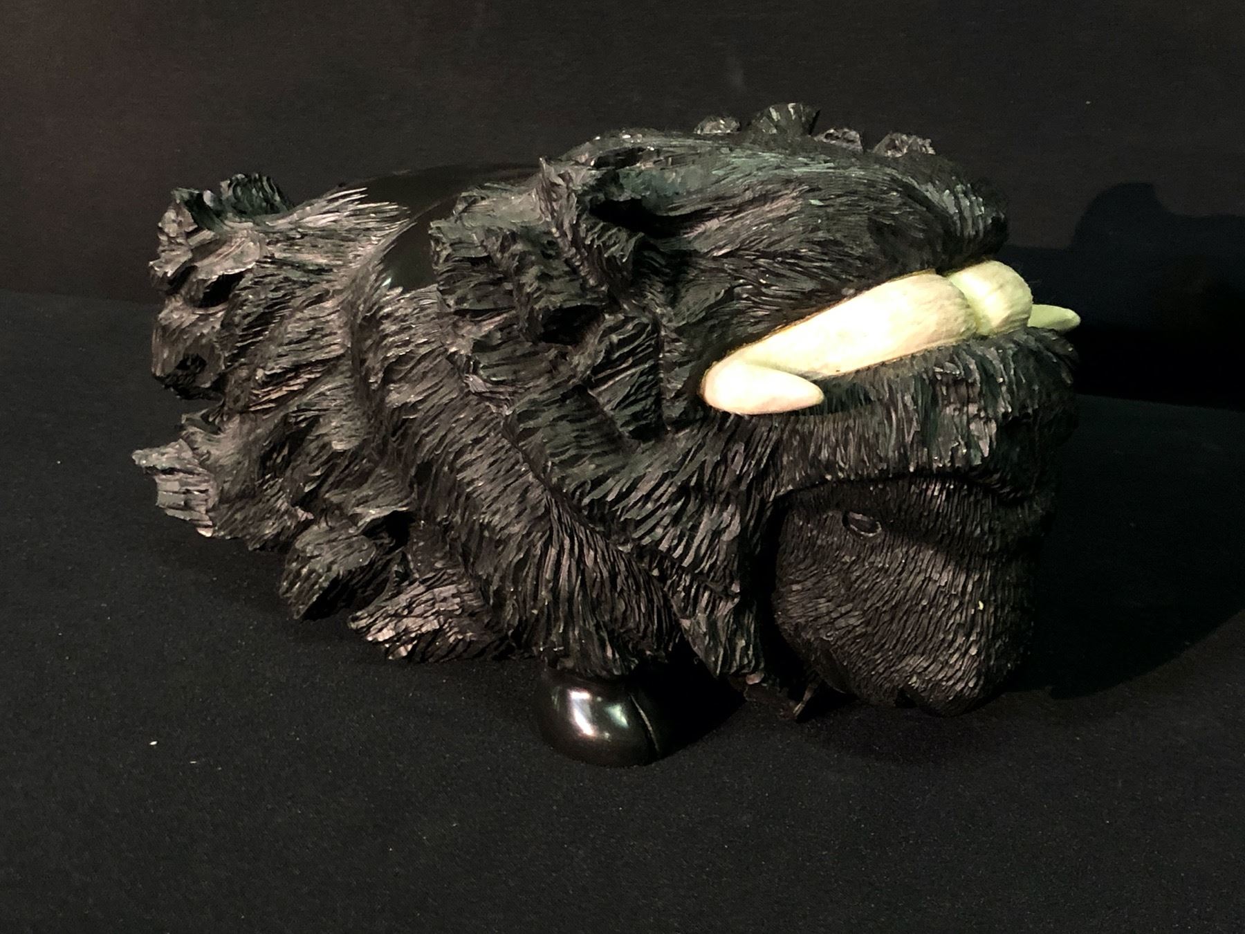 INUVIK, NORTH WEST TERRITORIES NATIVE SOAP STONE MUSK OX CARVING, BY "IYAK", 1997, SIGNED BY ARTIST ON BOTTOM, 11" LONG
