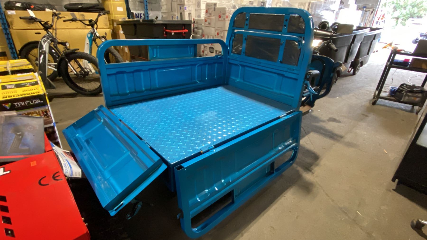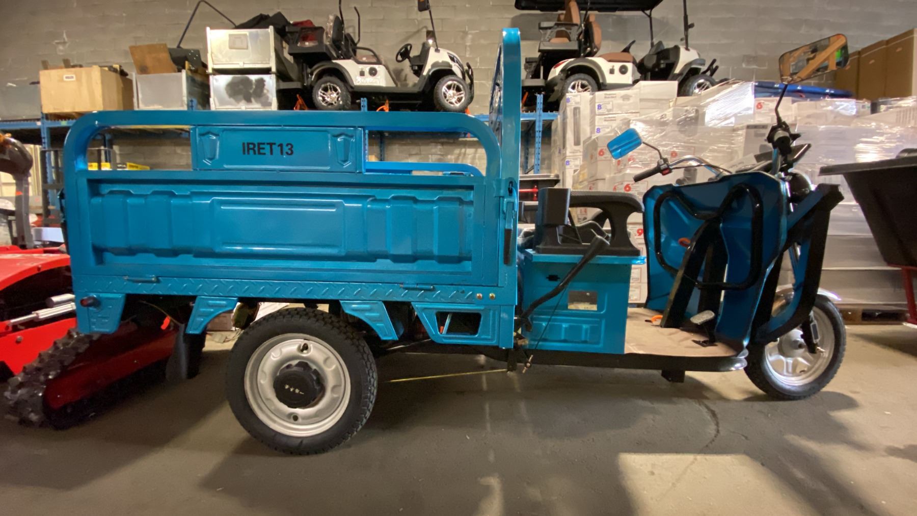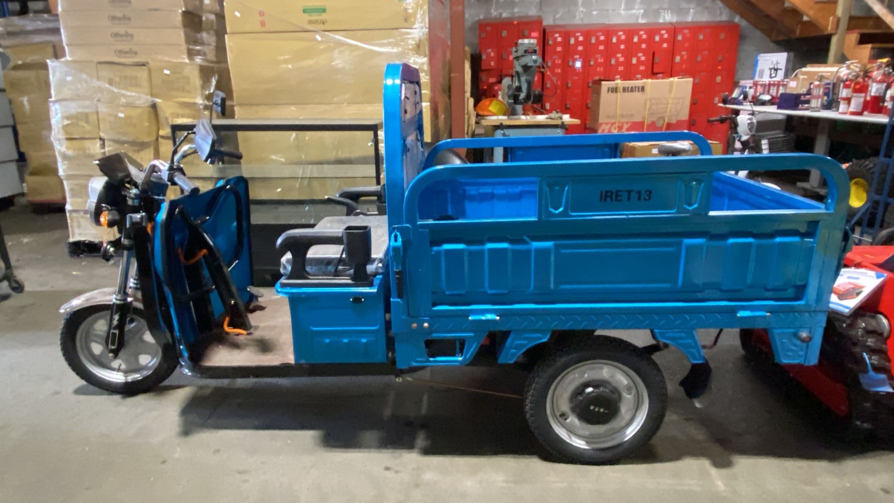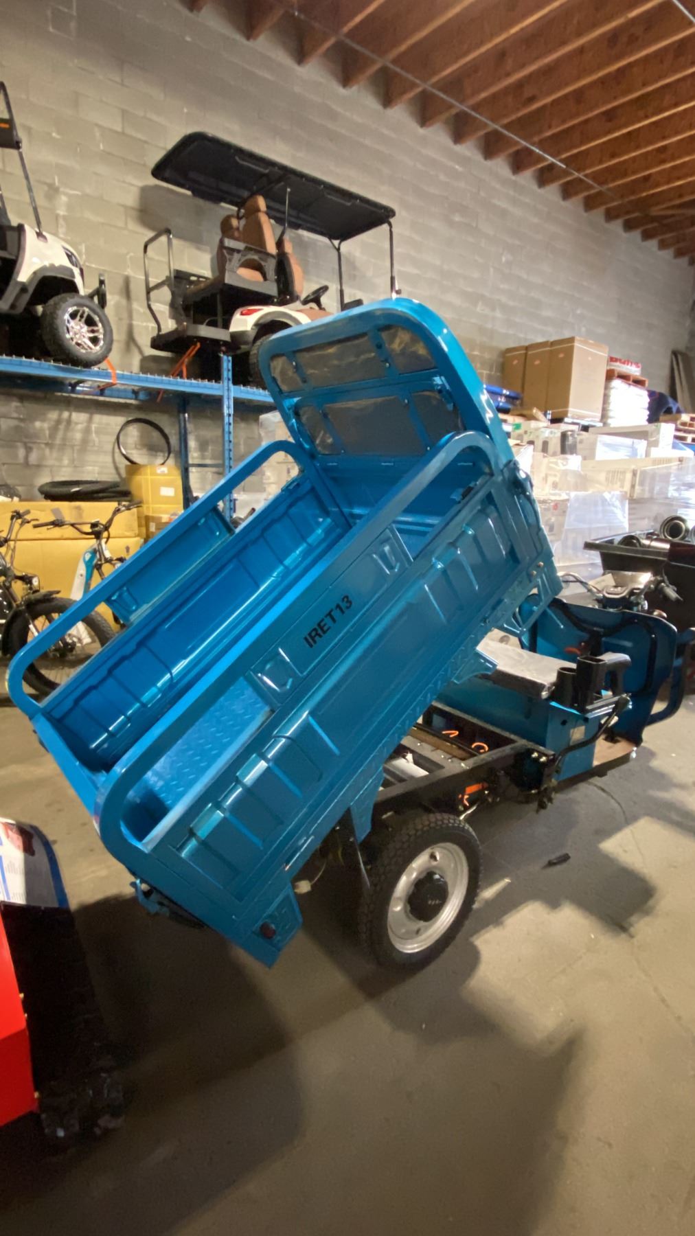 IRANCH IRET13 HIGH END 800W ELECTRIC TRICYCLE WITH DROP SIDE MANUAL DUMP BED *COLOUR BLUE* LED LIGHTING, PNEUMATIC TIRES, 3 SPEED ADJUSTABLE SYSTEM, 15-30 MPH TOP SPEED, LCD DIGITAL DISPLAY *HAS KEYS, HAS CHARGER-DISMANTLED READY FOR TRANSPORTATION* CRATE DIMENSION APPROX 94"L X 38"D X 24"H, WEIGHTS APPROX 450LBS