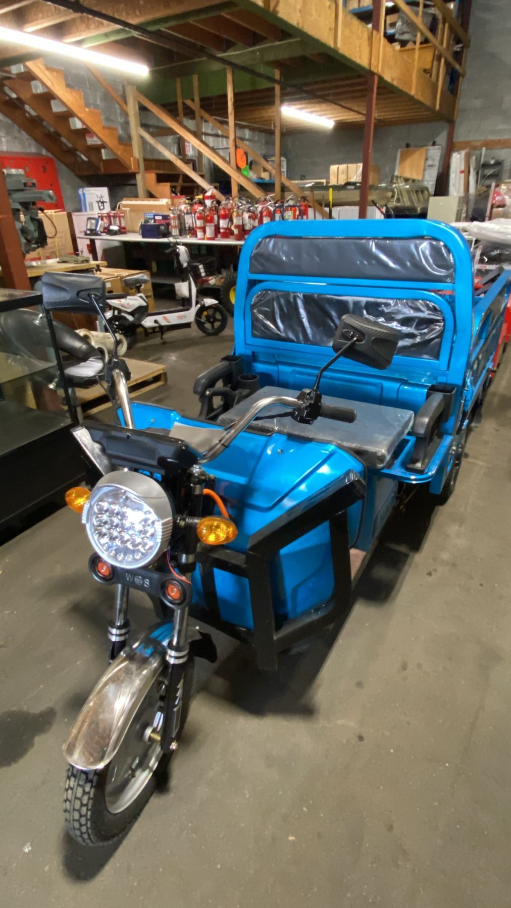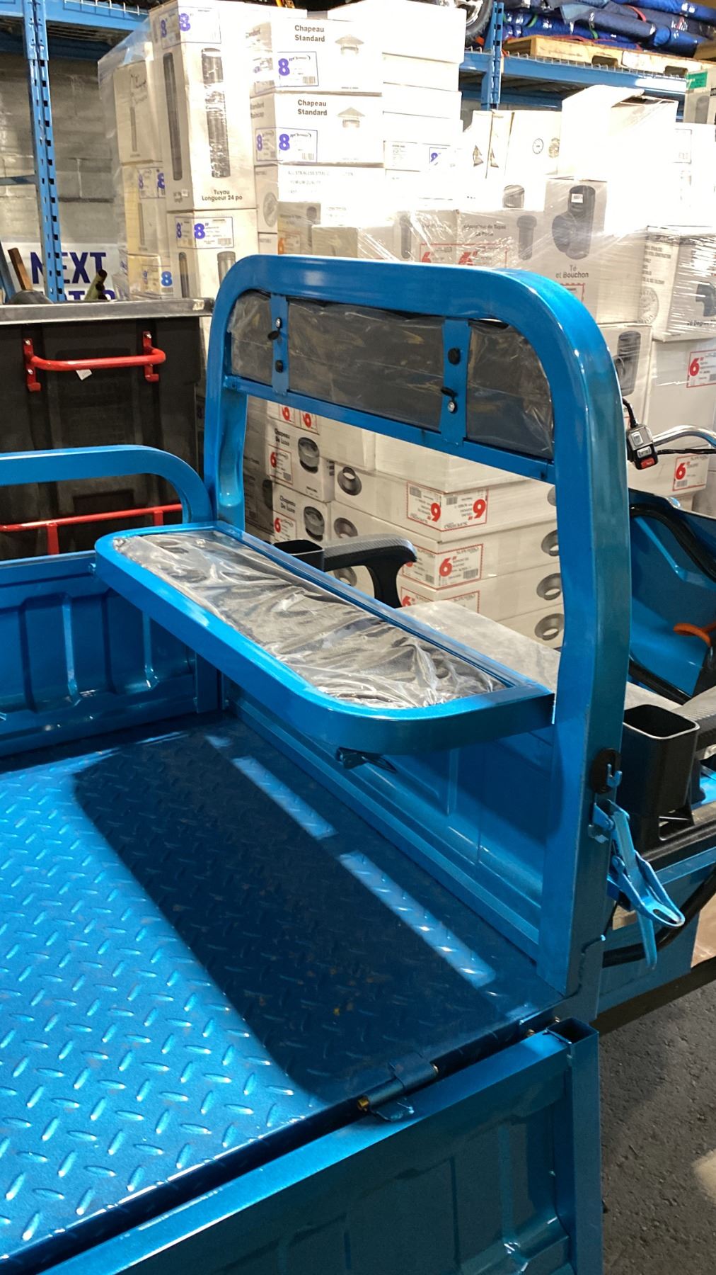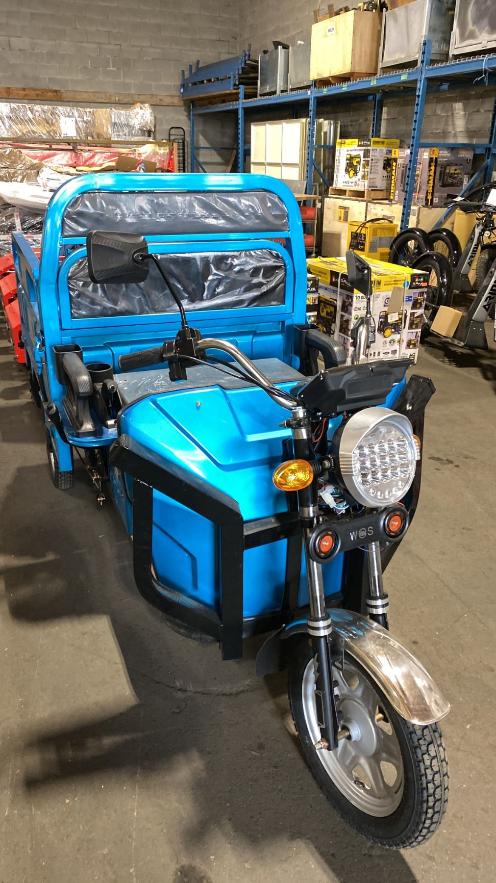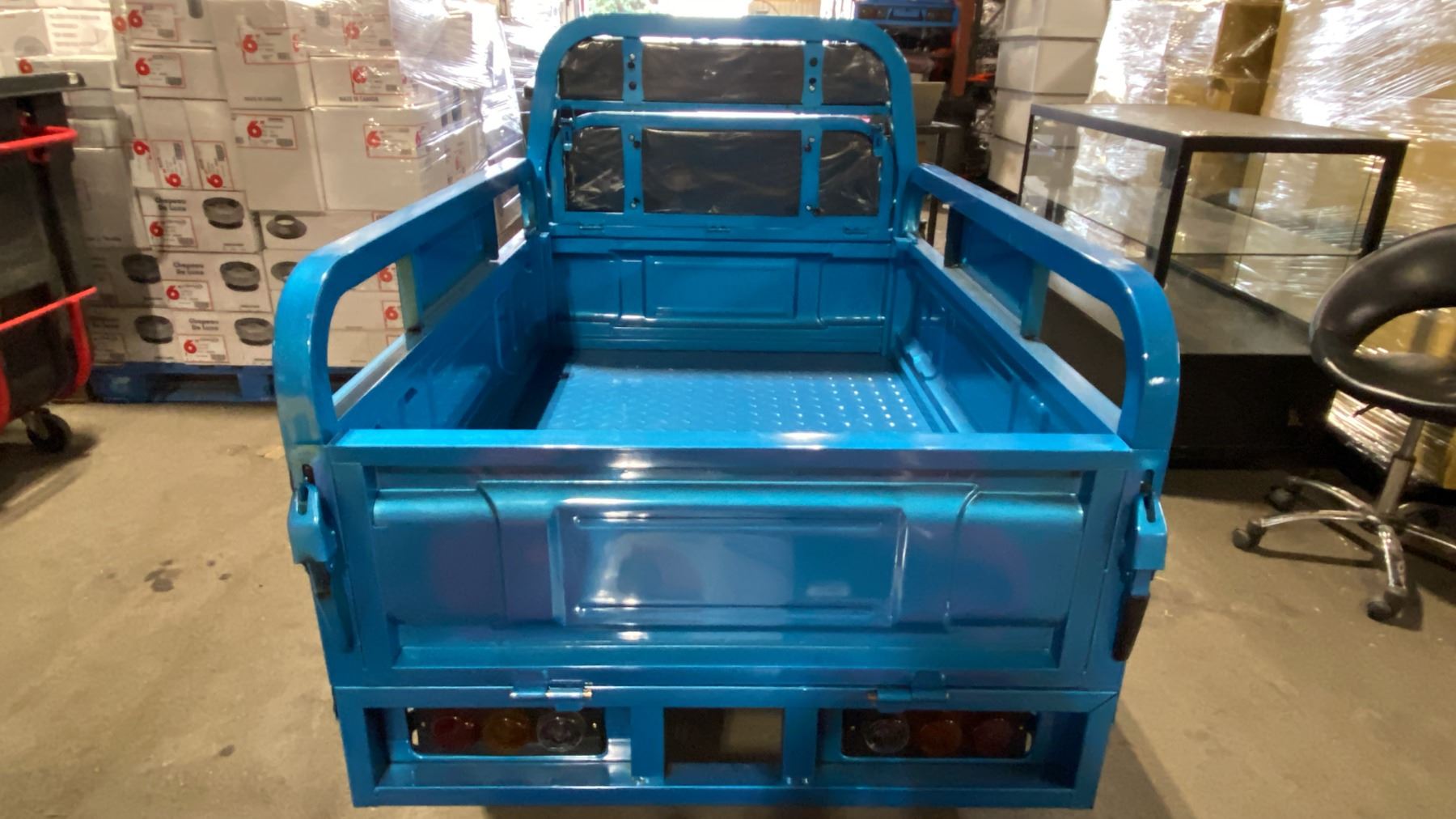 IRANCH IRET13 HIGH END 800W ELECTRIC TRICYCLE WITH DROP SIDE MANUAL DUMP BED *COLOUR BLUE* LED LIGHTING, PNEUMATIC TIRES, 3 SPEED ADJUSTABLE SYSTEM, 15-30 MPH TOP SPEED, LCD DIGITAL DISPLAY *HAS KEYS, HAS CHARGER-DISMANTLED READY FOR TRANSPORTATION* CRATE DIMENSION APPROX 94"L X 38"D X 24"H, WEIGHTS APPROX 450LBS